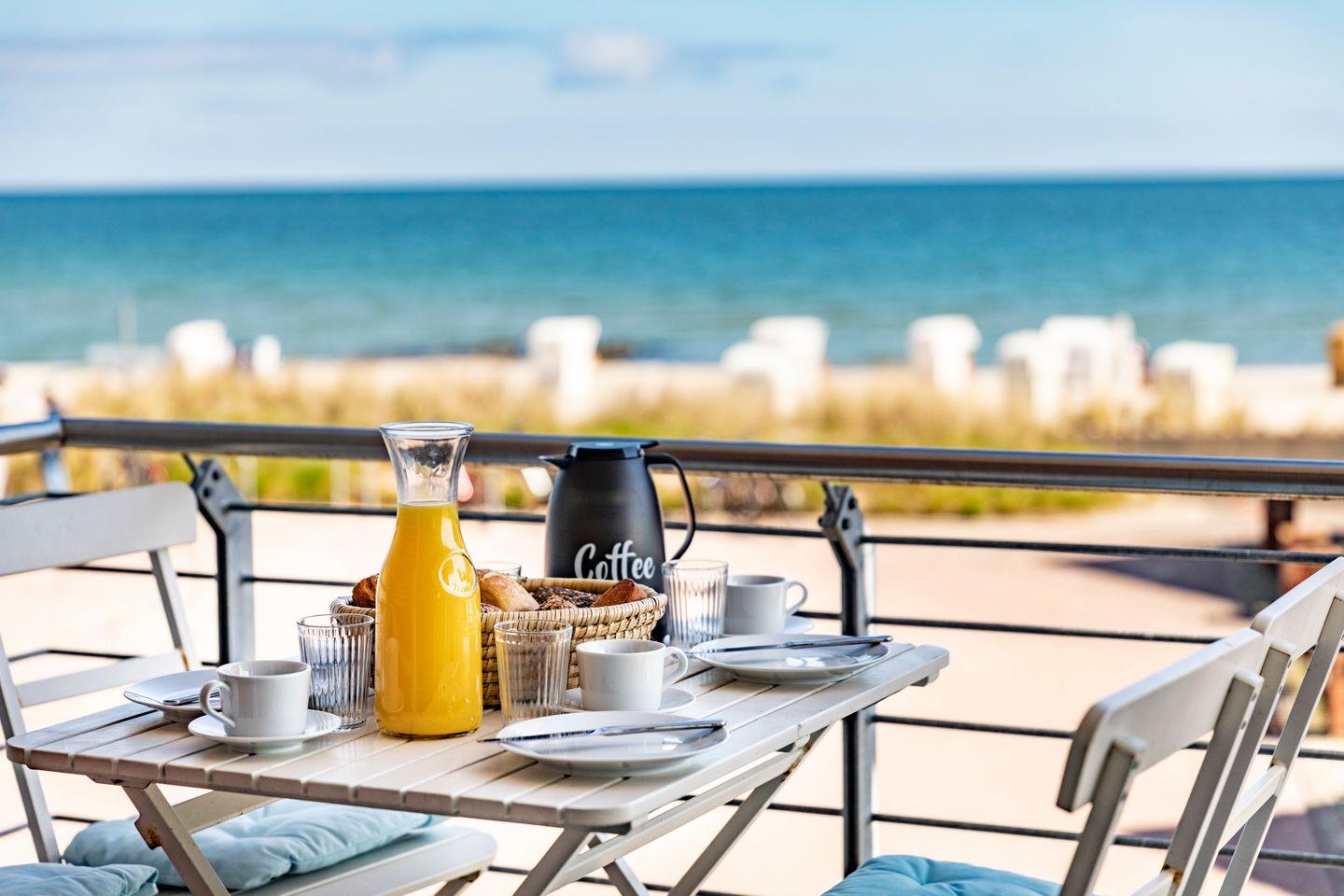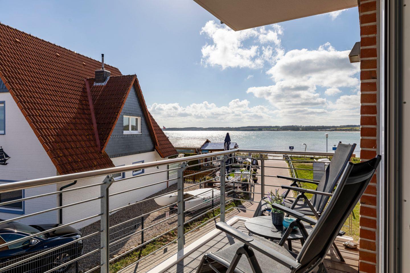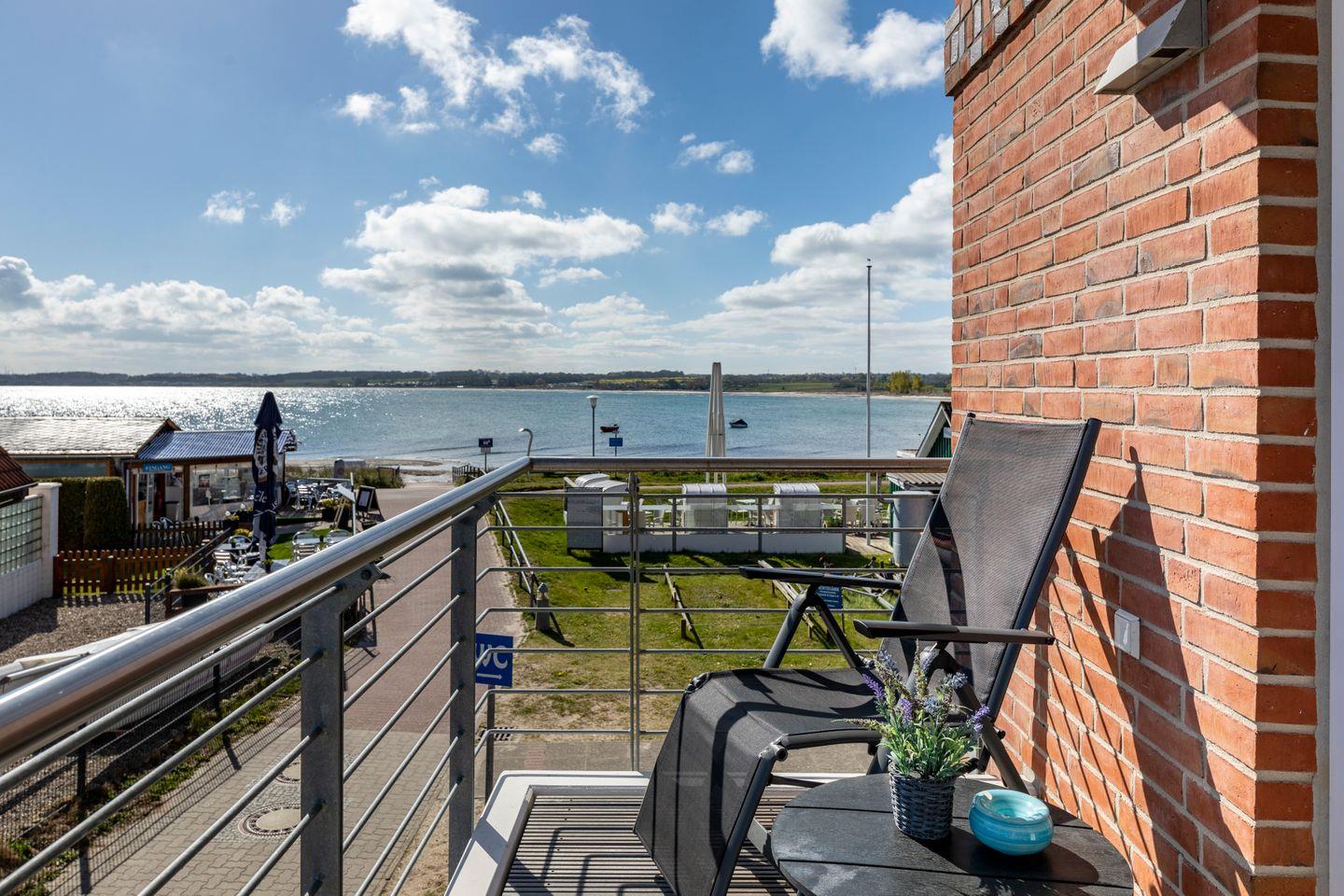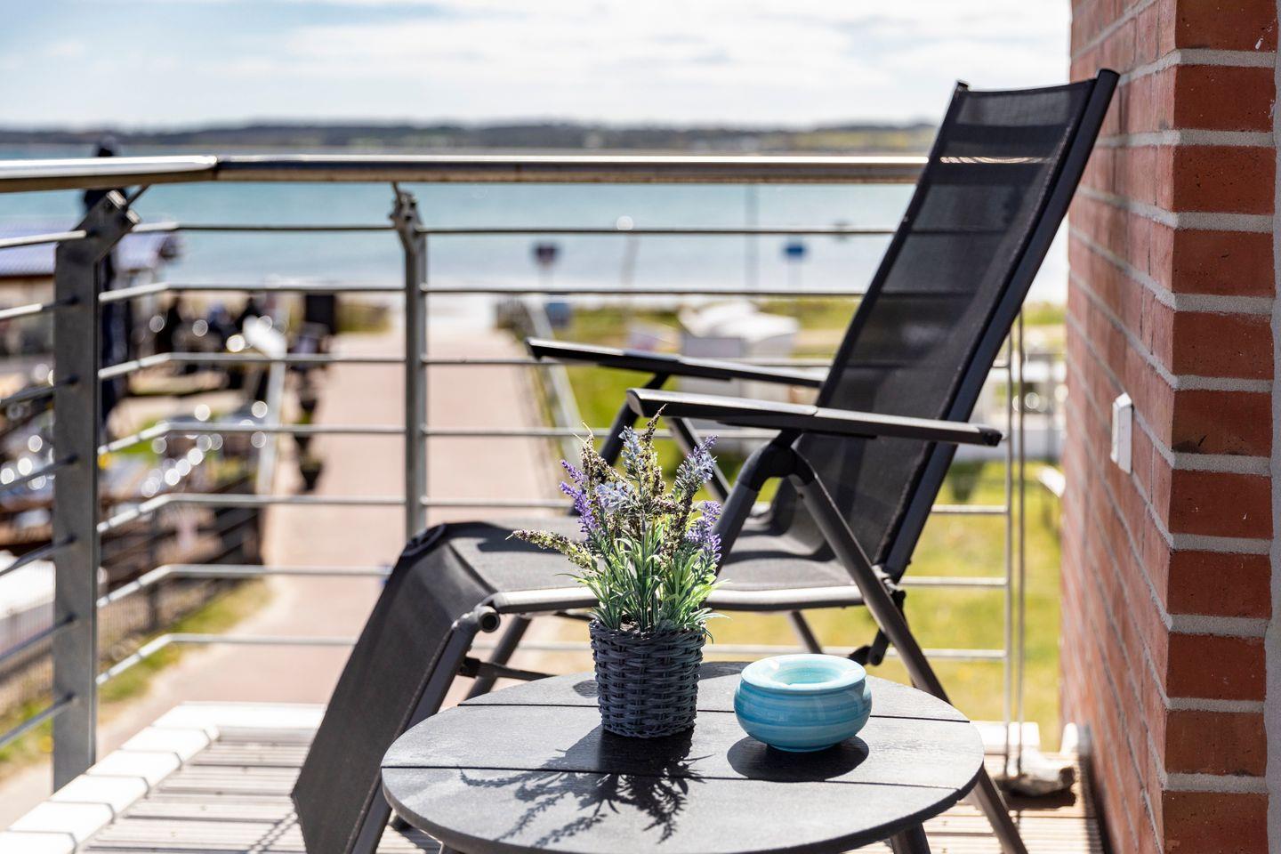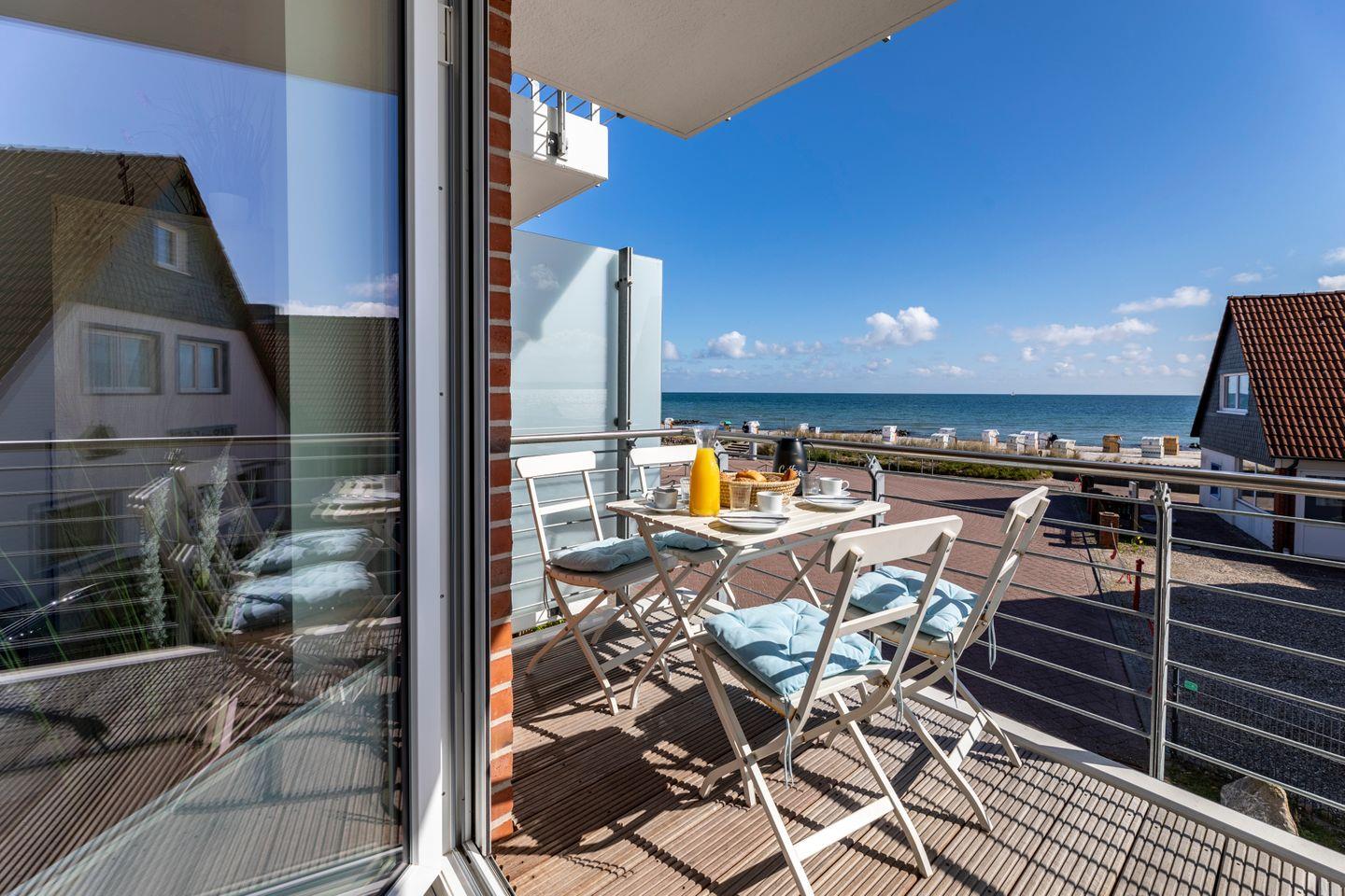 Zur Wohnung gehört ein nach Osten ausgerichteter Balkon mit herrlichem Blick auf die Ostsee und ihre wunderschönen Sonnenaufgänge. Hier stehen Tisch und Stühle bereit, um die Zeit im Freien genießen zu können.
