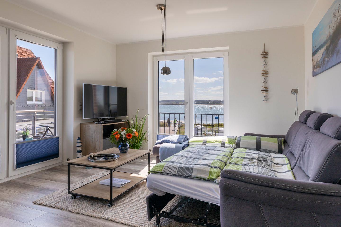 Ein gemütlicher Wohnbereich mit Sofa sorgt für Behaglichkeit. Der Flachbild-Fernseher sorgt für Unterhaltung auch an regnerischen Tagen. Bei Bedarf kann das Sofa in eine Schlafmöglichkeit für zwei weitere Gäste verwandelt werden.