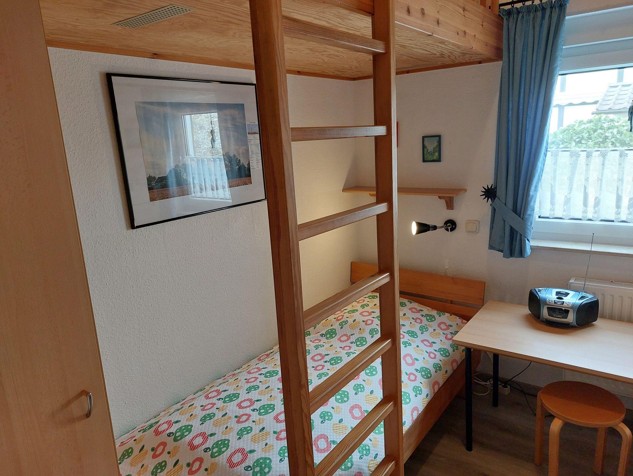 Das massiv errichtete, ebenerdige Ferienhaus 309 vom Typ Kogge befindet sich im absolut autofreien Teil unseres schönen Feriendorfes - ruhige Randlage mit Blick auf die Wettern und einen alten Obsthof. Das Haus verfügt über ca. 60 m² Wohn-/Nutzfläche und kann mit bis zu 5 Personen (+1 Kleinkind im Kinderreisebett) belegt werden. Das Ferienhaus bietet Ihnen neben einem Schlafraum mit einem Doppelbett, einem Schlafraum mit 2 Einzelbetten und einem eingebauten Hochbett, einem Badezimmer (Dusche / WC) und einem Abstellraum ein geräumiges Wohnzimmer mit offener Küche (Ceran-Kochfeld/Backofen, Kühlschrank/Gefrierfach, Mikrowelle, Spülmaschine) und Essplatz. Zugang zur möblierten Terrasse vom Wohnzimmer. Für den Gepäcktransport steht im Abstellraum ein Kofferwagen zur Verfügung. Nichtraucherhaus - kostenloses WLAN - Haustiere erlaubt - Brötchenservice von Ostern bis Oktober!