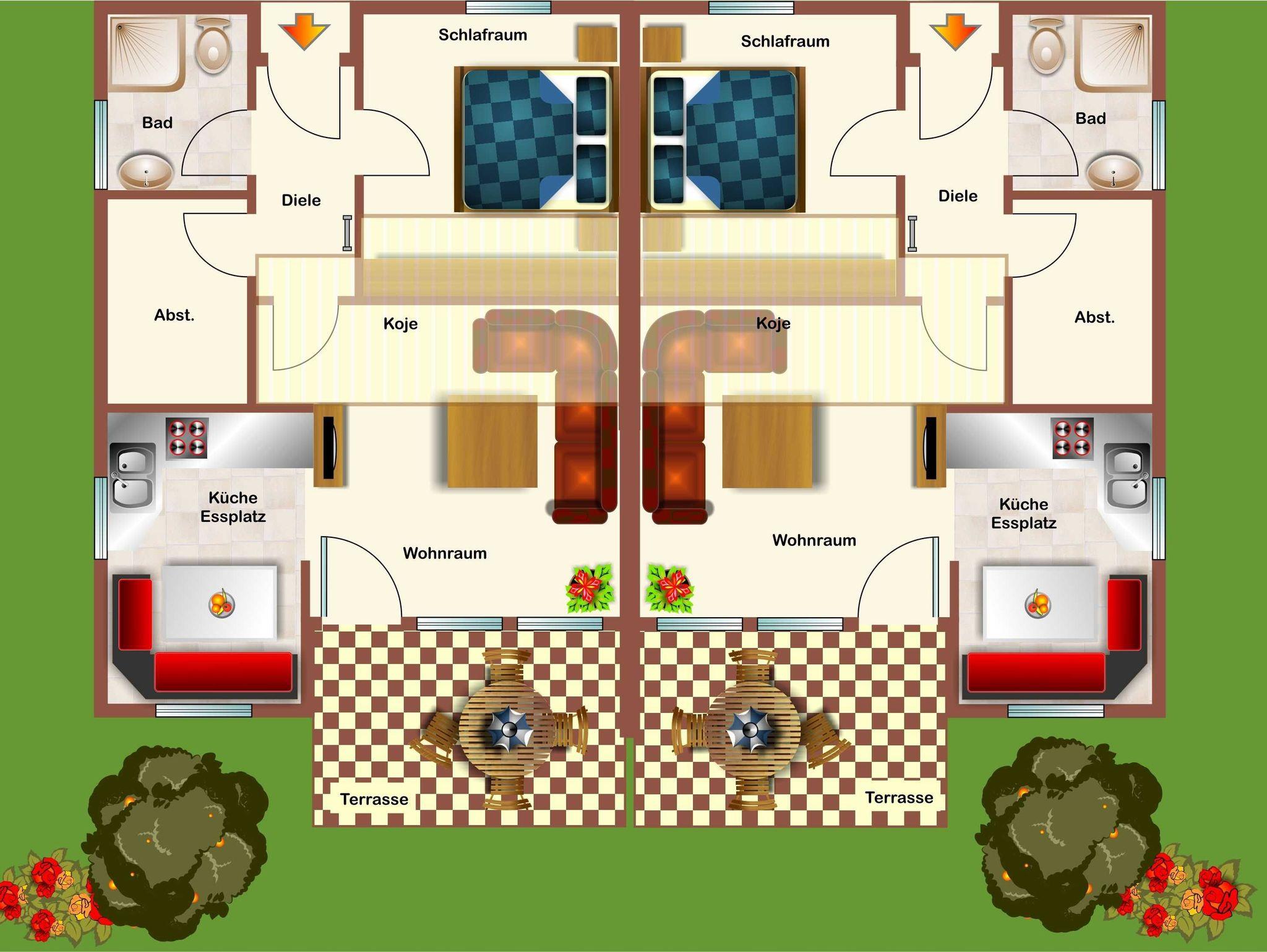 Unsere gemütlichen, ebenerdigen Doppelhaushälften vom Typ Scout 42 bieten Ihnen eine Wohn-/Nutzfläche von ca. 42 m² und können mit 2 Personen (ebenerdig) oder bis zu 4 Personen bei Nutzung der Koje unterm Dach, belegt werden. Zusätzlich kann im Schlafraum ein Kinderreisebett für ein Kleinkind aufgestellt werden. Die Häuser bieten Ihnen ein Badezimmer (Dusche/WC), 1 innenliegenden Abstellraum, 1 Schlafraum (entweder mit einem Doppelbett oder mit zwei Einzelbetten) und ein Wohnzimmer mit angrenzender Küche (Ceran-Kochfeld/Backofen, Kühlschrank/Gefrierfach, Spülmaschine) mit Essplatz. Zugang zur möblierten Terrasse vom Wohnzimmer. Vom Flur aus führt eine Leiter auf die Koje, in der sich 2 weitere Schlafgelegenheiten (idealerweise für 2 Kinder ab 6 Jahren) befinden. Nichtraucherhäuser - kostenloses WLAN - Haustiere erlaubt - Brötchenservice von Ostern bis Oktober!