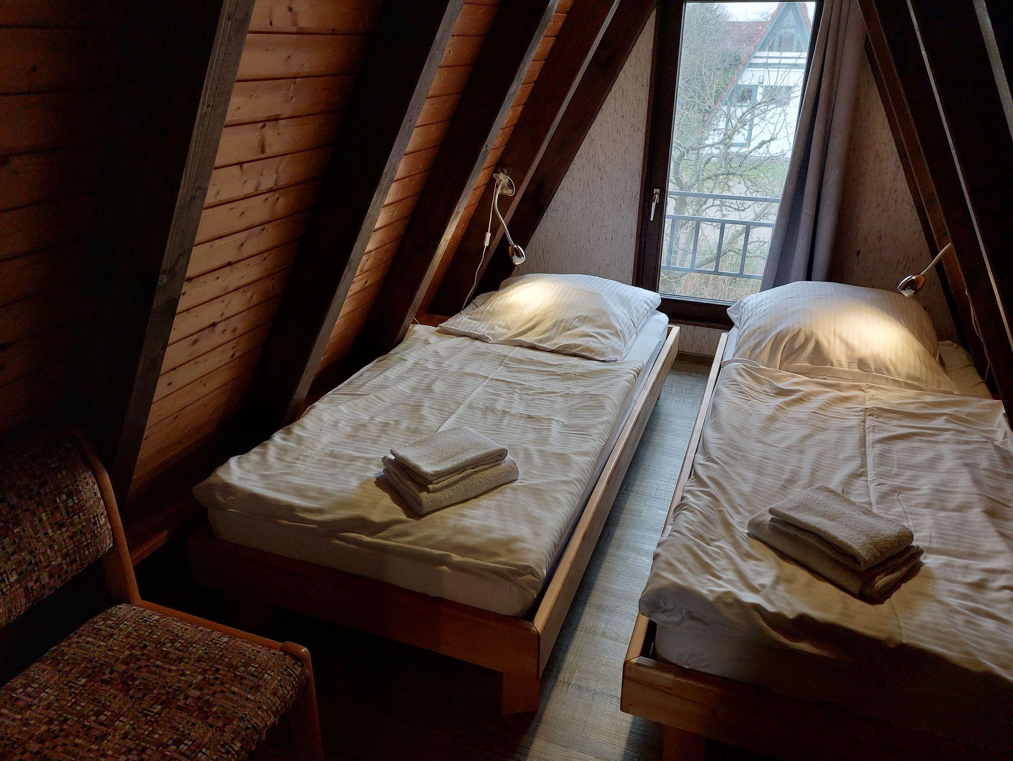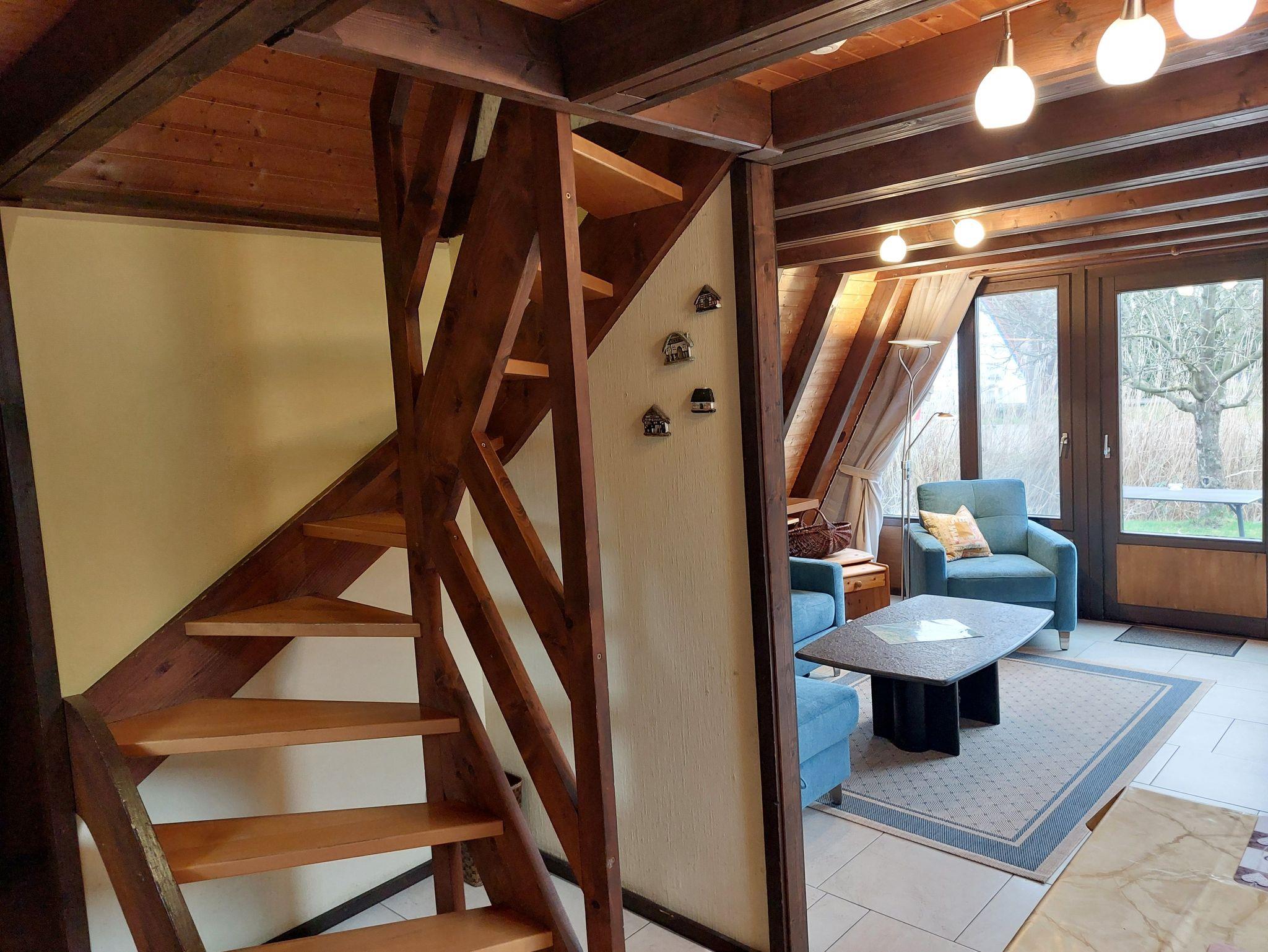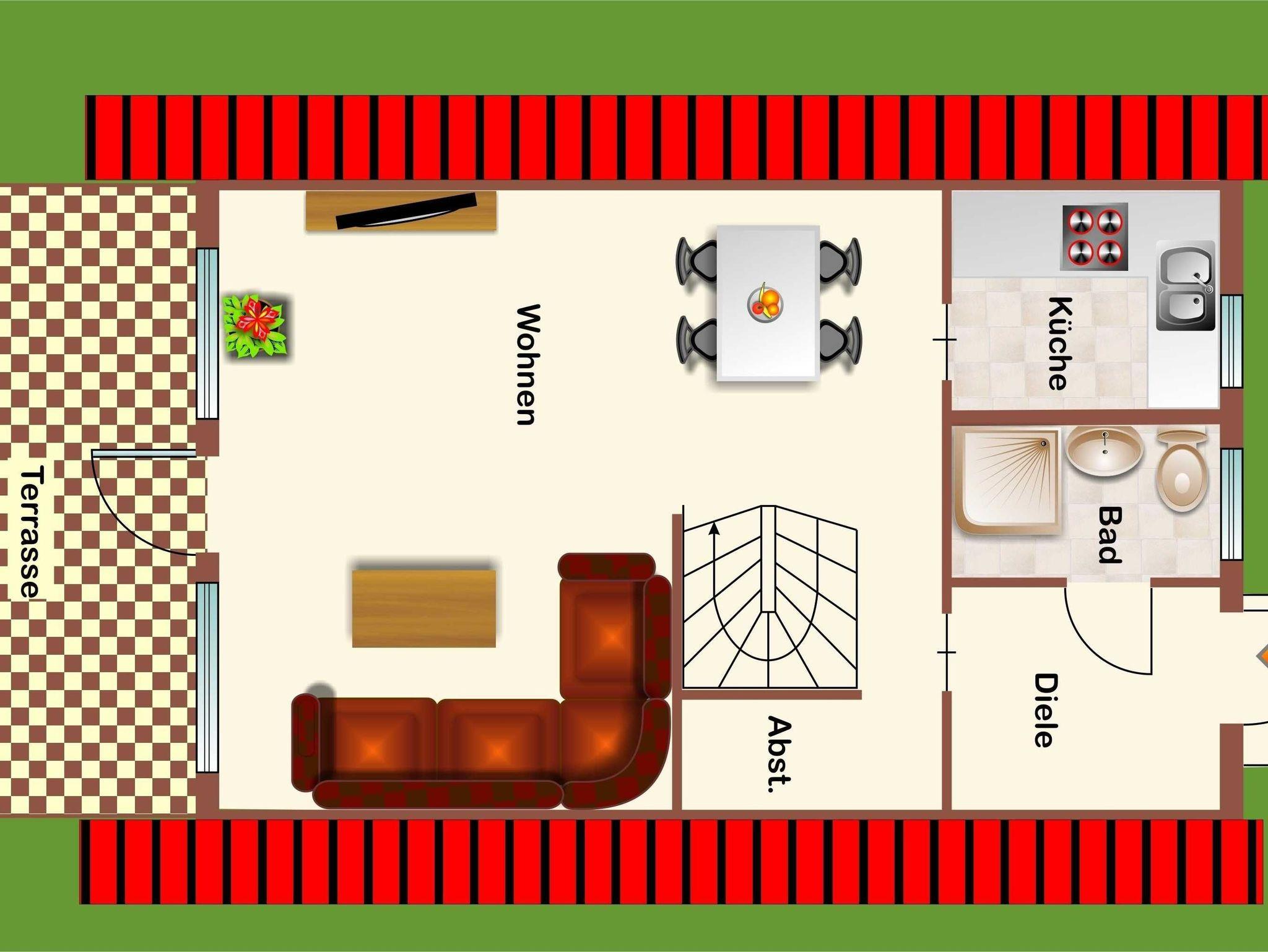 Unser Nurdachhaus 25, Typ Wigwam, verfügt über ca. 53 m² Wohn-/Nutzfläche und kann mit bis zu 5 Personen belegt werden. Im Erdgeschoss befinden sich das Badezimmer (Dusche/WC), eine kleine Abstellfläche (Abseite hinter der Treppe) und der Wohnraum mit Schlafcouch, Essplatz und Durchgang zur Küche (4-Plattenherd, Kühlschrank/Gefrierfach). Zugang zur möblierten Terrasse vom Wohnzimmer. Im Obergeschoss (über eine steile, offene, angewendelte Treppe erreichbar) befinden sich 2 Schlafräume mit jeweils zwei Einzelbetten. Das zum Haus gehörende Gartenhäuschen bietet zusätzliche Abstellfläche (für Fahrräder etc.). Nichtraucherhaus - kostenloses WLAN - Haustiere erlaubt - Brötchenservice von Ostern bis Oktober!