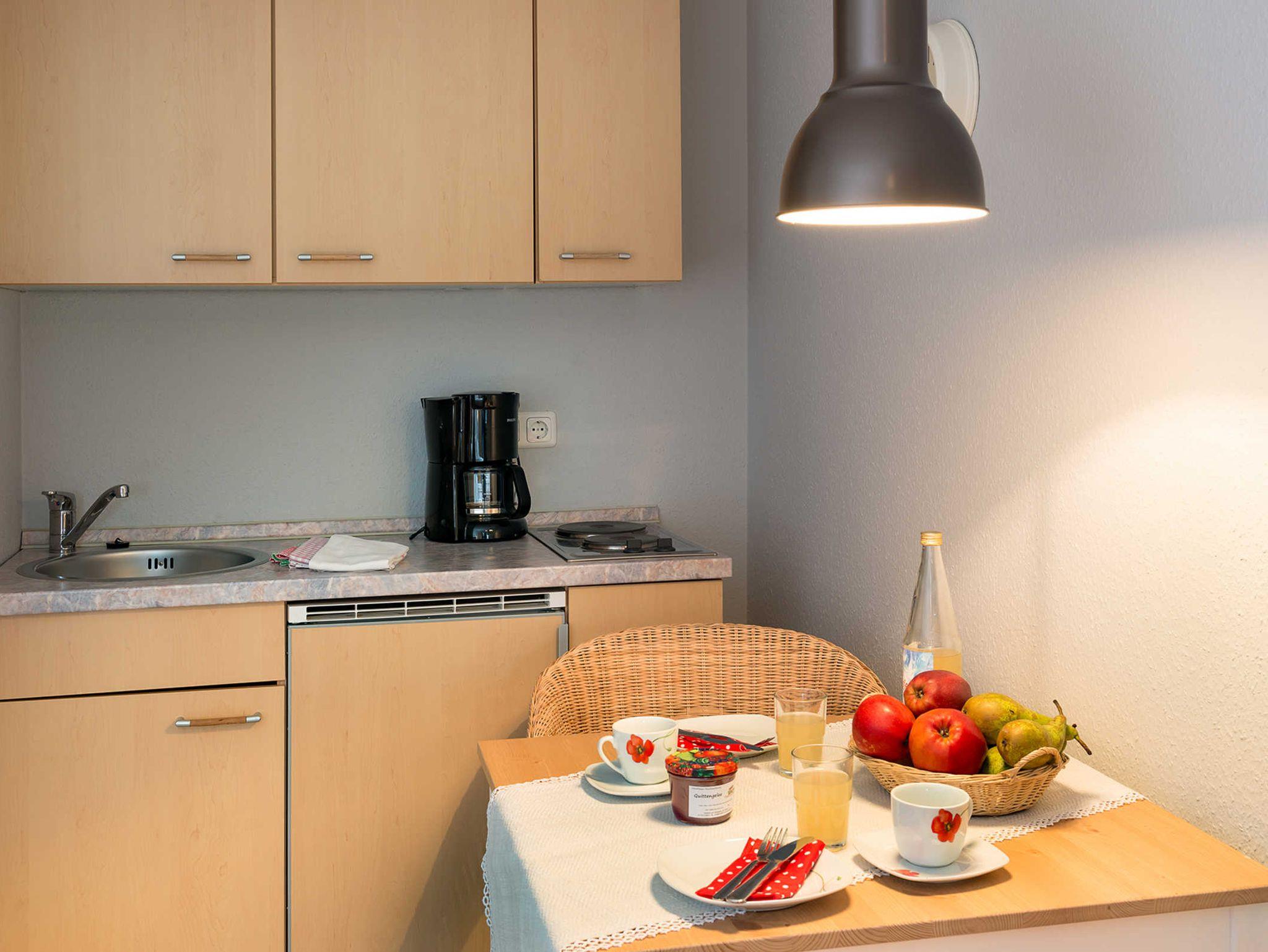 Das 25qm große Appartements (geeignet für 2 Personen) wurde im April 2016 renoviert und liegt im Parterre des 300 Jahre alten Fachwerkbauernhauses. Es verfügt über ein Wohn-Schlafzimmer mit Doppelbett, einer Sitzecke mit Sessel und TV, einer Kochnische und einem separaten Bad mit Dusche und WC. Hunde auf Anfrage.