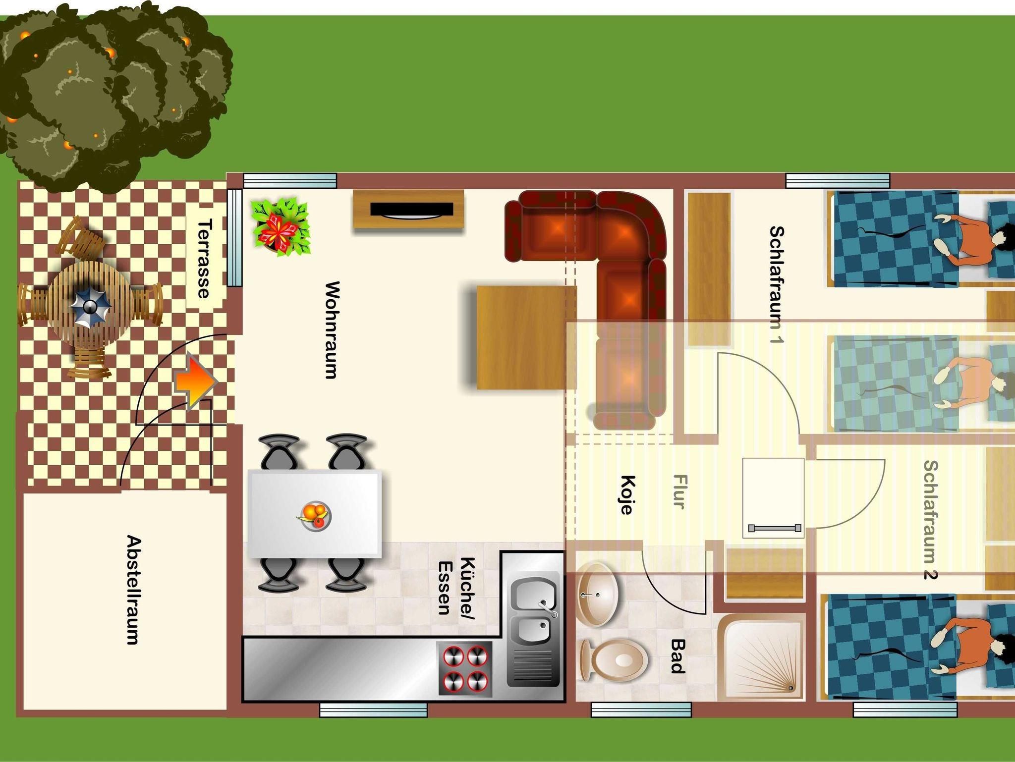 Die gemütlichen Ferienhäuser vom Typ Mohikaner verfügen über ca. 40 m² Wohn-/Nutzfläche und können mit bis zu 5 Personen belegt werden. Die Ferienhäuser bieten Ihnen neben 2 Schlafräumen (1 Schlafraum mit einem Doppelbett oder 2 Einzelbetten und 1 Schlafraum mit einem Einzelbett), einem Badezimmer (Dusche / WC) auch ein Wohnzimmer mit Zugang zur möblierten Terrasse (tlws. mit außenliegendem Abstellraum) und offener Küche (Ceran-Kochfeld/Backofen, Kühlschrank/Gefrierfach, Mikrowelle und Spülmaschine) mit Essecke. 2 zusätzliche Schlafgelegenheiten (Matratzen) befinden sich auf der Koje unterm Dach (über eine Leiter zu erreichen). Nichtraucherhäuser - kostenloses WLAN - Haustiere erlaubt - Brötchenservice von Ostern bis Oktober!