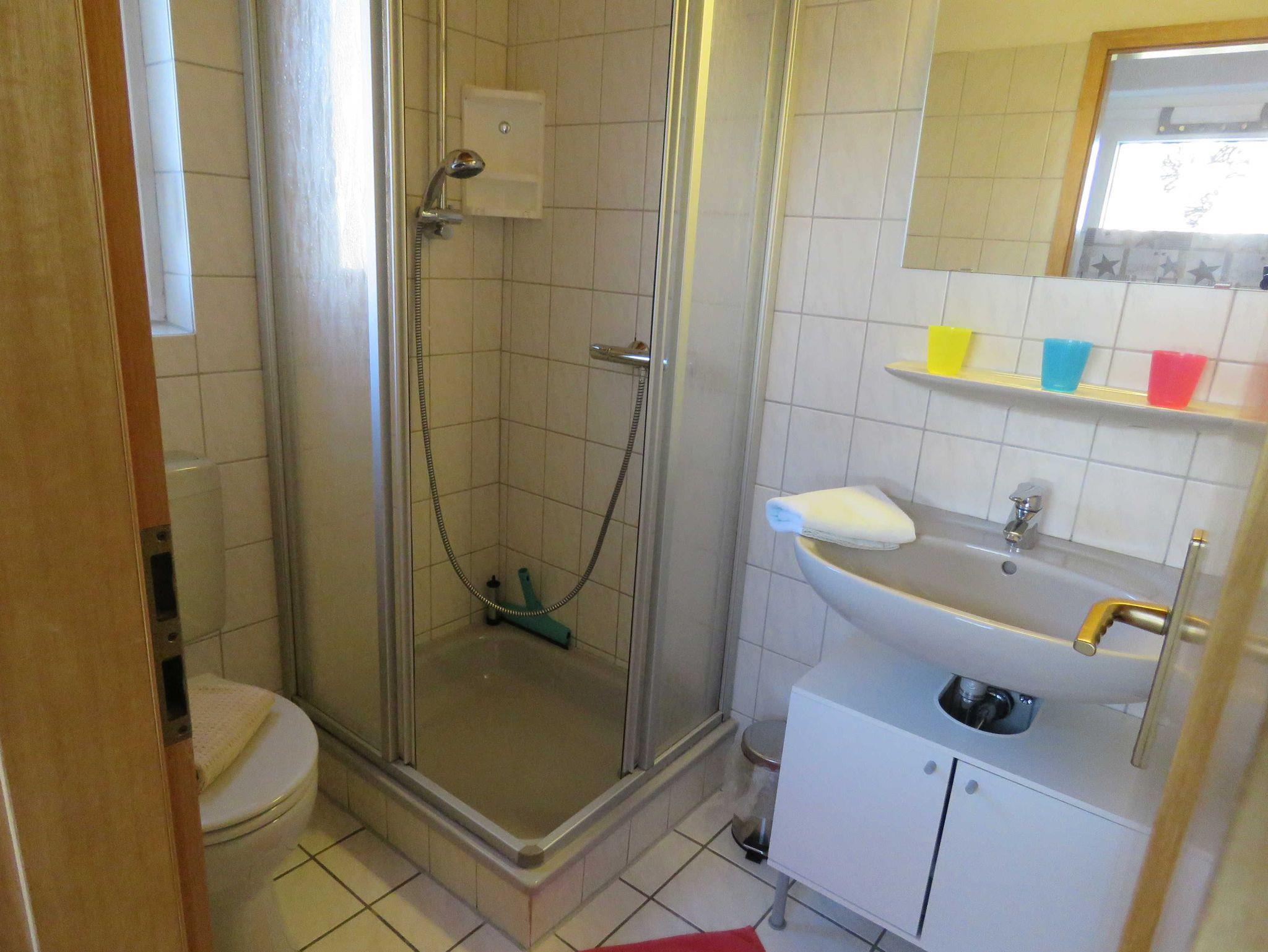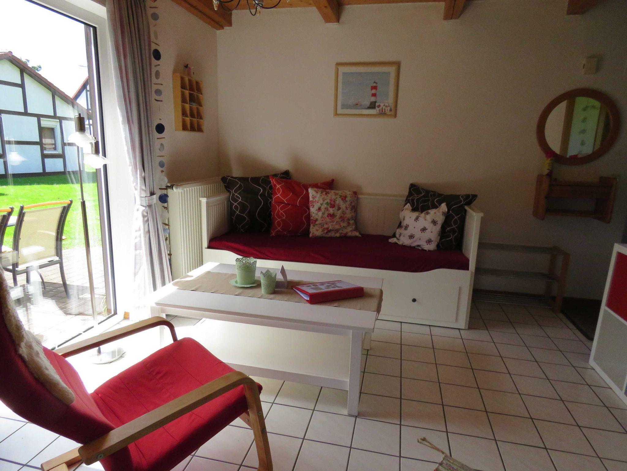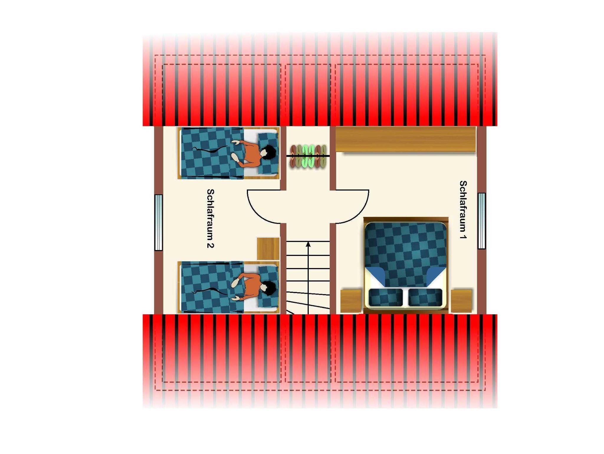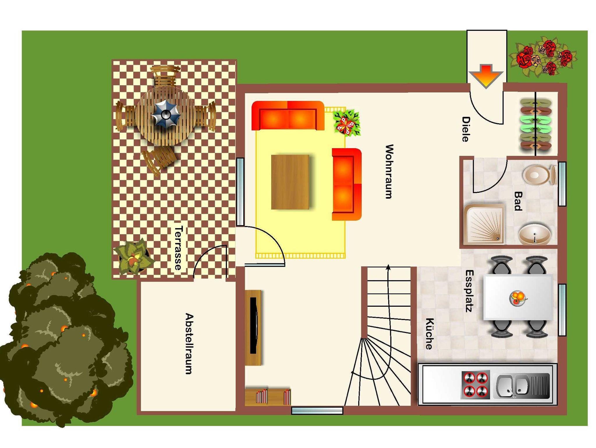 Die massiv errichteten Ferienhäuser vom Typ Scout 60 verfügen über ca. 60 m² Wohn-/Nutzfläche auf 2 Etagen und können mit bis zu 5 Personen (+ 1 Kleinkind im Kinderreisebett) belegt werden. Im Erdgeschoss befindet sich das Badezimmer (Dusche/WC), das Wohnzimmer (mit Schlafgelegenheit) mit angrenzender offener Küche mit Essplatz (Ceran-Kochfeld/Backofen - Kühlschrank/Gefrierfach, Mikrowelle und Spülmaschine). Zugang zur möblierten Terrasse vom Wohnzimmer. Über die offene Treppe im Wohnbereich gelangt man zu den beiden Schlafräumen im Obergeschoss (ein Schlafraum mit einem Doppelbett und ein Schafraum mit zwei Einzelbetten). Als Abstellmöglichkeit stehen entweder ein außenliegender Abstellraum oder ein Gartenhäuschen zur Verfügung. Nichtraucherhäuser - kostenloses WLAN - Haustiere erlaubt - Brötchenservice von Ostern bis Oktober!