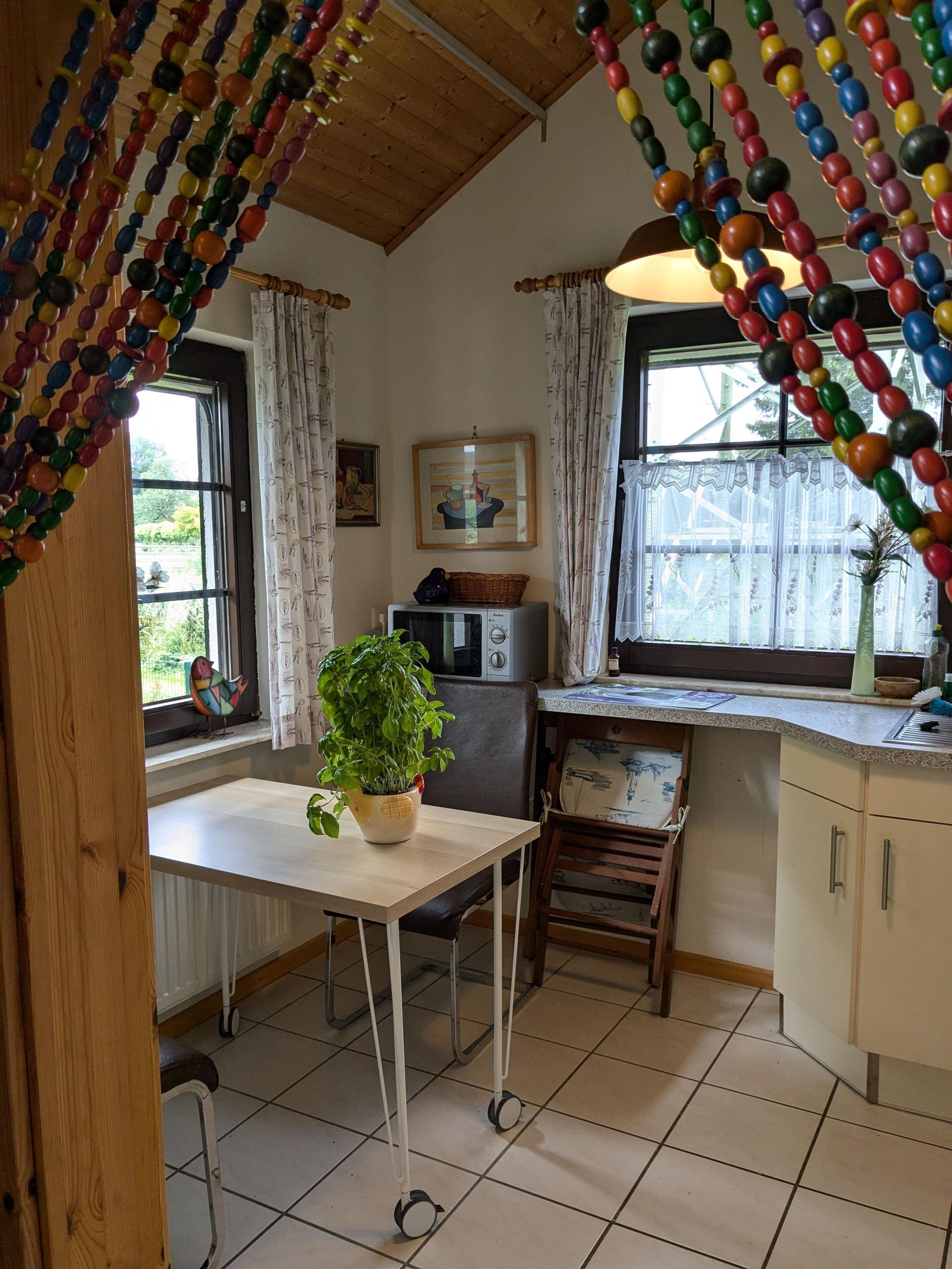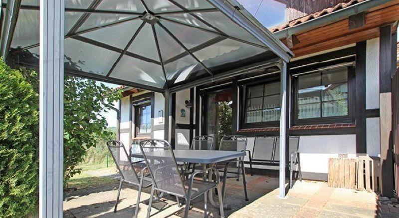Vom Wohnzimmer gelangen Sie zum einen zur gut ausgestatteten Küche zum anderen direkt auf die Terrasse mit einem Pavillon als Schutz.