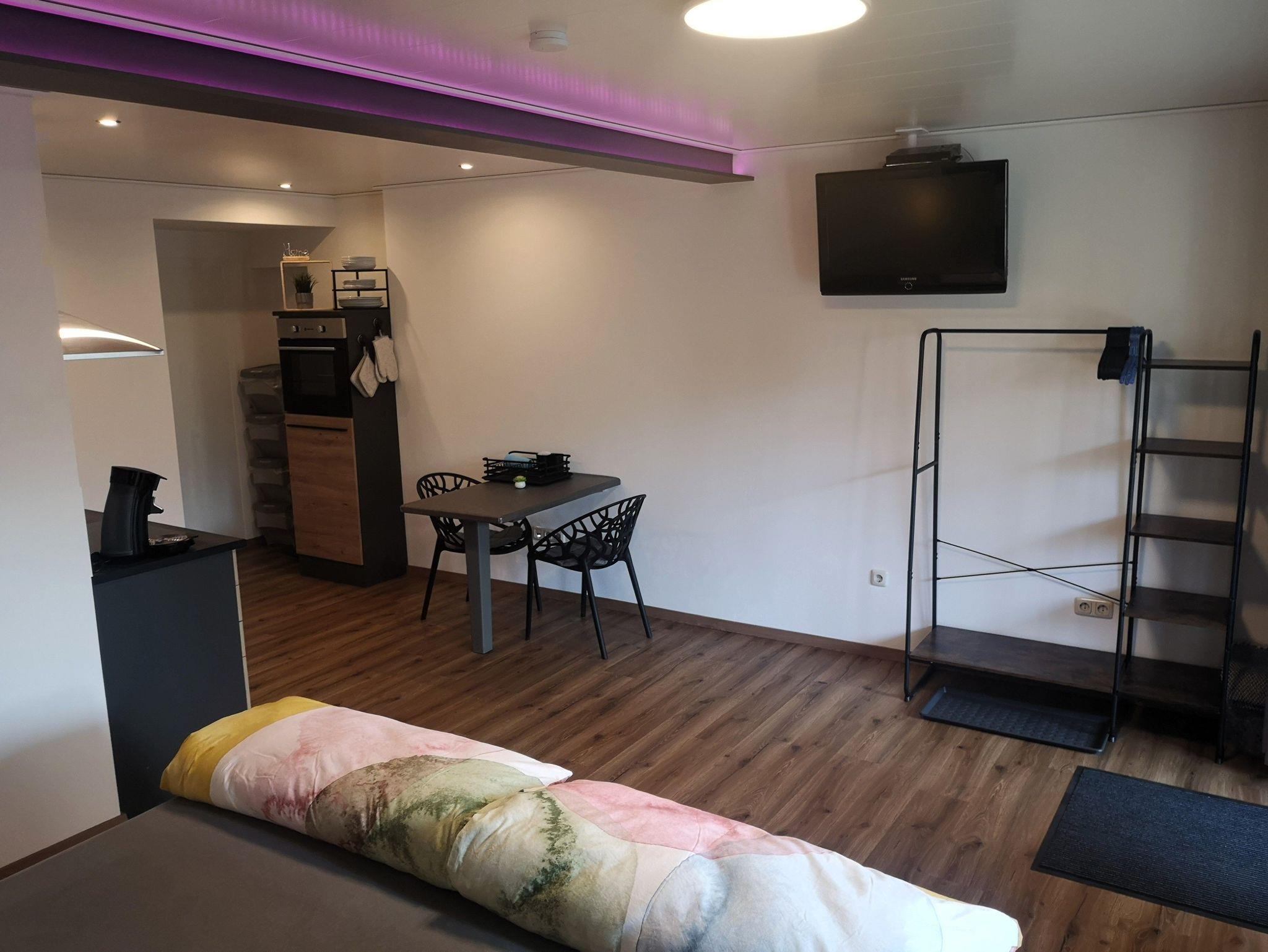 Im Wohn- Schlafraum ist ein Flat-TV, Esstisch mit Stühlen und einem Boxspringbett 1,80 x 2 m ausgestattet.