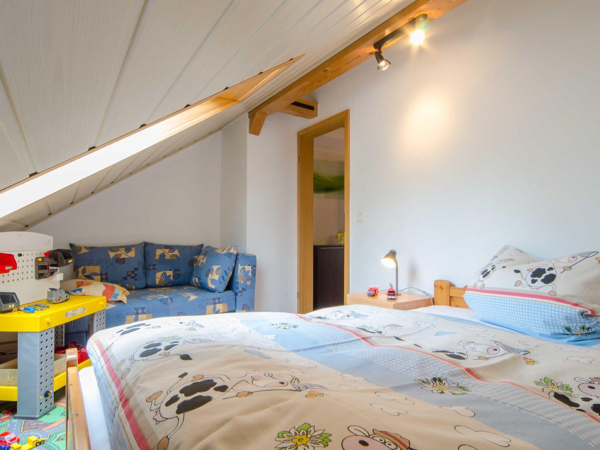 Hier befinden sich ein Schlafzimmer mit Doppelbett und anschliesendem Kinderzimmer (auch als Einzelzimmer nutzbar), ein weiteres Schlafzimmer mit mit Doppelbett, Einzelbett und zusatzlicher Ausziehcouch (nutzbar für bis zu 4 Personen). Wir bieten somit eine Unterkunft für 6- 8 Personen mit gemeinsam nutzbare Küche, Bad und Wohnbereich.