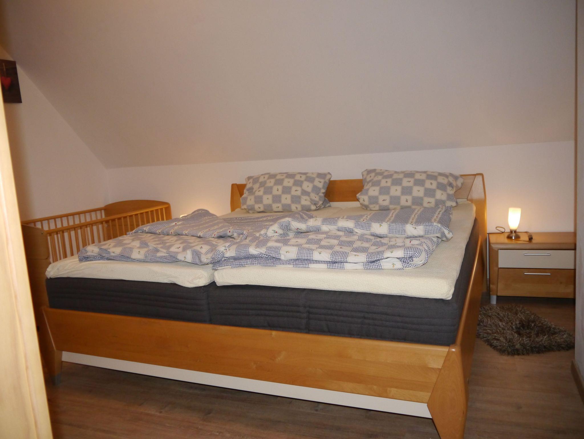 Die Ferienwohnung 3 beinhaltet 3 Schlafzimmer darunter zwei einzel stehende Betten und zwei Doppelbetten sowie ein Babybett.