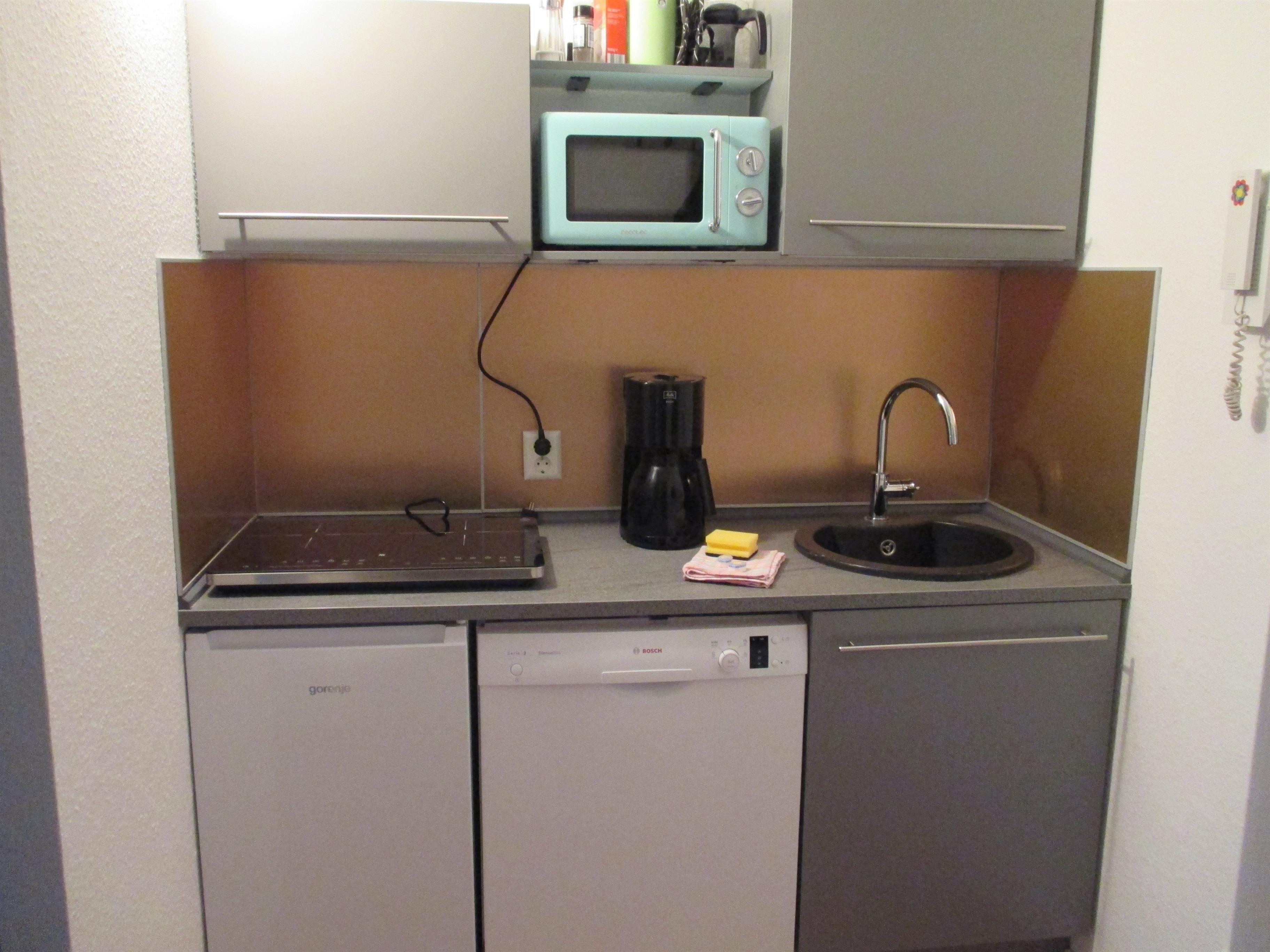 Die Küchenzeile verfügt über eine Spüle, 2 Induktion-Kochplatten von WMF, einen Kühlschrank mit Gefirerfach, einen Geschirrspüler sowie eine Mikrowelle. Außerdem ist eine Kaffeemaschine, ein Espresso Kaffeepad- Automat und eine Mikrowelle vorhanden. Selbstverständlich ist die Küche auch mit Töpfen, Pfannen, Geschirr und Besteck ausgestattet.