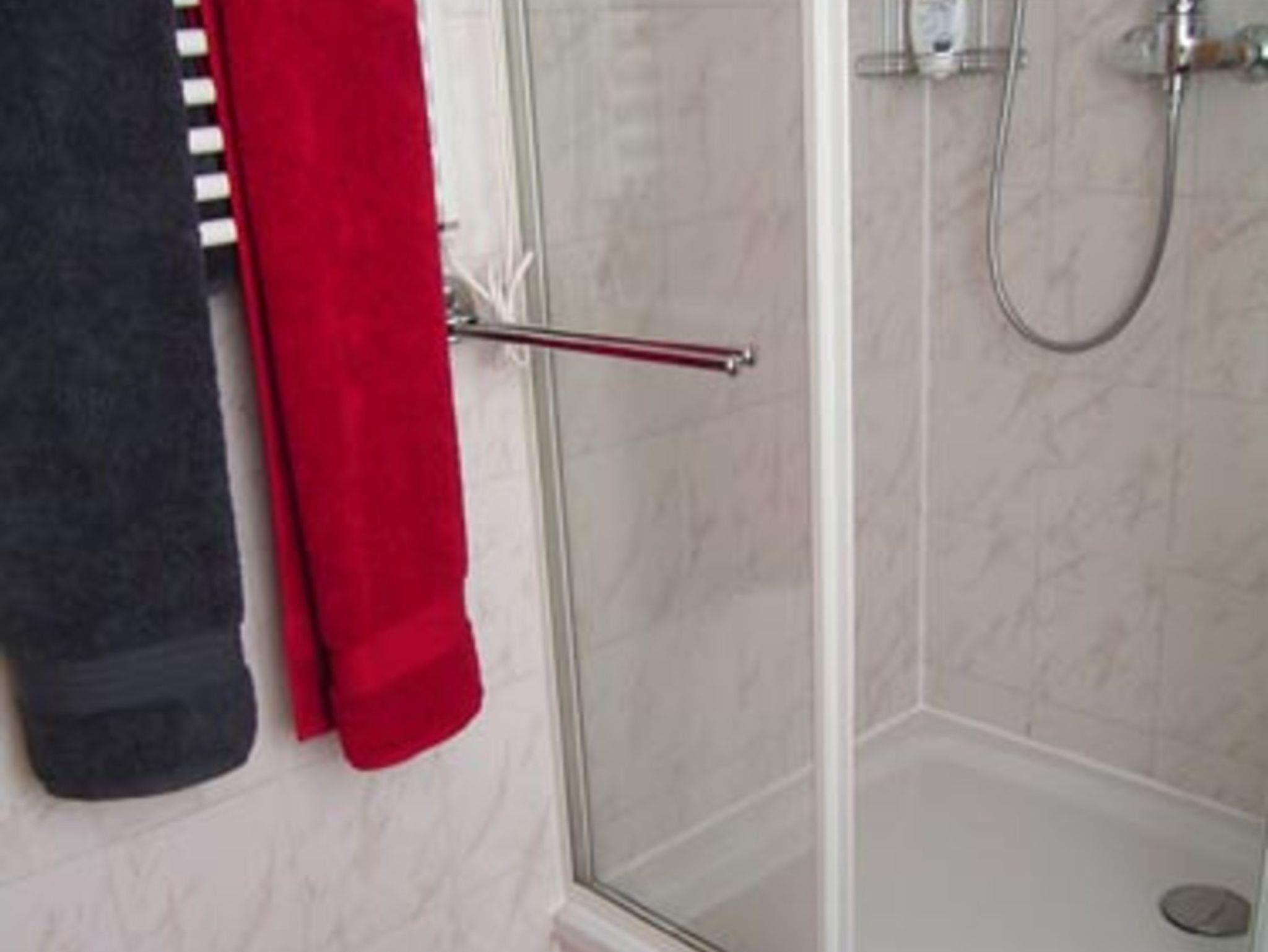 Bad mit Dusche und WC, Fön, Bade- und Handtücher, elektrischer Handtuchtrockner