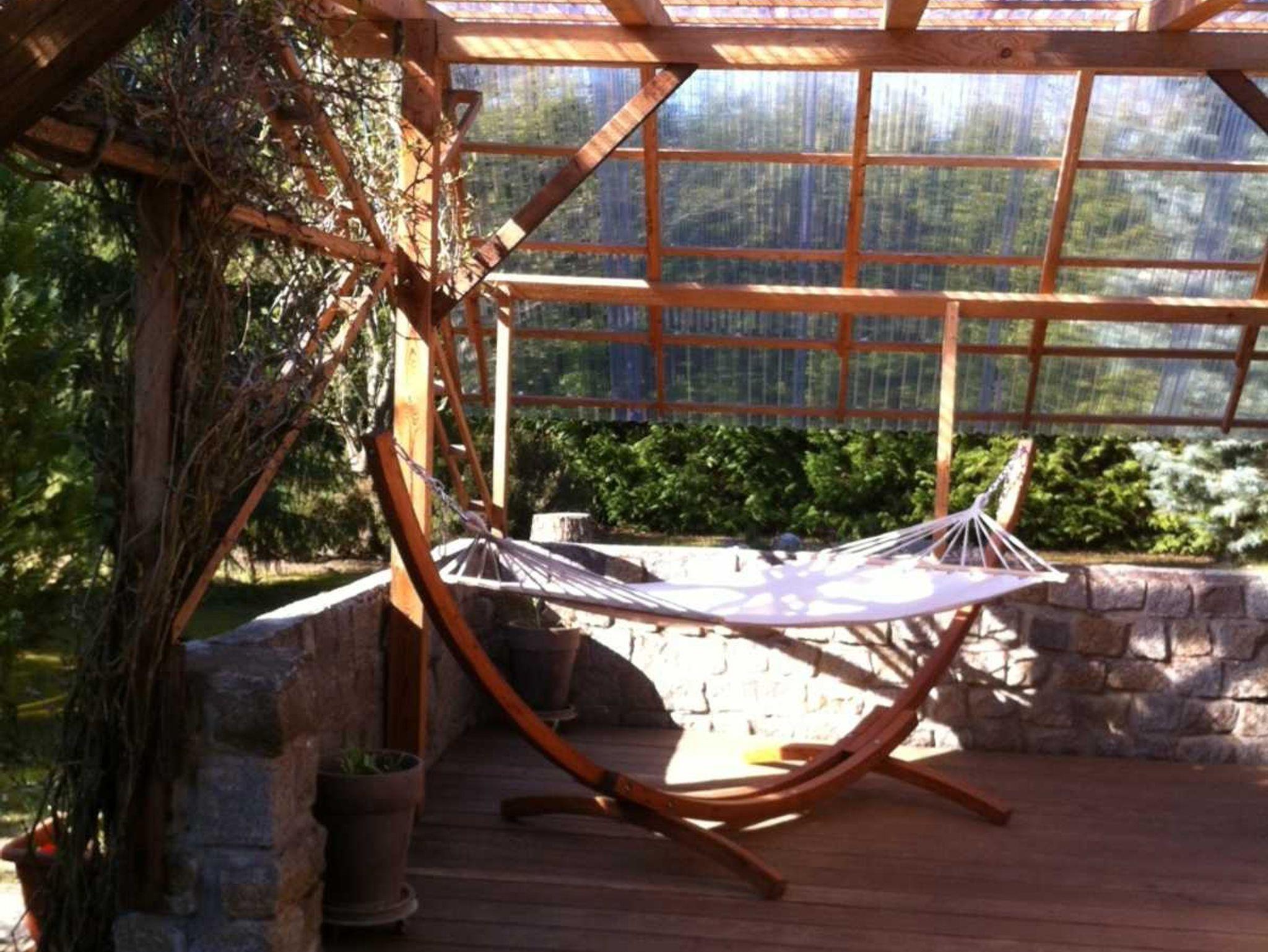 Wohnraum und separates Schlafzimmer mit Doppelbett, überdachte möblierte Terrasse mit gemütlicher Hängematte und Grillmöglichkeit (Elektrogrill). Carport-Stellplatz beim Haus...