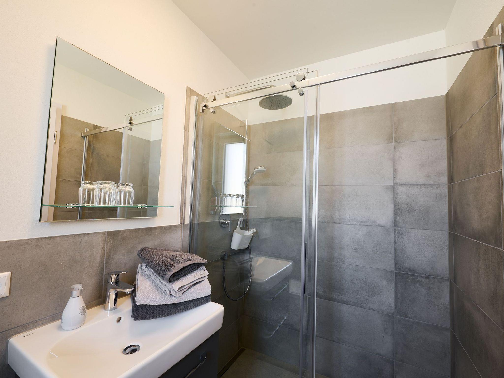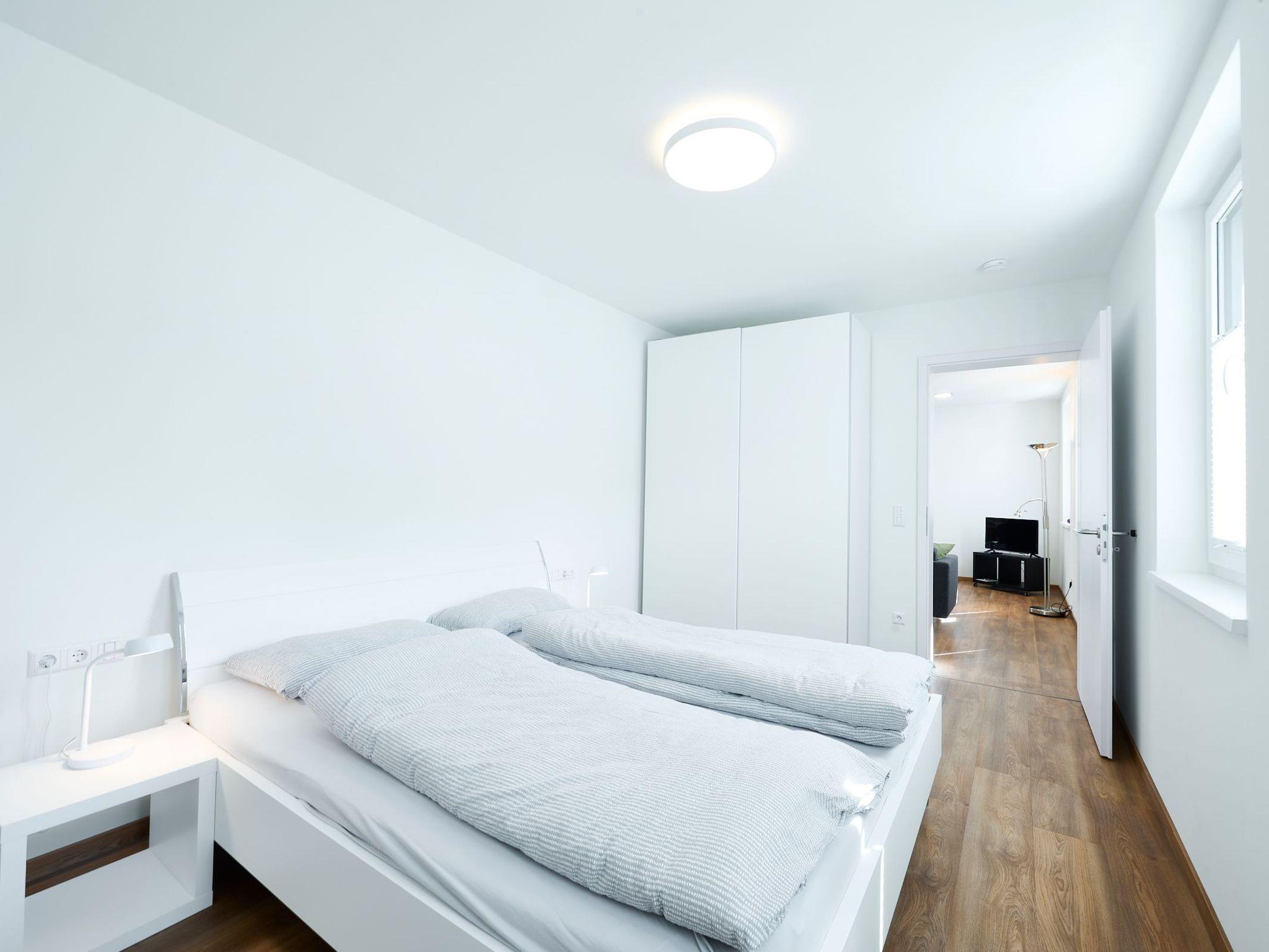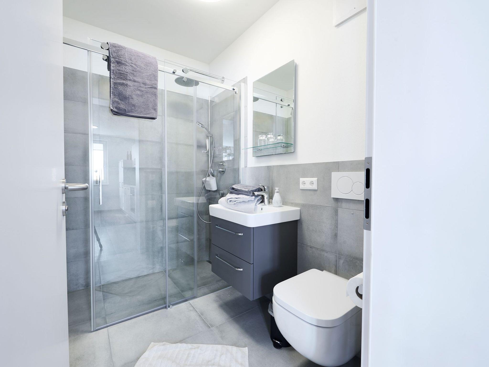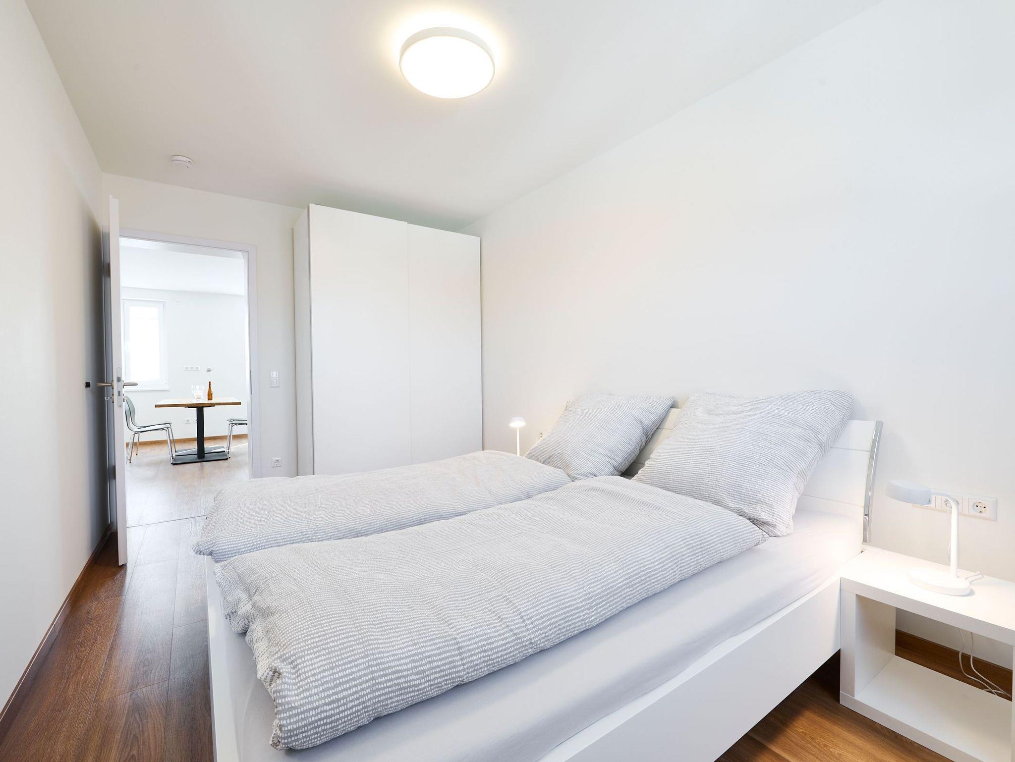 Wohnzimmer mit Couch und separatem Schlafsofa, 2 Schlafzimmer mit Doppelbett und Kleiderschrank, 2 Badezimmer mit Dusche, voll ausgestattete Küche (Spülmaschine, Wasserkocher, Kaffeemaschine, Kühlschrank uvm., Essbereich mit Tisch und 2 Stühlen)