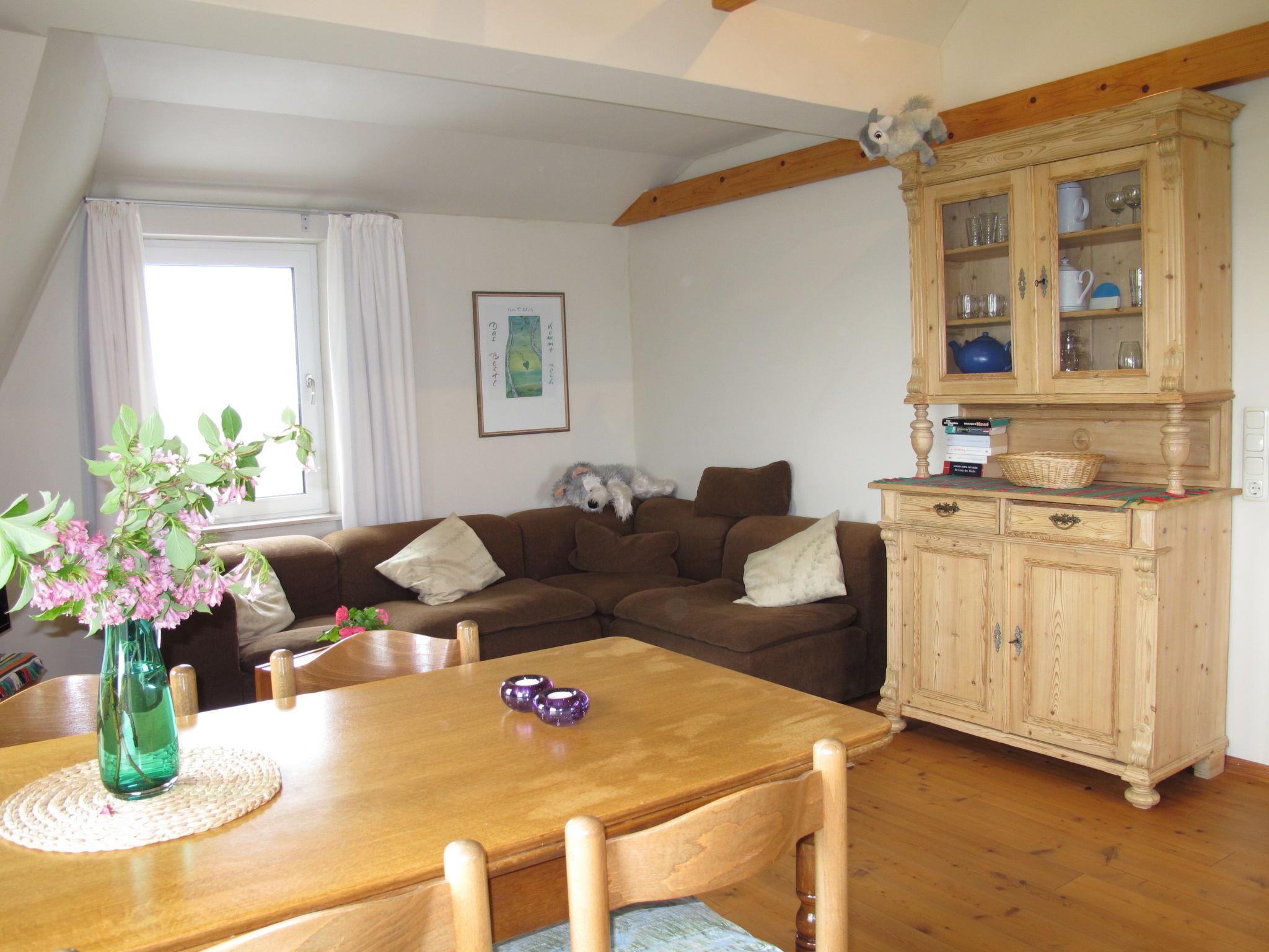 2-room apartment 55 m2 on 1st floor. Tasteful furnishings: living/sleeping room with sloping ceilings with 2 beds (90 cm, length 200 cm), dining table, satellite TV and hi-fi system. 1 room with 1 sofabed and 1 x 2 bunk beds (90 cm, length 200 cm). Kitchen (oven, dishwasher, 4 ceramic glass hob hotplates, toaster, kettle, microwave, electric coffee machine). Shower/WC. Patio. Terrace furniture, deck chairs (2). Facilities: Internet (WiFi, free). Please note: non-smokers only. Smoke alarm. Complete biological building renovation, allergy-friendly and fly screens in all rooms.