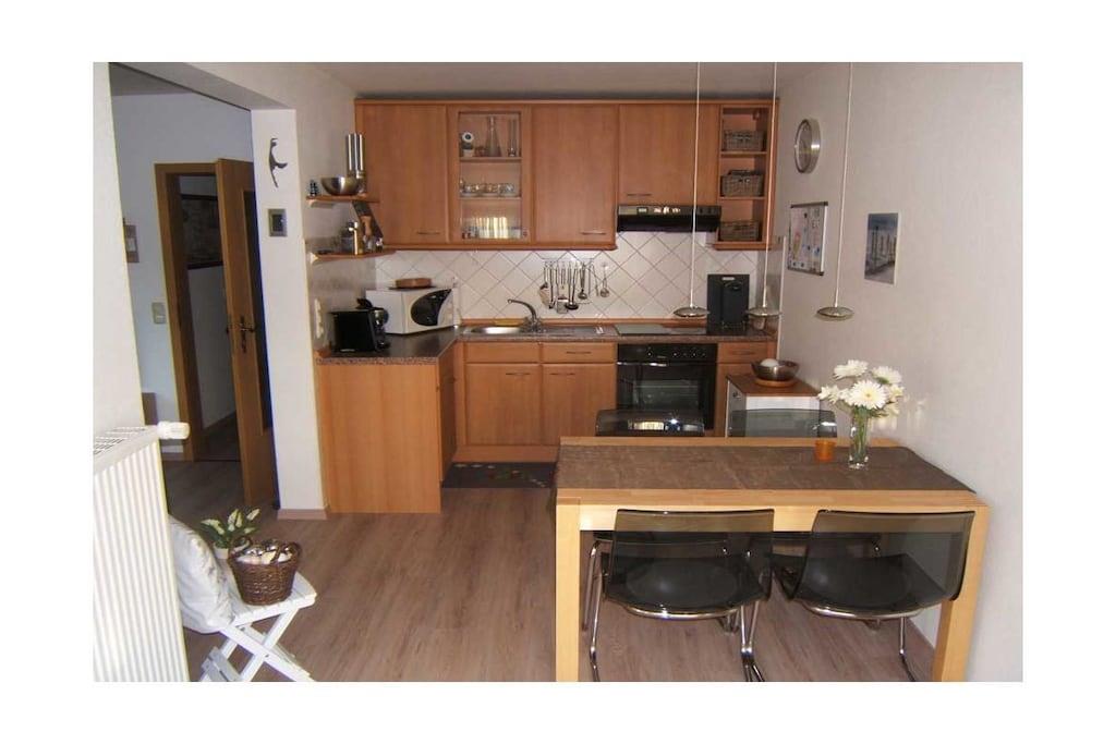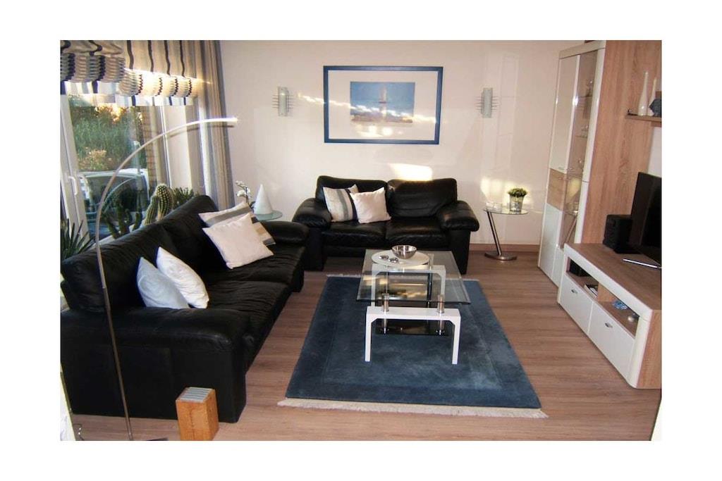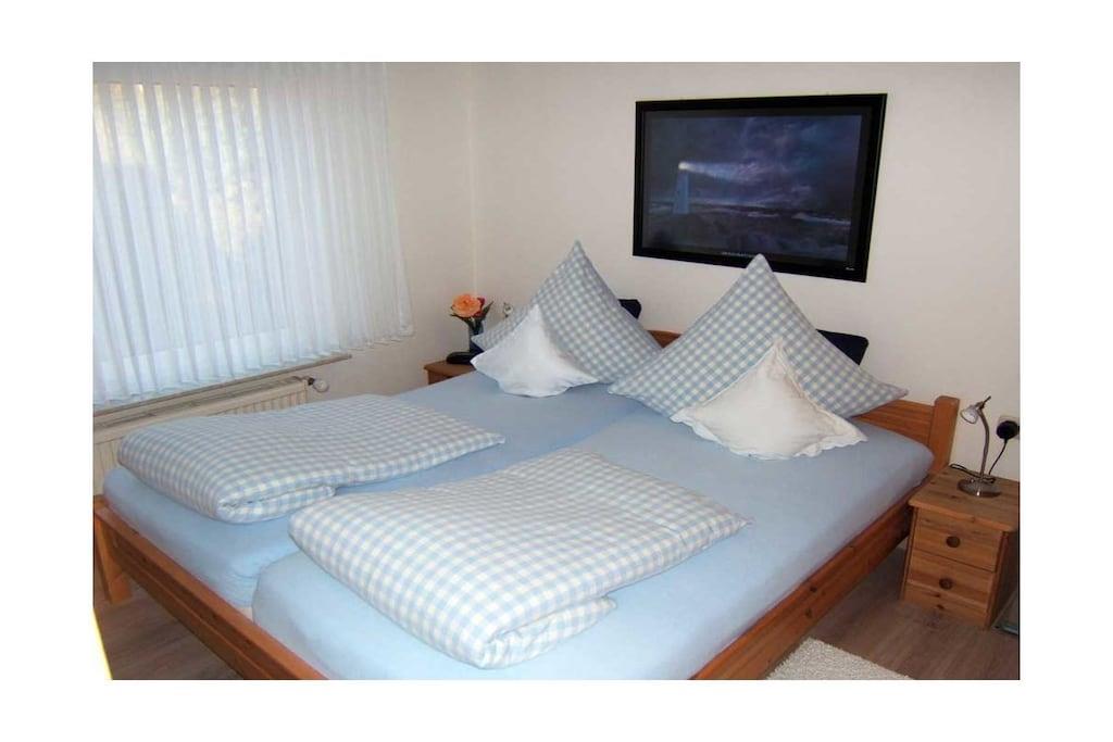 Zentral in einer ruhig gelegenen Sackgasse befindet sich das Ferienhaus Am Tief 22 mit der im OG liegenden Ferienwohnung. Neben dem Wohnraum befindet sich der Essraum mit integrierter Küche; angrenzend lädt eine Sitzgruppe an der Sonnenseite zum Verweilen ein; daneben liegt der Südbalkon, wo Sie auch noch die Abendsonne genießen können. (Rauchen auf dem Balkon möglich) Ein Schlafzimmer verfügt über ein großes Doppelbett, das andere hat 2 Einzelbetten. Das Bad mit Dusche hat einen erhöhten WC-Sitz, Stauraum, Ablage und Sitzgelegenheit, Kinder WC-Sitz vorhanden, ausziehbarer Wandtrockner.