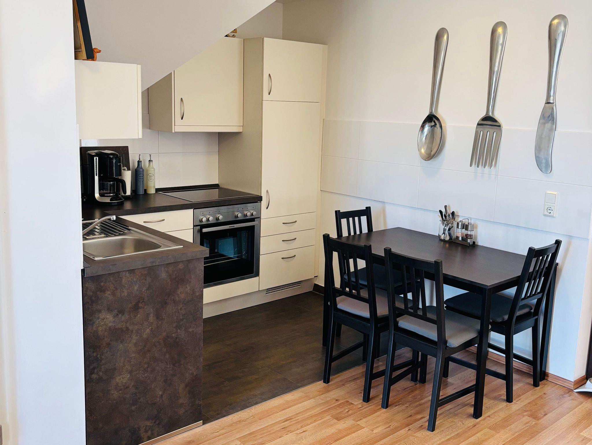 Offene Küche: Voll ausgestattet für kulinarische Freuden Die offene Küche lässt keine Wünsche offen: Backofen, Ceranfeld, Kühlschrank und Spülmaschine stehen Ihnen zur Verfügung. Für den perfekten Start in den Tag sorgt eine Filterkaffeemaschine. Zur weiteren Ausstattung gehören Salz, Pfeffer, Öl, Essig sowie diverse Töpfe und Pfannen.