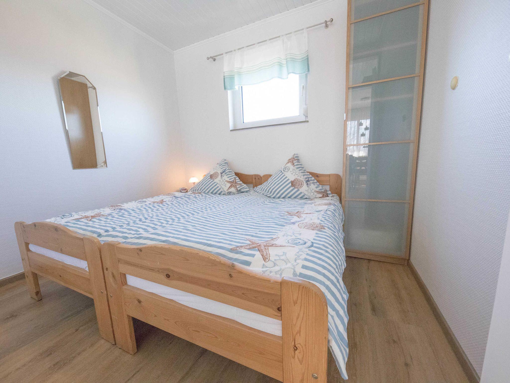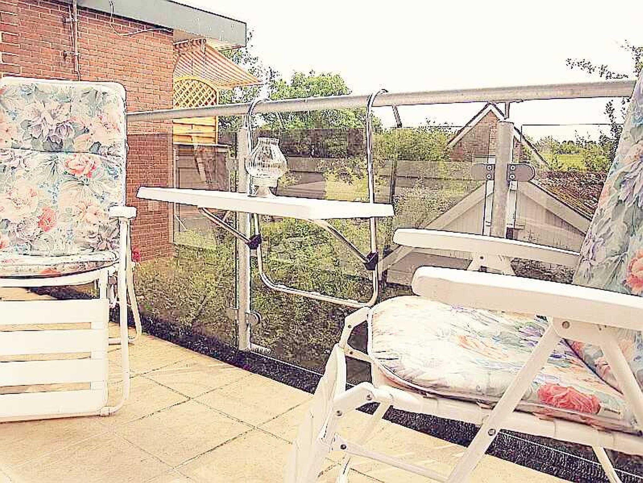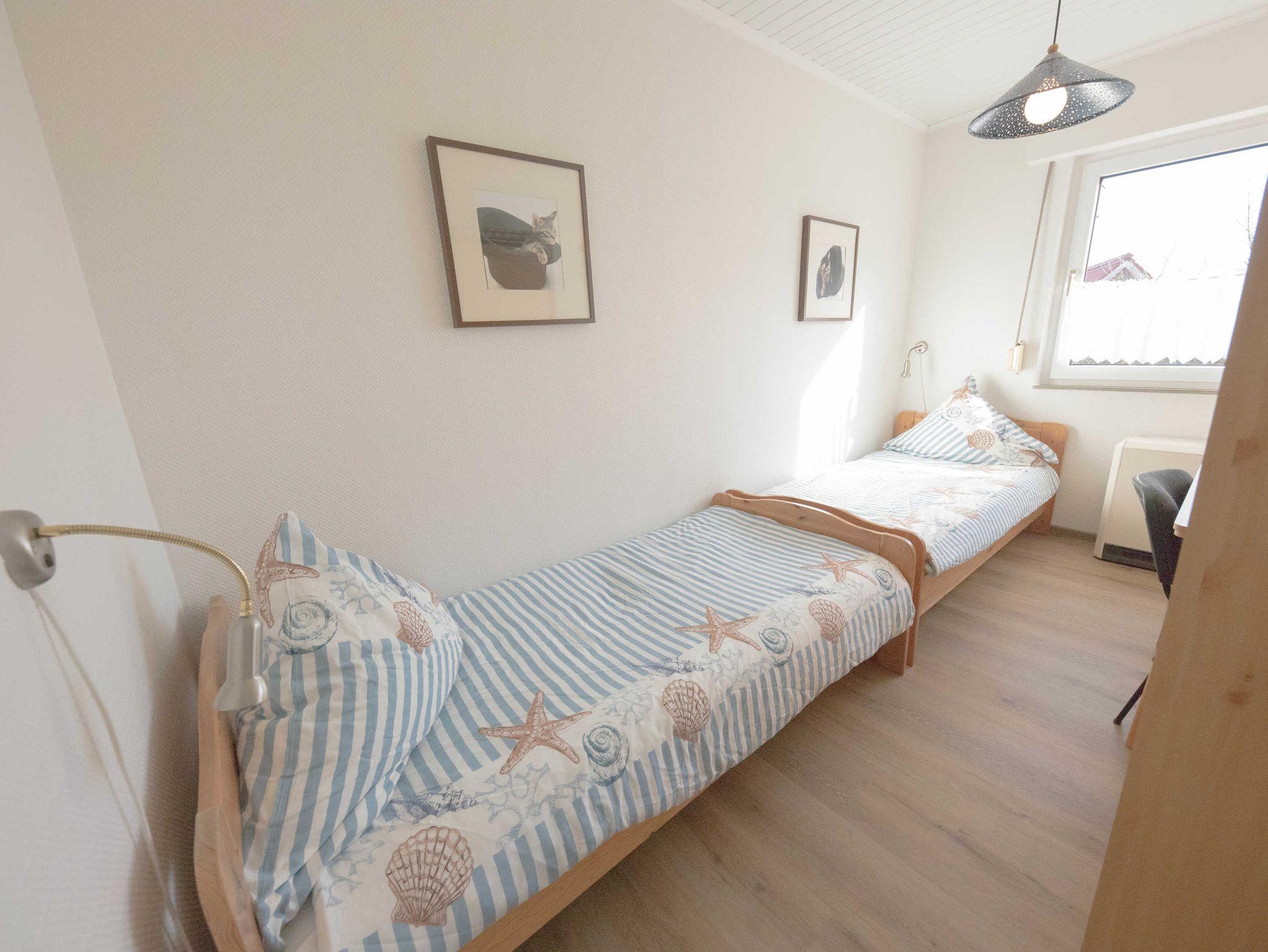 Die Ferienwohnung Tillmann befindet sich in der ersten Etage und verfügt über zwei Schlafzimmer mit jeweils zwei Einzelbetten. Im Wohnzimmer mit direktem Zugang auf den Balkon mit Blick auf den Deich ist der Essplatz integriert. Dem Wohnbereich schließt sich die Küche an. Das Tageslichtbadezimmer verfügt über eine Dusche und ein WC.