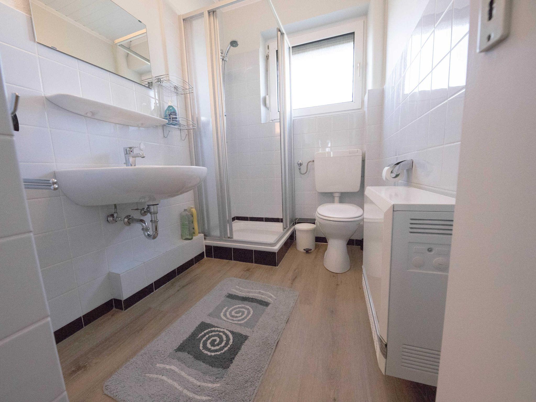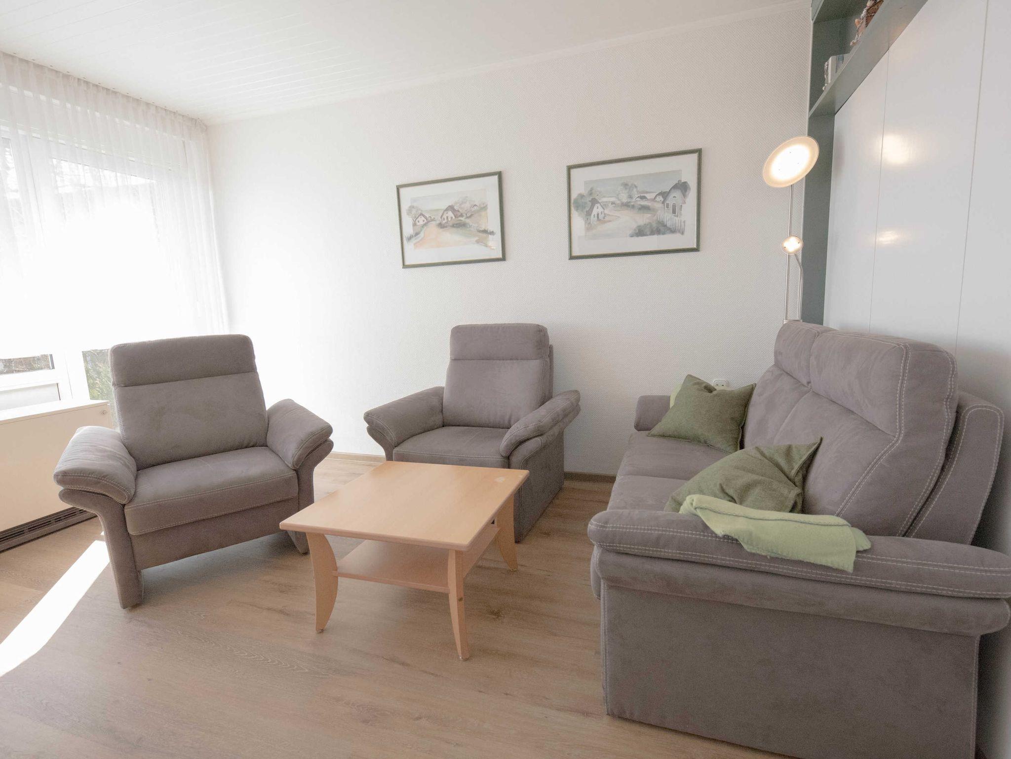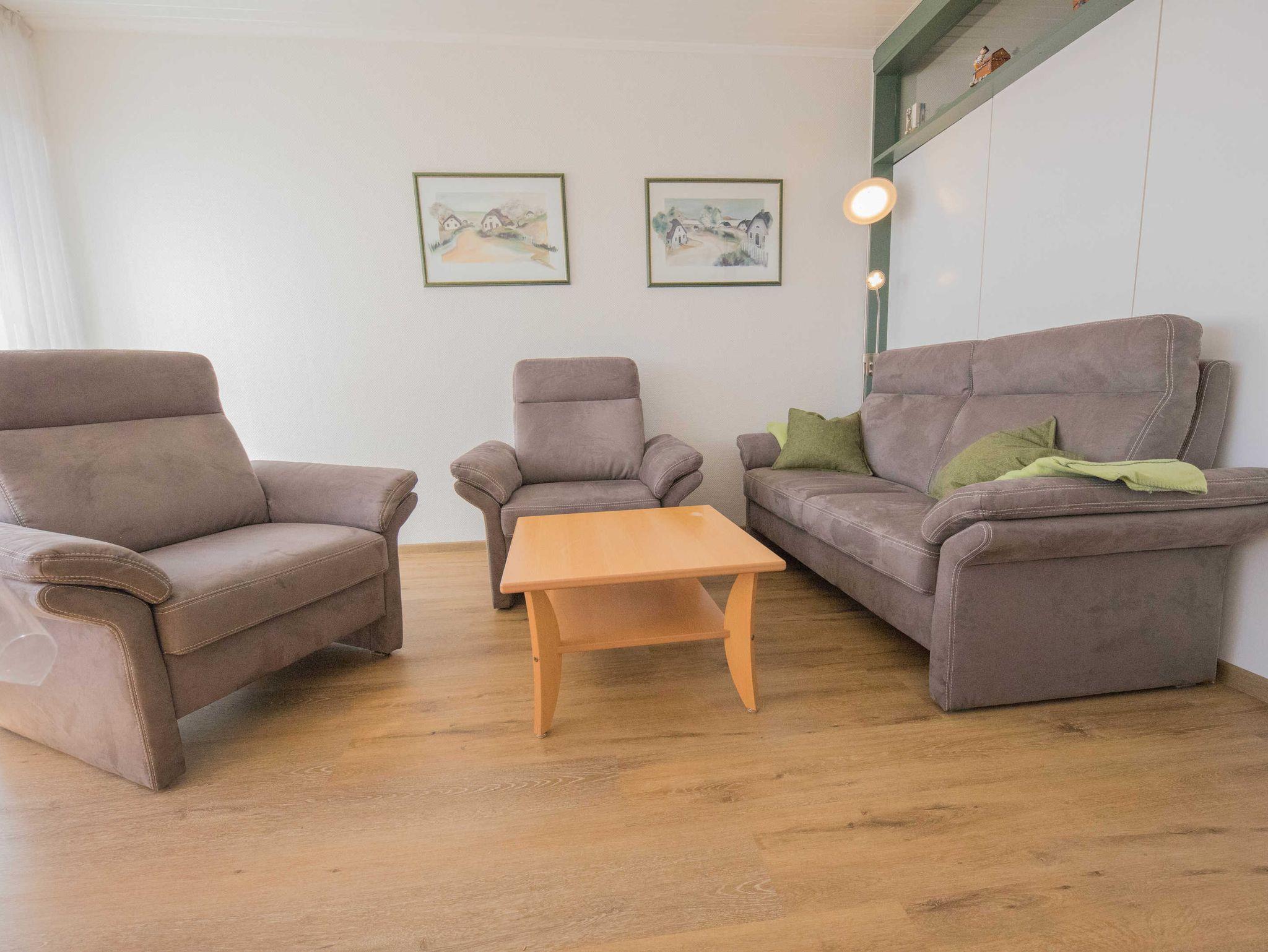 Die Ferienwohnung Tillmann befindet sich in der ersten Etage und verfügt über zwei Schlafzimmer mit jeweils zwei Einzelbetten. Im Wohnzimmer mit direktem Zugang auf den Balkon mit Blick auf den Deich ist der Essplatz integriert. Dem Wohnbereich schließt sich die Küche an. Das Tageslichtbadezimmer verfügt über eine Dusche und ein WC.