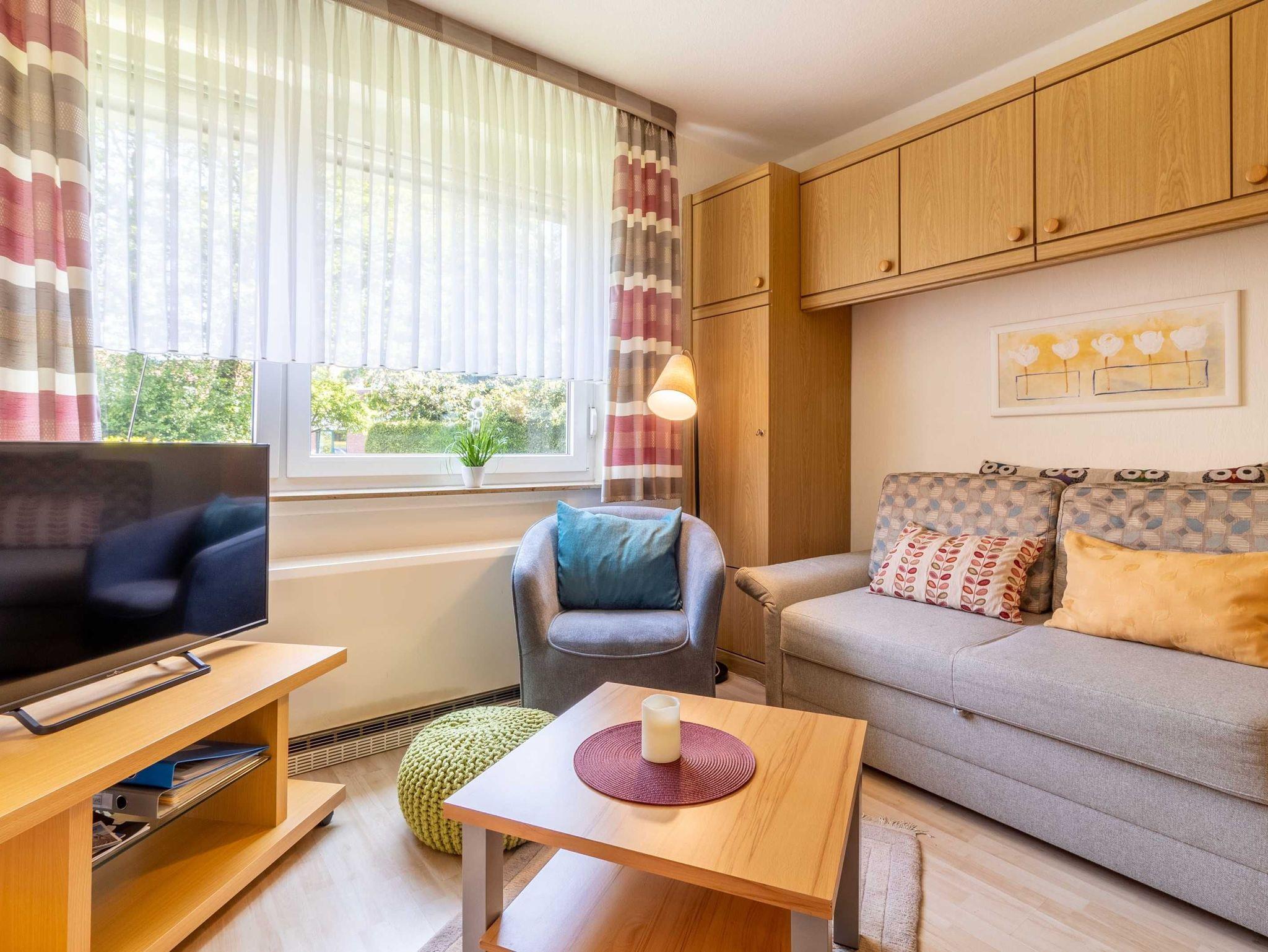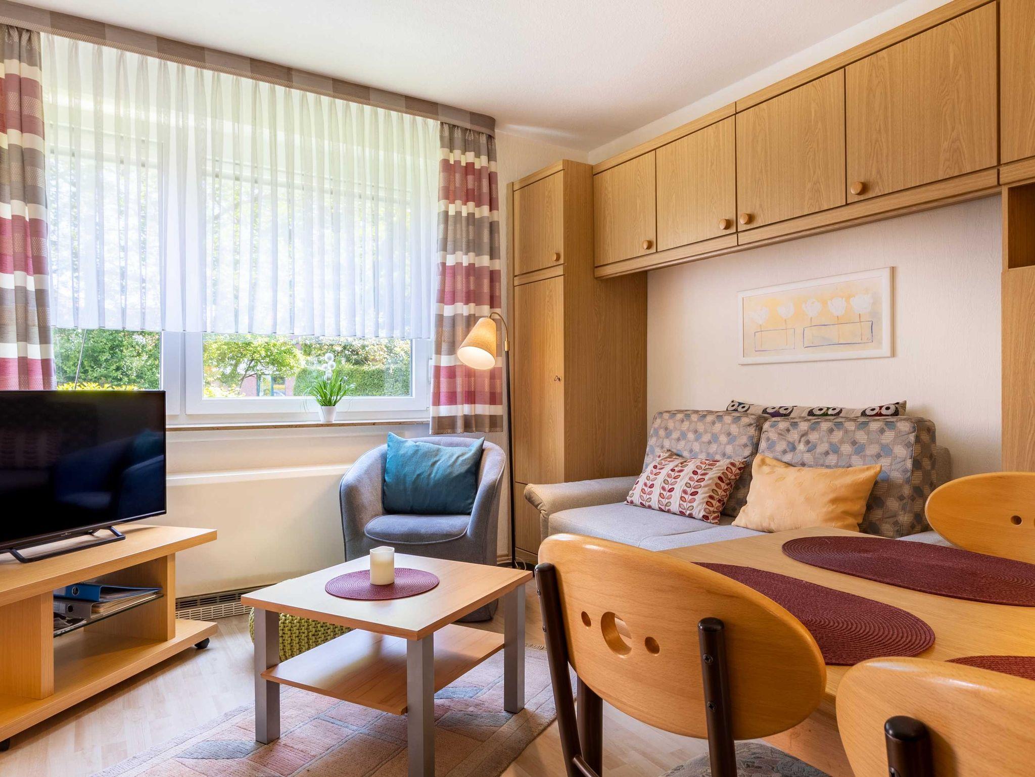 Die ebenerdige, gemütlich eingerichtete Ferienwohnung Wolff ist 30 m² groß und befindet sich zentral in Horumersiel im Fasanenweg in ruhiger Sackgassenlage. Die Ferienwohnung ist mit viel Liebe eingerichtet und bietet zwei Personen ausreichend Platz für einen erholsamen Urlaub am Meer. Die kleine, offene Pantryküche ist im Wohnzimmer integriert. Sie verfügt über ein Kochfeld mit vier Herdplatten, einen Kühlschrank, Wasserkocher, Kaffeemaschine und Toaster. Das Schlafzimmer mit Doppelbett kann durch eine Schiebetür vom Wohnbereich abgetrennt werden. Das Wohnzimmer mit TV und Satellitenempfang bietet ein Sofa und einen gemütlichen Fernsehsessel. Das Badezimmer verfügt über eine Dusche und WC. Ein Balkon schließt sich dem Schlafzimmer an und lädt an sonnigen Tagen zum Frühstück im Freien ein. Der Strand sowie alle Einrichtungen des täglichen Bedarfs können Sie bequem zu Fuß erreichen. Ein eigener Parkplatz befindet sich direkt am Haus. Die Wohnung verfügt über eine Stromheizung, die Böden sind im Wohn- und Schlafraum mit Laminat ausgelegt.