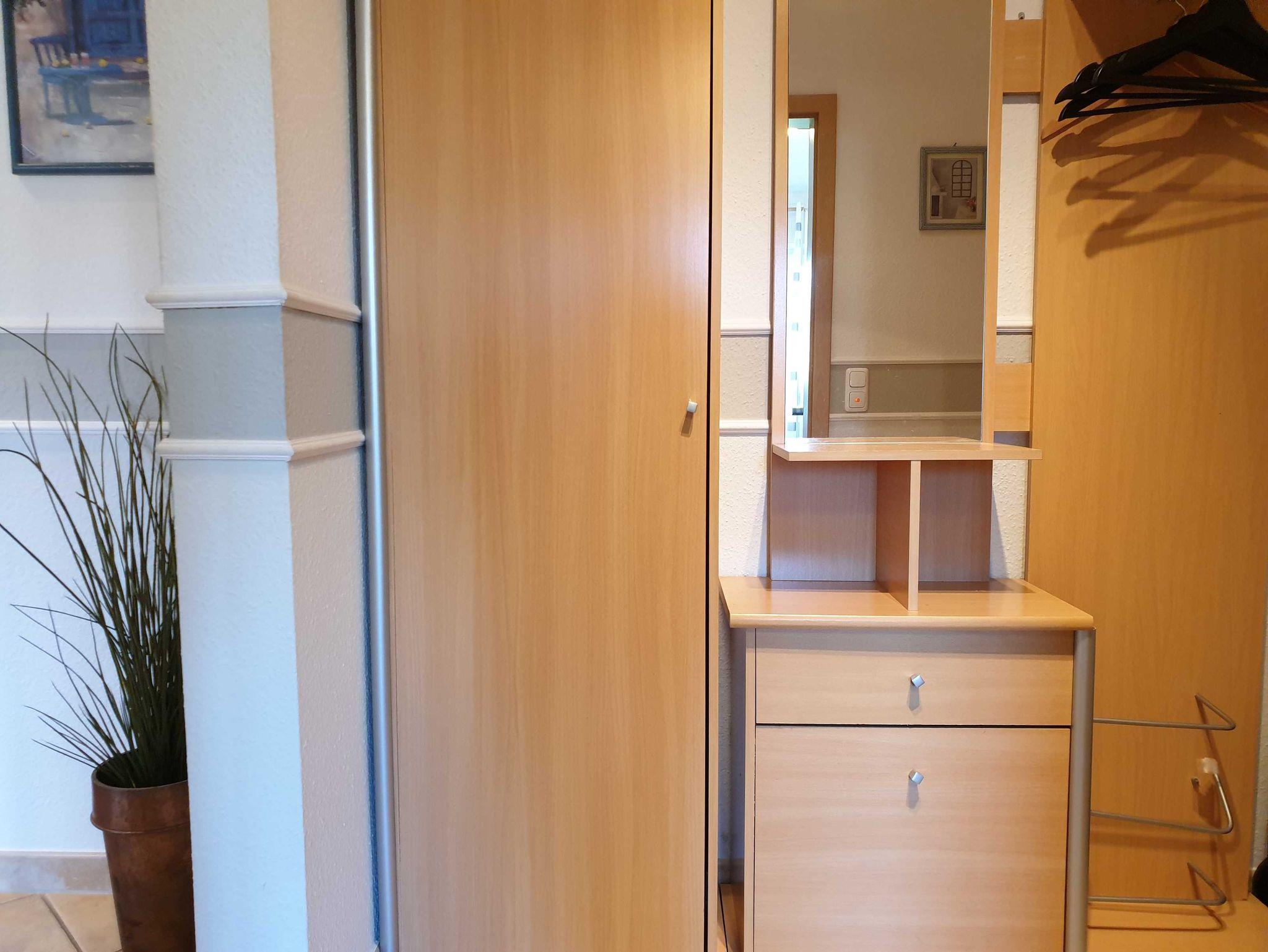Die Ausstattung beinhaltet außerdem ein Badezimmer mit WC und Dusche, einen Flur mit Garderobe und einen Abstellraum mit einem Kinderreisebett für Ihre Bequemlichkeit.