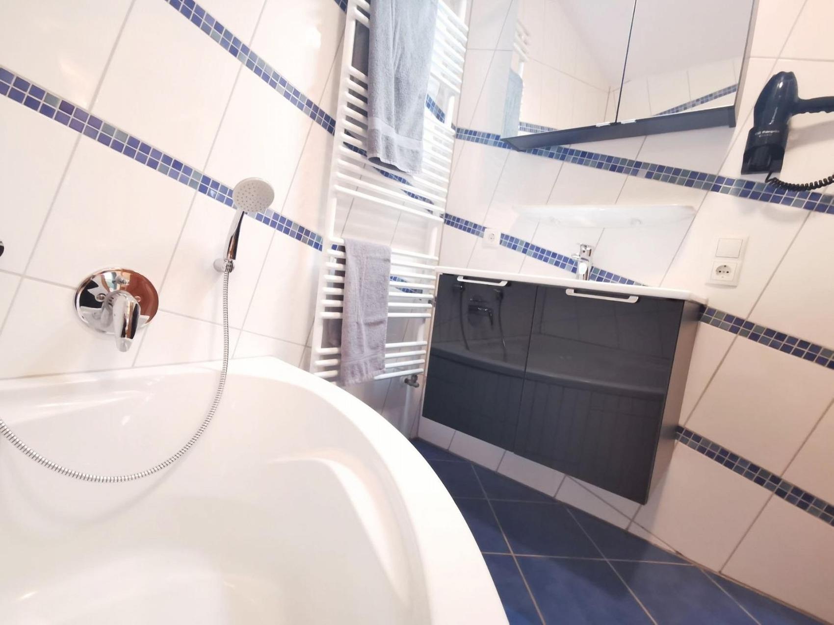 Auf 70m² finden Sie in unserer Ferienwohnung Nr.6 -Nordseetraum - alles was man für den komfortablen Urlaub benötigt. Angefangen mit dem Badezimmer: Sofort fällt ins Auge die außergewöhnliche Fliesenanordnung. Wir versichern Ihnen das man sich nach einem kurzen Augenblick daran gewöhnt hat. Eine Eckbadewanne und eine ebenerdige Dusche sind hier eingebaut. Neben dem Fön gibt es in diesem Badezimmer auch einen Handtuchtrockner. Ausgelegt ist das gesamte Badezimmer mit einer Fußbodenheizung. Das WC befindet sich in einem separaten Gäste WC. Das erste Schlafzimmer ist mit einem Doppelbett, einem Kleiderschrank sowie einem Fernseher ausgestattet. Das zweite Schlafzimmer hat zwei Einzelbetten sowie ei-nen Kleiderschrank. Dieses wird meist als Kinderzimmer genutzt. Ein großer offener Raum in dem sich Küche - Essbereich und Wohnzimmer befinden, bietet Licht von früh bis spät mit Zugang zur Terrasse und dem eigenen Garten. Auf der Terrasse haben wir einen Tisch mit 4 Stühlen bereitstehen. Der große Garten lädt zum Sonnenbaden oder gemütlichen Beisammensein zu jeder Tageszeit ein. Die Küche ist komfortabel ausgestattet mit einem Kühlschrank & Gefrierfach, einem Herd mit Ceranfeld, Backofen, Wasserkocher, Toaster, einer Kaffeemaschine und vielem mehr was man für die Zubereitung des Frühstücks, oder dem Mittagessen benötigt. Eine Spülmaschine lässt das Geschirr wieder ohne große Arbeit sauber werden. Ein Tisch mit 4 Stühlen sind vor Ort um gemeinsam zu Essen - oder für die Gesellschaftsspiele am Abend.Eine Ledercouch- Garnitur bietet genügend Platz für die ganze Familie vor dem Fernseher. Der komplette Wohn-, Ess- und Küchenbereich ist mit Fußbodenheizung ausgestattet. Hinzukommt eine Waschmaschine in einem separaten Abstellraum in der Ferienwohnung. Ein PKW-Stellplatz ist unmittelbar am Haus. Unsere Ferienwohnung befindet sich im Strandweg 3 - in unmittelbarer Nähe zum Badestrand Horumersiel.