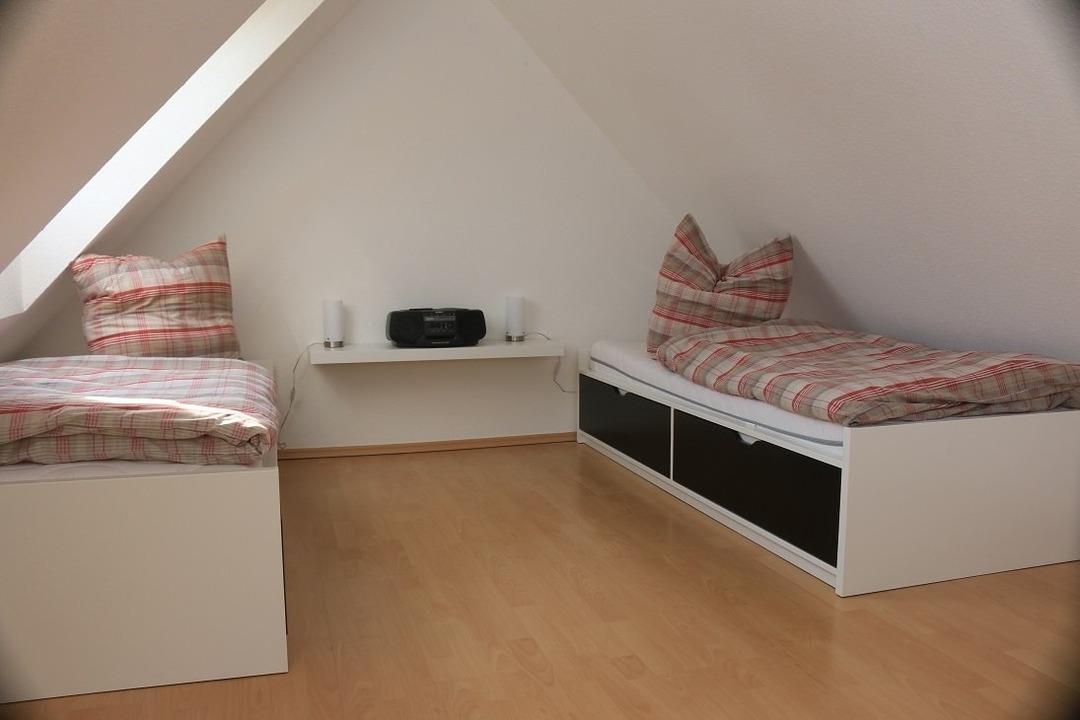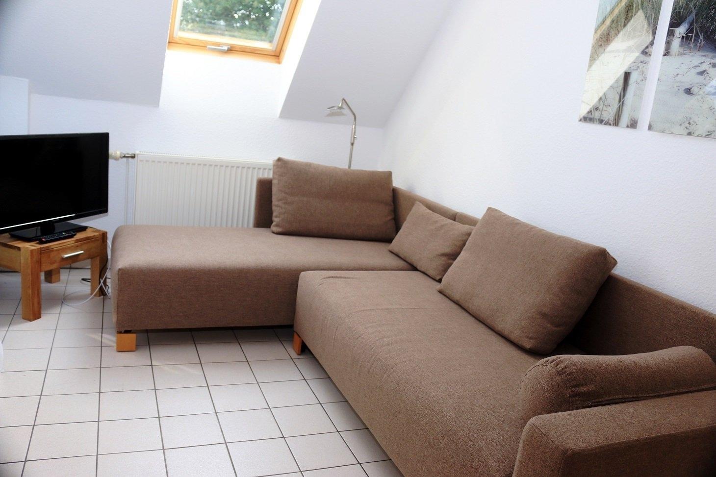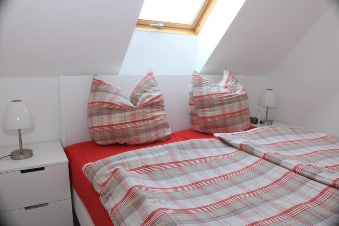 Unsere Ferienwohnung befindet sich in der zweiten Etage des Apartementhauses im Strandweg 5 und bietet Platz für 4 Personen.Die Wohnung ist in zwei Etagen aufgeteilt. In der unteren Etage (2.OG) befindet sich ein Tageslicht-Badezimmer mit Dusche, WC und einem Waschbecken. Das in weiß gehaltene Schlafzimmer mit modernen Schlafmöbeln, bietet mit dem Doppelbett Platz für entspanntes Schlafen. Die Küchenzeile ist ausgestattet mit Herd, Mikrowelle, Senseo Kaffeemaschine, Kühl-Gefrierkombi und allem üblichen Zubehör. Der Esstisch bietet Platz für 4 Personen. Eine Eck-Couch mit TV Gerät runden den Wohn-Essbereich ab. Von hier aus gelangen Sie sowohl auf den Balkon, als auch in die obere Etage, wo sich ein weiteres Schlafzimmer mit zwei Einzelbetten befindet.