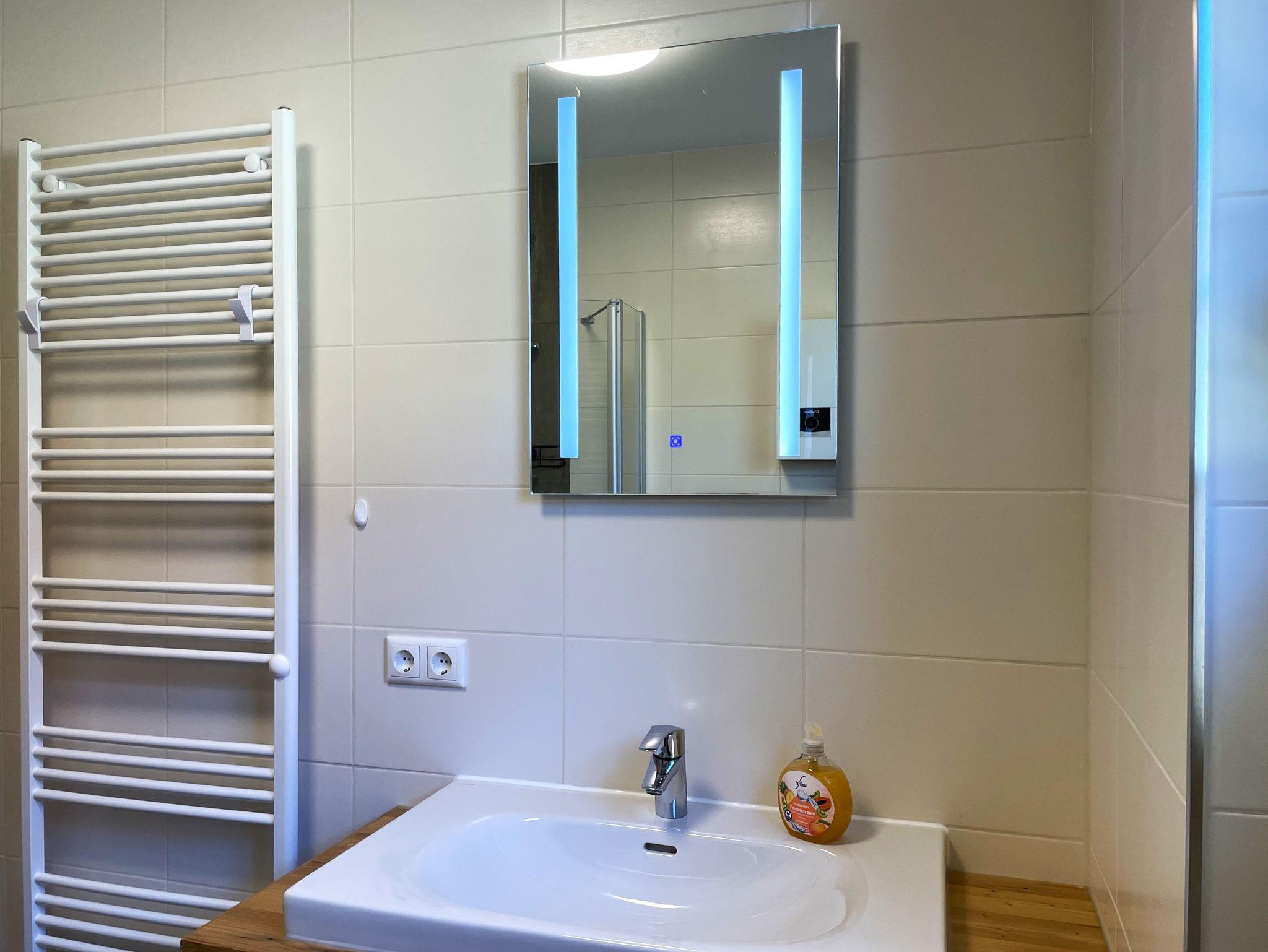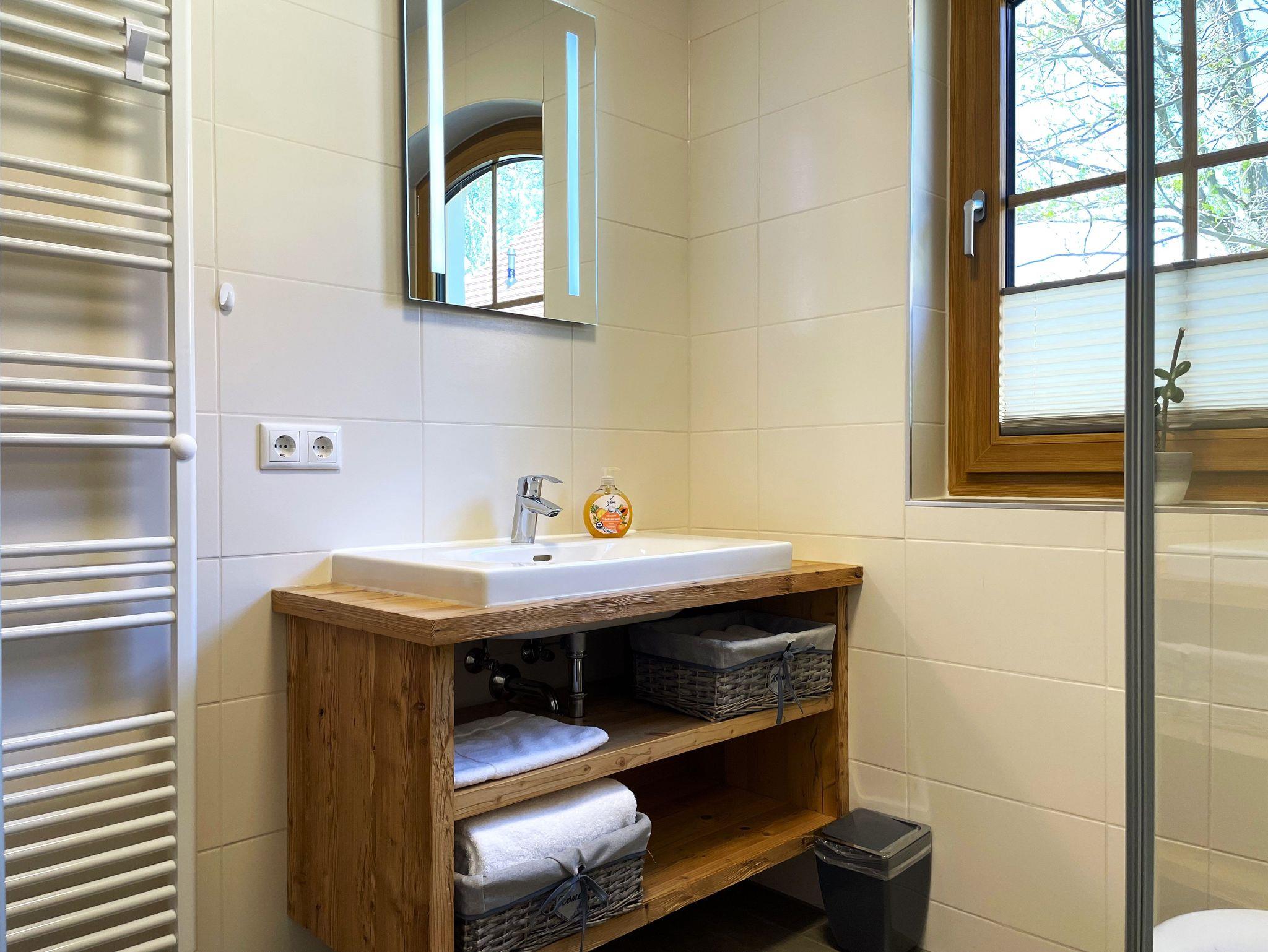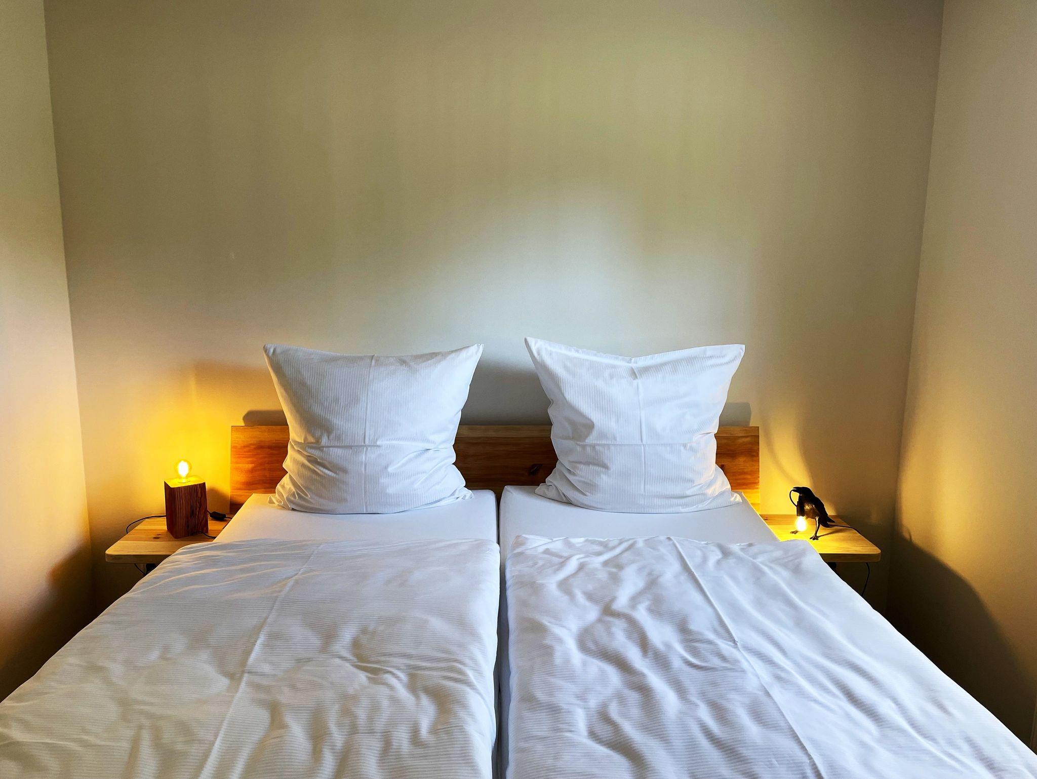 Die zwei Schlafzimmer sind mit handgefertigten Doppelbetten oder getrennt stehenden Einzelbetten ausgestattet. Die Betten sind bereits bezogen und versprechen erholsamen Schlaf. Das moderne Badezimmer bietet eine ebenerdige Dusche, einen Waschtisch mit Spiegel, einen Handtuchwärmer und ein WC.