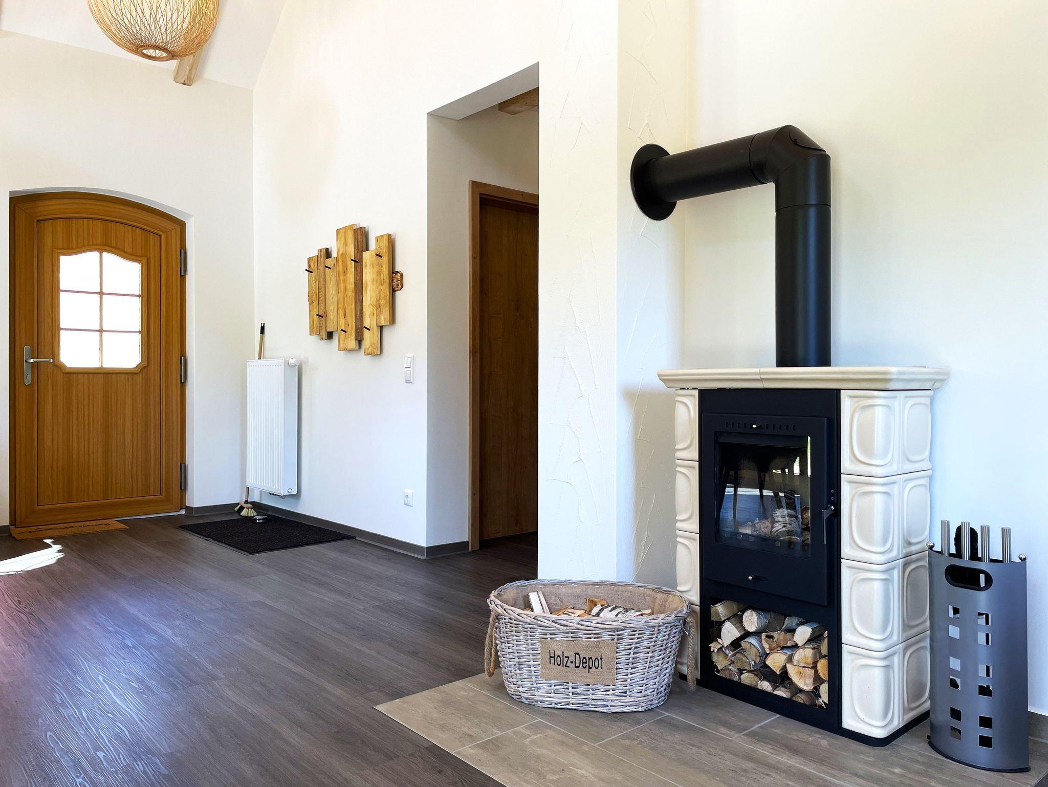 Der offene Dachstuhl verleiht dem Ferienhaus eine optische Größe und schafft eine natürliche, rustikale und stilvolle Atmosphäre. Die verarbeiteten Holzbalken tragen dazu bei, dass sich Gäste sofort wohlfühlen. Ein besonderes Highlight ist der Kamin, der zu jeder Jahreszeit für Gemütlichkeit und wohlige Wärme sorgt.