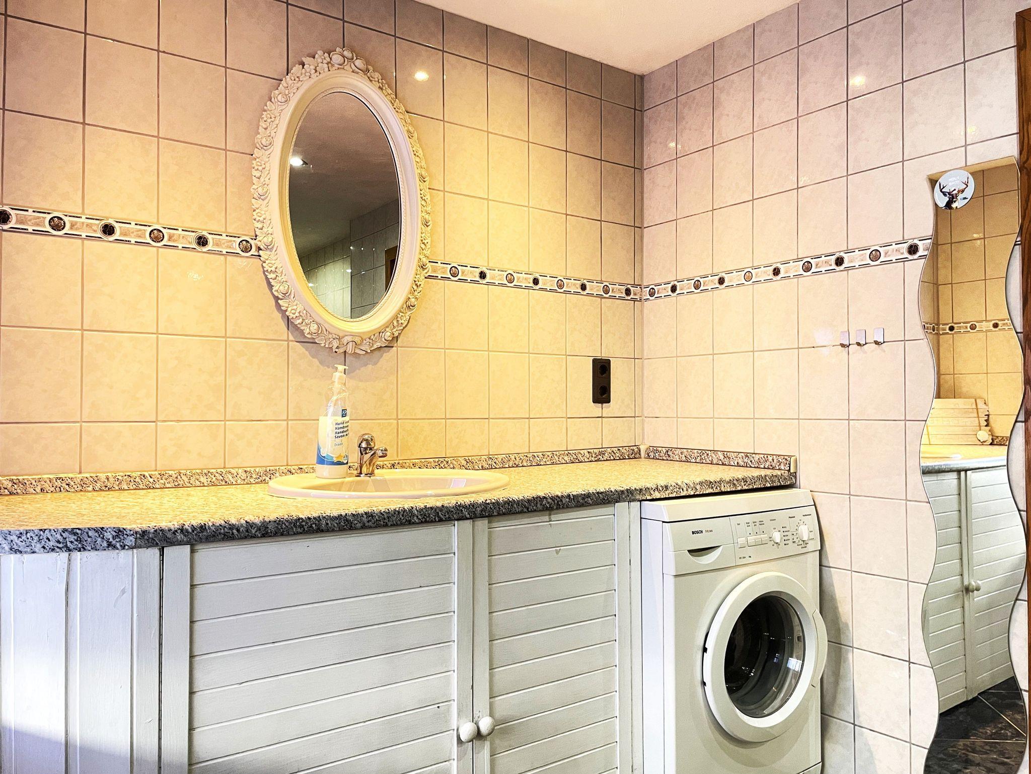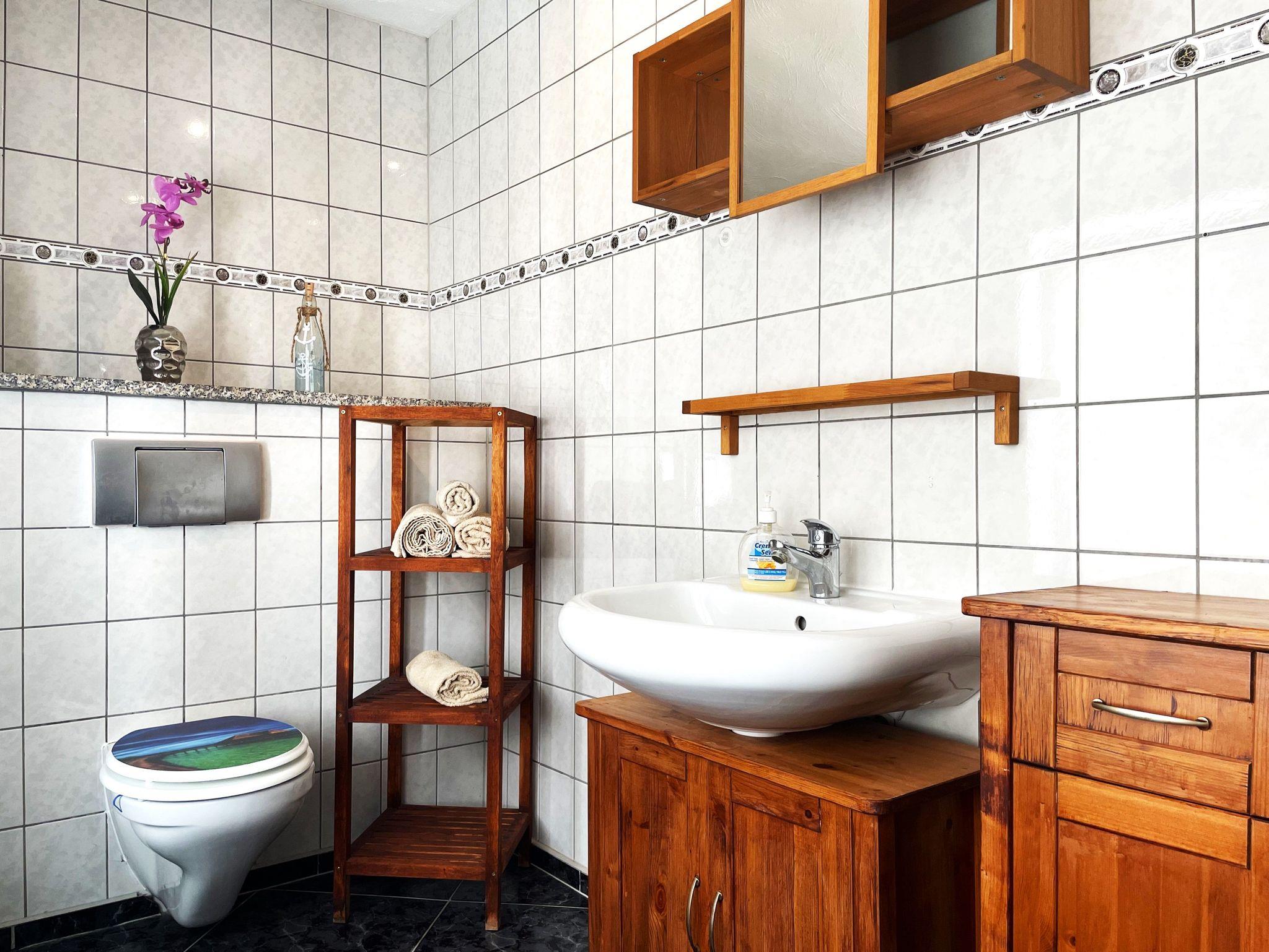 Die Ferienwohnung verfügt über ein Badezimmer mit Waschtisch und WC. Ein weiteres Badezimmer bietet eine Eckbadewanne und eine Dusche sowie eine Waschmaschine für Ihren Komfort.