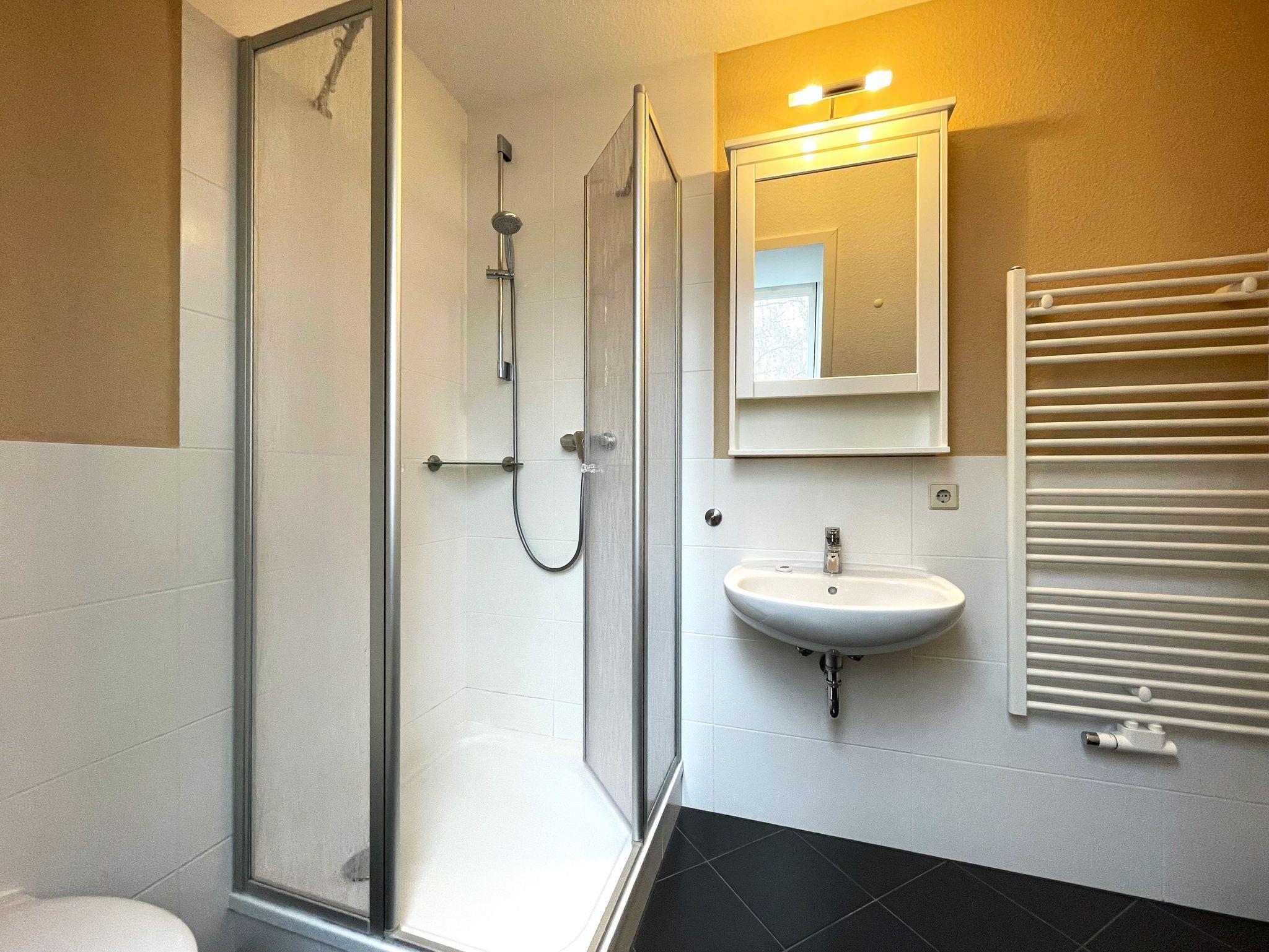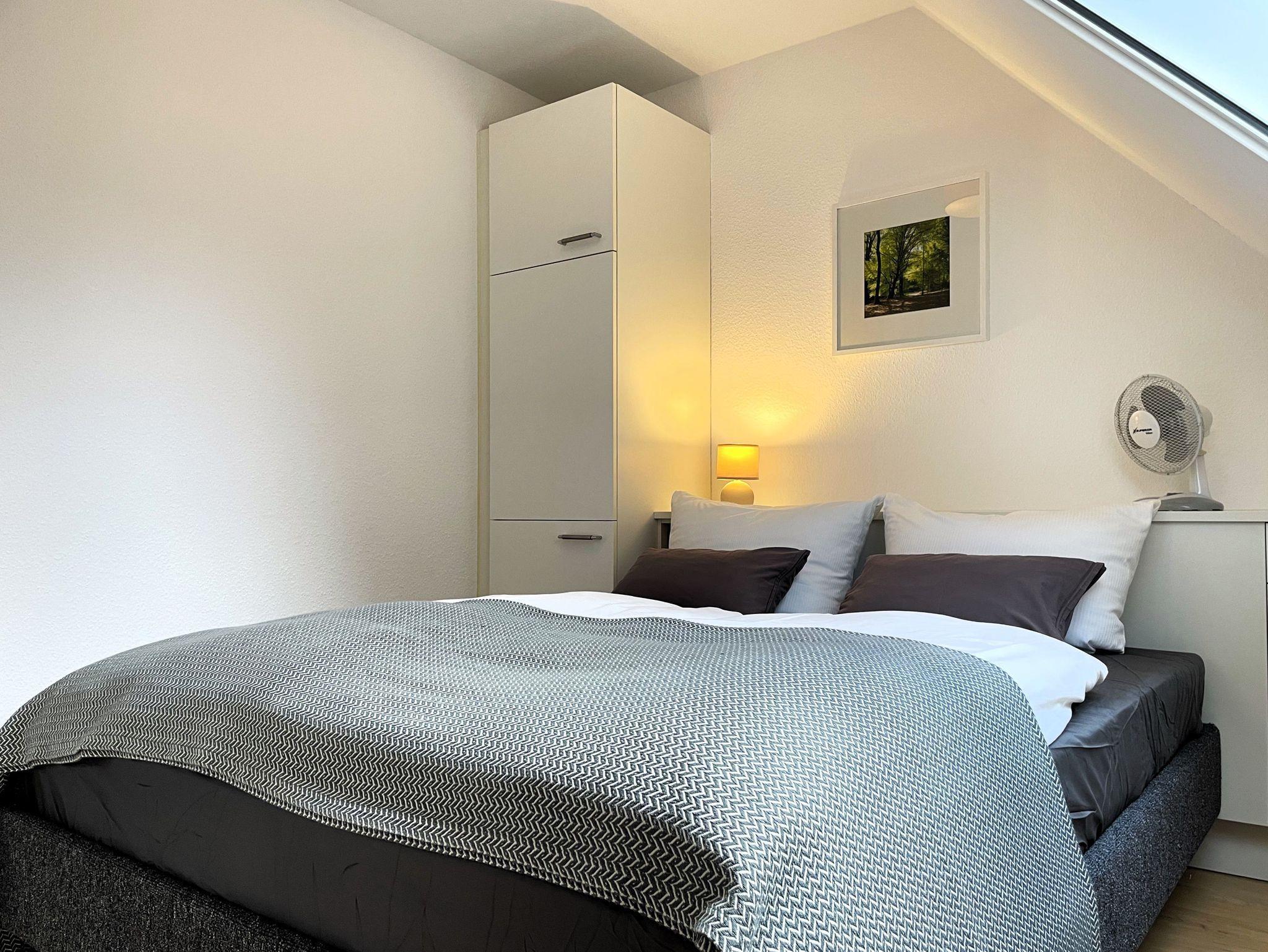 Das separate Schlafzimmer ist mit einem französischen Doppelbett und praktischen Schrankelementen ausgestattet. Das Badezimmer verfügt über eine Dusche, ein WC und ein Waschbecken und rundet das komfortable Ambiente der Ferienwohnung ab.