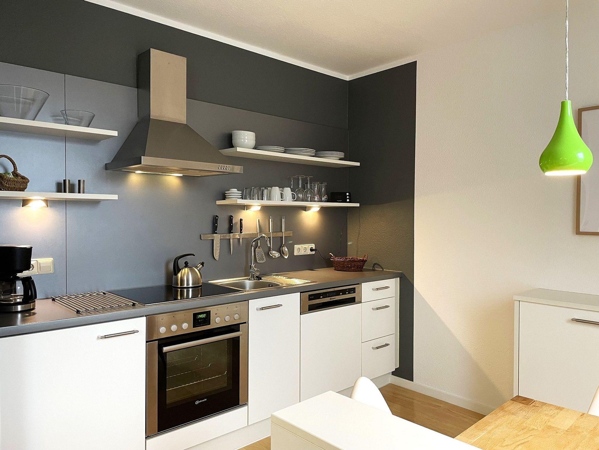 Der offene Wohnbereich umfasst eine modern ausgestattete Küche mit Backofen, Gefriermöglichkeit, Kaffeemaschine, Kühlschrank, Spülmaschine und Toaster sowie eine gemütliche Essecke. Hier können Sie gemeinsam kochen und die Mahlzeiten genießen.