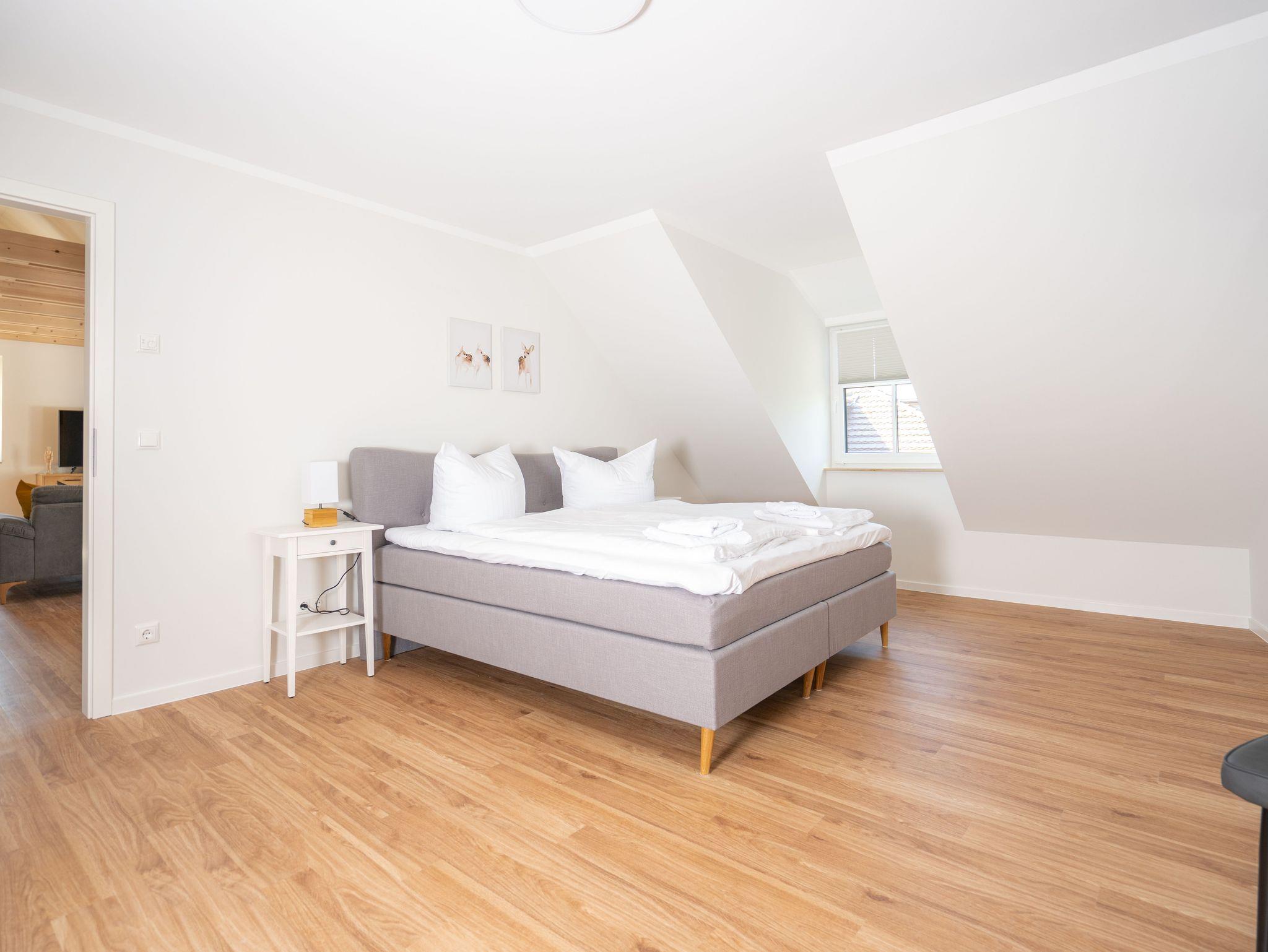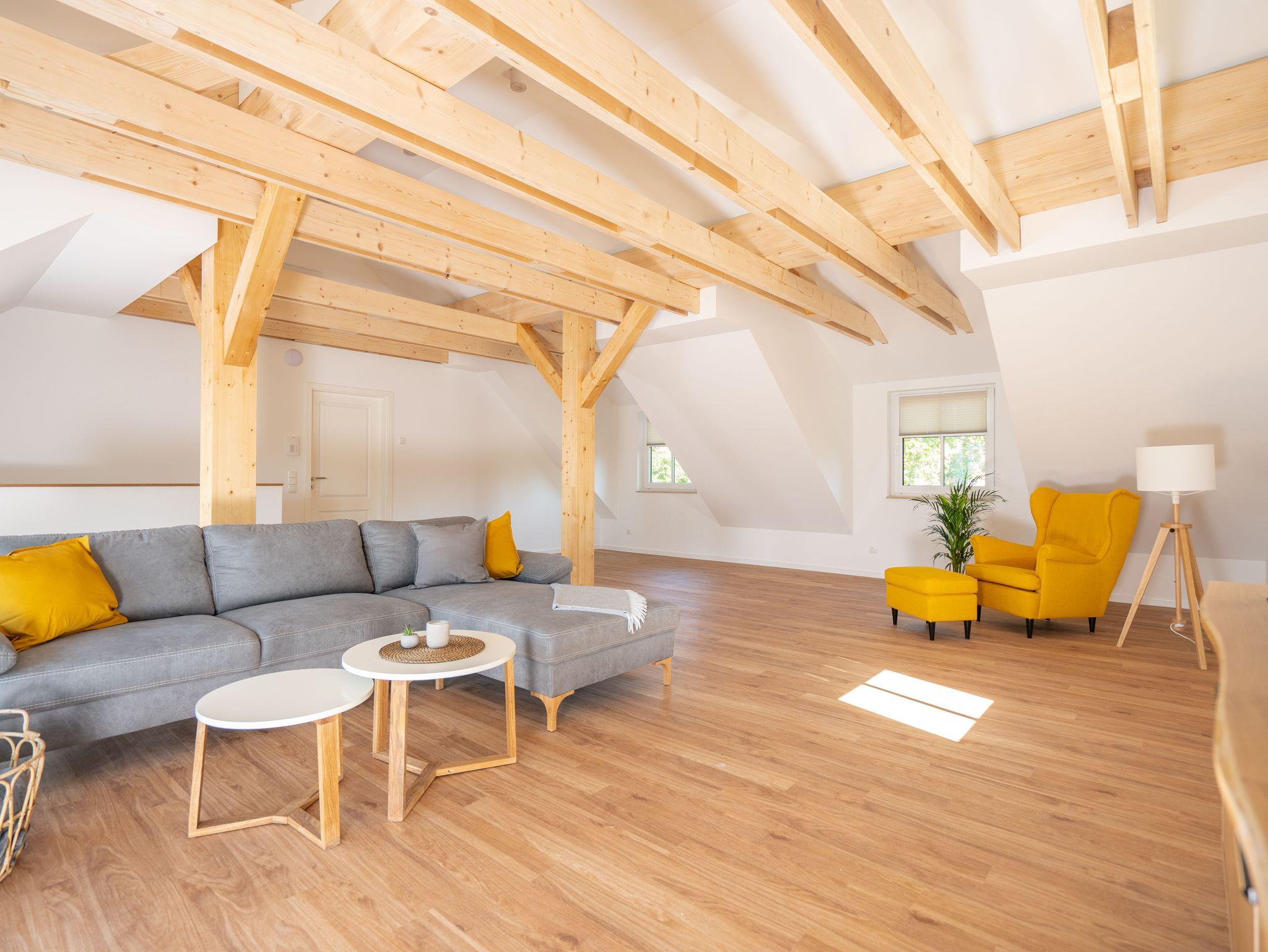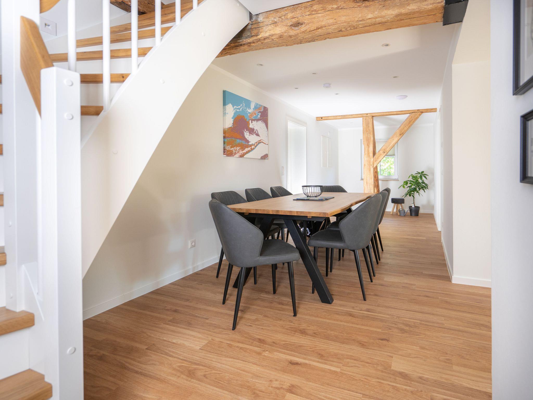 Unsere Helga ist das Schmuckstück im Burghof. Mit ihren 175m² ist es unsere größte und wohl auch vielfältigste Wohnung mit allerbestem Blick über die Altstadt und den Zoo von Hoyerswerda. Die Maisonette verfügt über 3 Schlafzimmer. Zwei der Schlafzimmer sind jeweils mit eigenem Badezimmer ausgestattet, das andere Schlafzimmer nutzt das Gemeinschaftsbad. Eines der Schlafzimmer bietet mit einem zusätzliches Einzelbett noch mehr Platz. Helga ist perfekt für Gruppen oder große Familien. Vom Balkon kann man wunderbar ins Grüne schauen. Der große Esstisch direkt neben der Küche bietet genug Platz für gemütliche Kochabende. In der zweiten Etage gibt es neben der kuscheligen Leseecke mit Sessel und Hocker eine große Wohnlandschaft zum Lümmeln. Die helle Küche ist top ausgestattet und lädt zum gemeinsamen Kochen ein. Fachwerkwände und viele Balken machen diese wunderschöne Wohnung zu einem gemütlichen Zuhause auf Zeit.