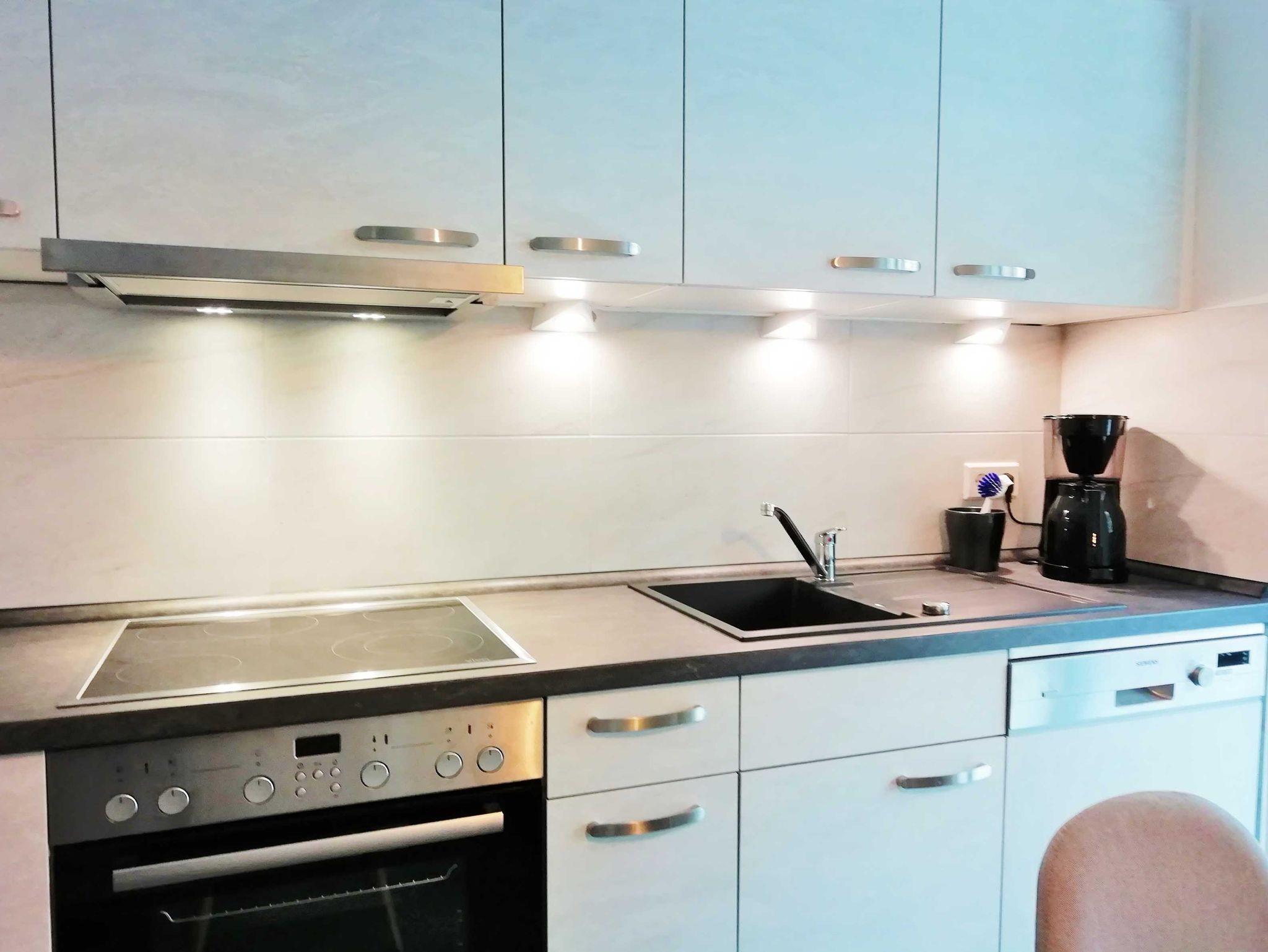 Es steht eine separate Küche mit Sitzgelegenheiten zur Verfügung. Die Küche ist mit einer Kühl- Gefrierkombination, Geschirrspüler, Herd mit Backofen, Kaffeemaschine und Wasserkocher, sowie einer Mikrowelle ausgestattet. Von der Küche aus findet man den Zugang zu dem sehr geräumigen Balkon.