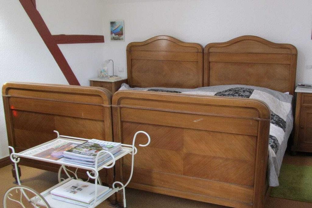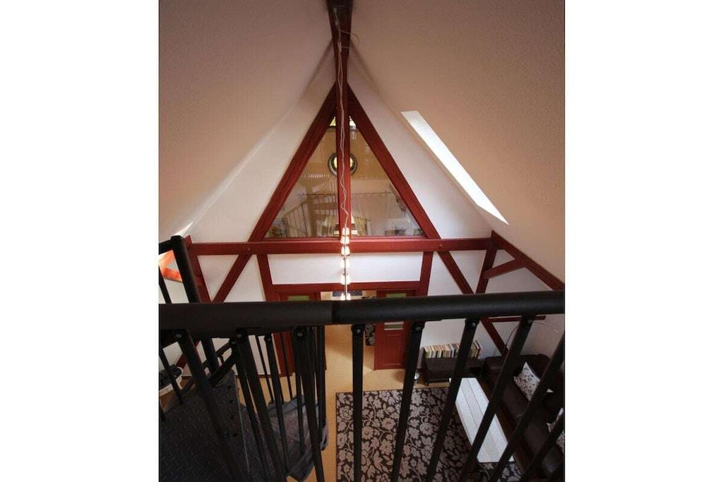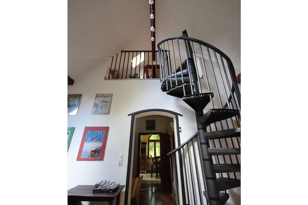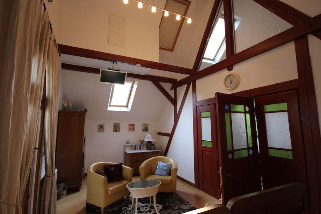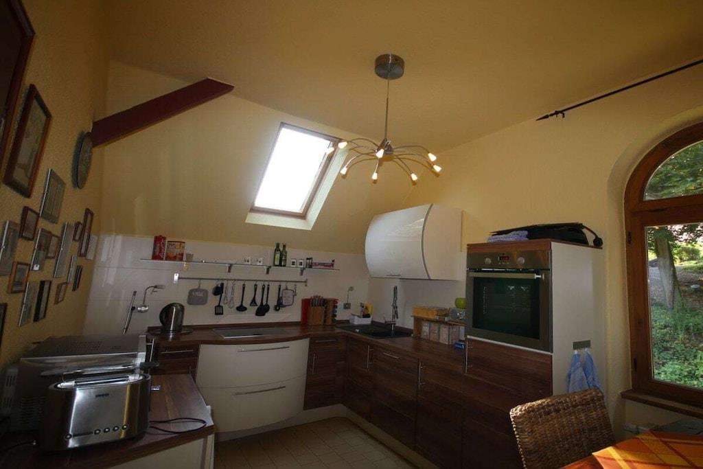 Das Kutscherhaus am Weiher verfügt über zwei Ferienwohnungen, Die Ferienwohnung Rosenrot ist ideal für Familien mit Kindern. Der Schlafbereich für die Kinder ist über eine Wendeltreppe zu erreichen und bietet Schlafmöglichkeiten für bis max. 4 Personen. Die großzügige Terrasse ist vom Elternschlafzimmer zu begehen und lädt zum Entspannen und gemütliche Abende im Sommer ein. Im Wohnzimmer befindet sich neben einer großen Eckcouch ein großer Tisch zum essen und spielen. Spiele sowie DVDs können gegen ein Pfand entliehen werden. Das Tageslichtbad verfügt über eine Badewanne. Die Küche ist komplett ausgestattet und hat eine Sitzmöglichkeit in Form eines Bartisches mit vier Stühlen.
