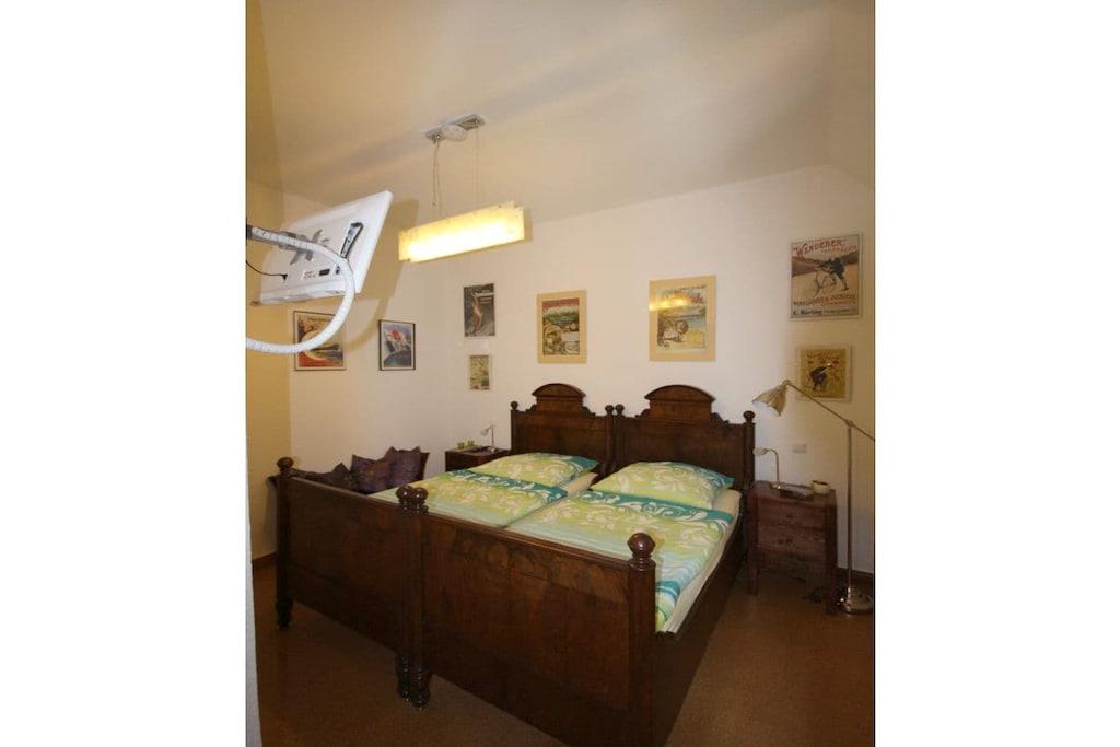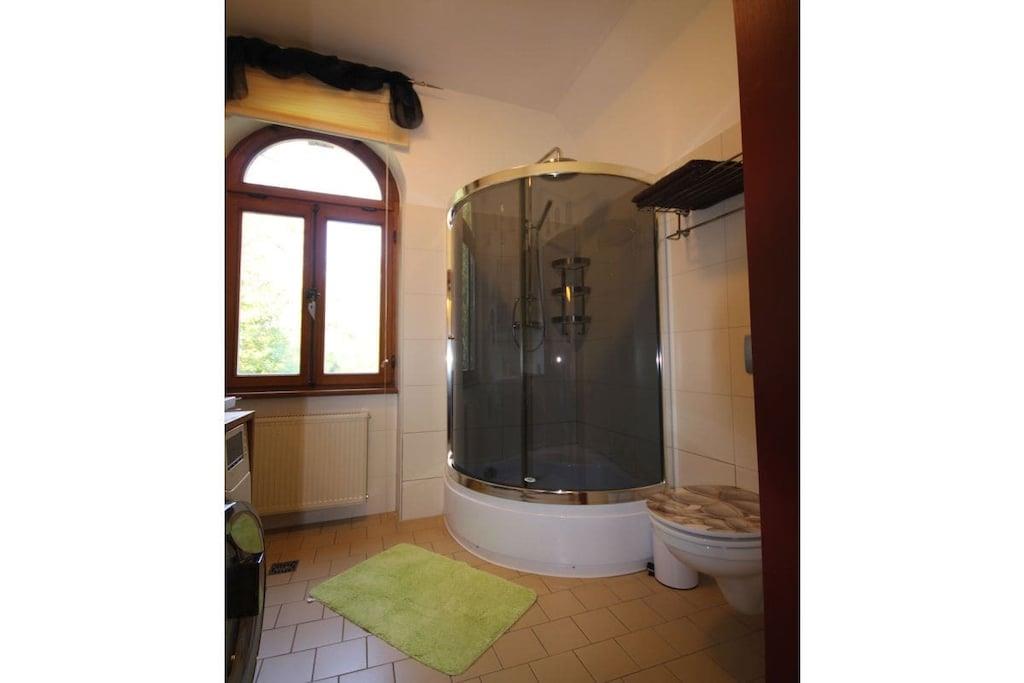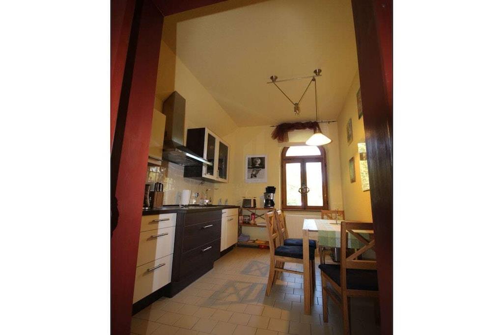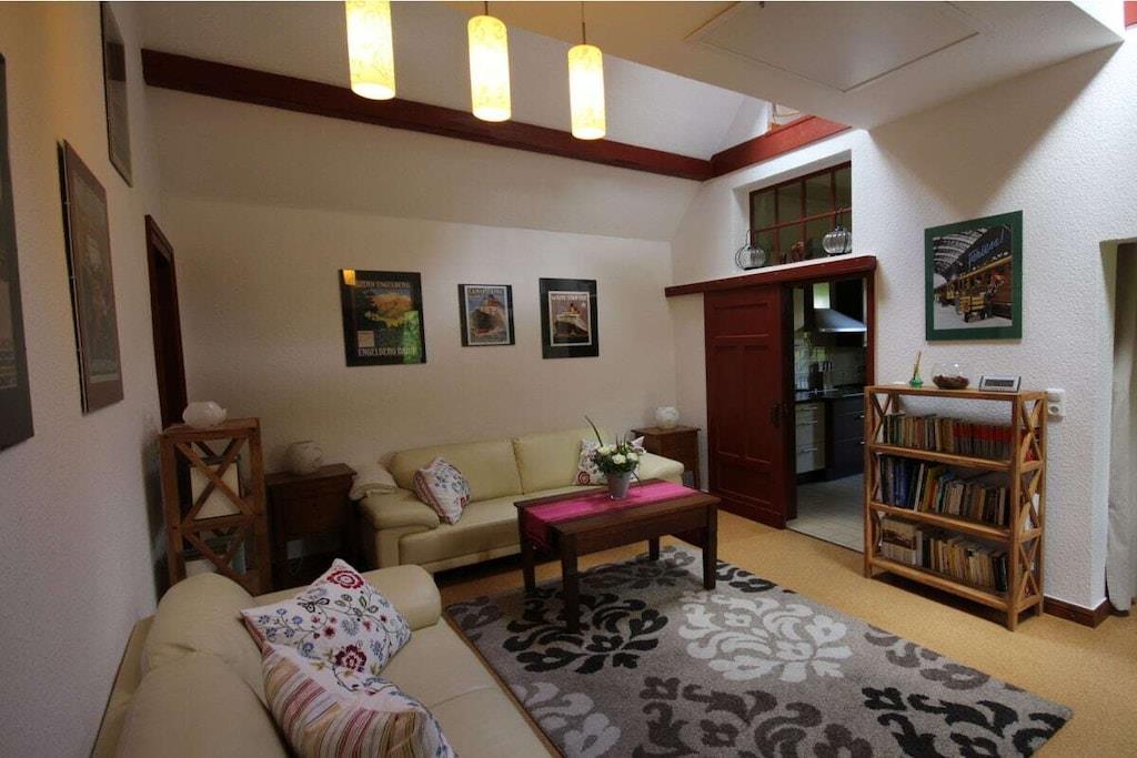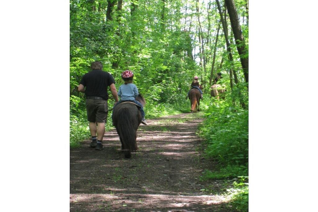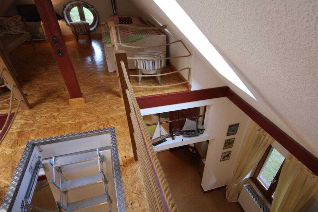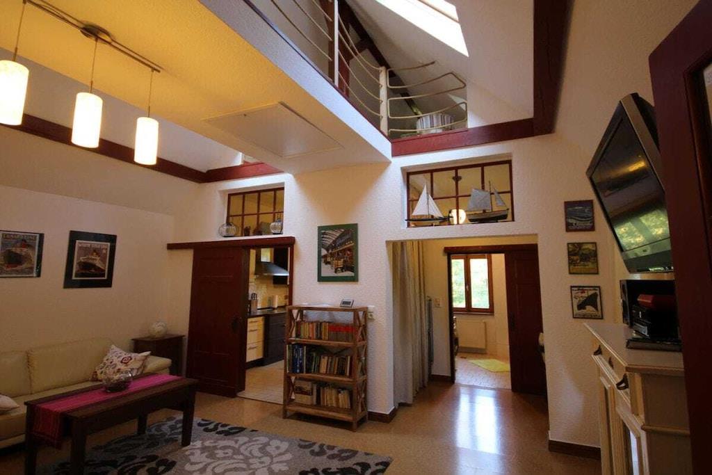 Ferielejligheden ligger på første sal og er ideel til to personer. En barneseng kan stilles til rådighed efter anmodning, eller et ældre barn kan sove i galleriområdet. Dette område er tilgængeligt via en nedtræksstige. Lejligheden har et brusebad, en lys stue og et fuldt udstyret køkken. Lejligheden tilbyder en fantastisk udsigt over den omkringliggende natur. Ud over fjernsynet i stuen er der et andet fjernsyn i soveværelset. En spillekonsol, et udvalg af brætspil og masser af bøger sikrer, at selv dårligt vejr ikke vil dæmpe humøret. Vi tilbyder ponyridning for vores yngre gæster og dem, der elsker heste. Voksne er velkomne til at bruge vores fitnessrum.