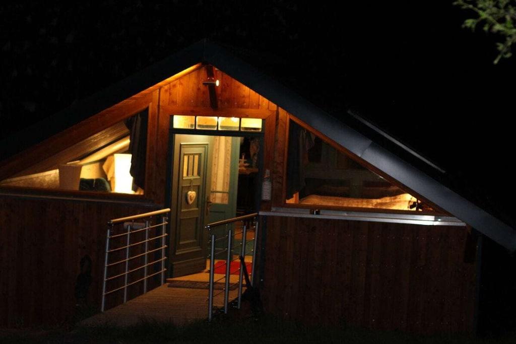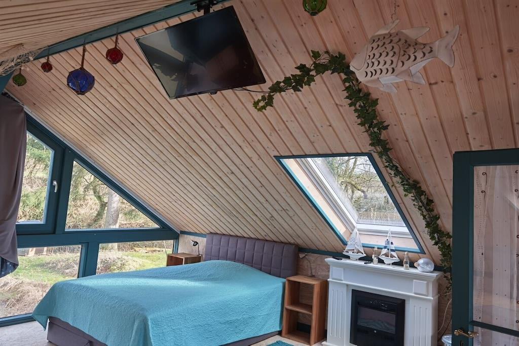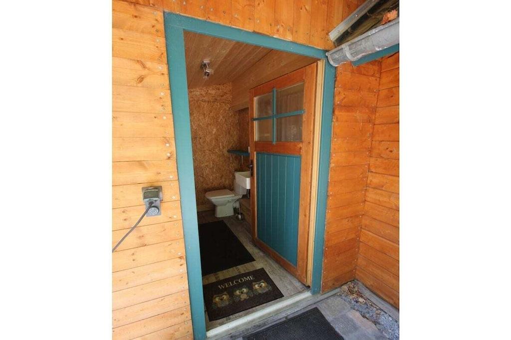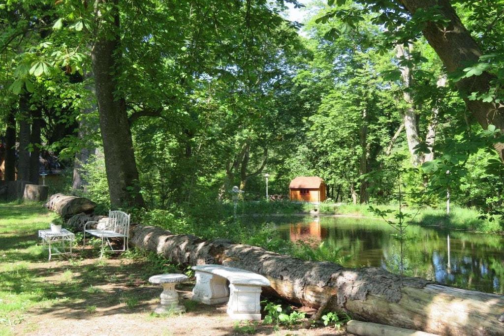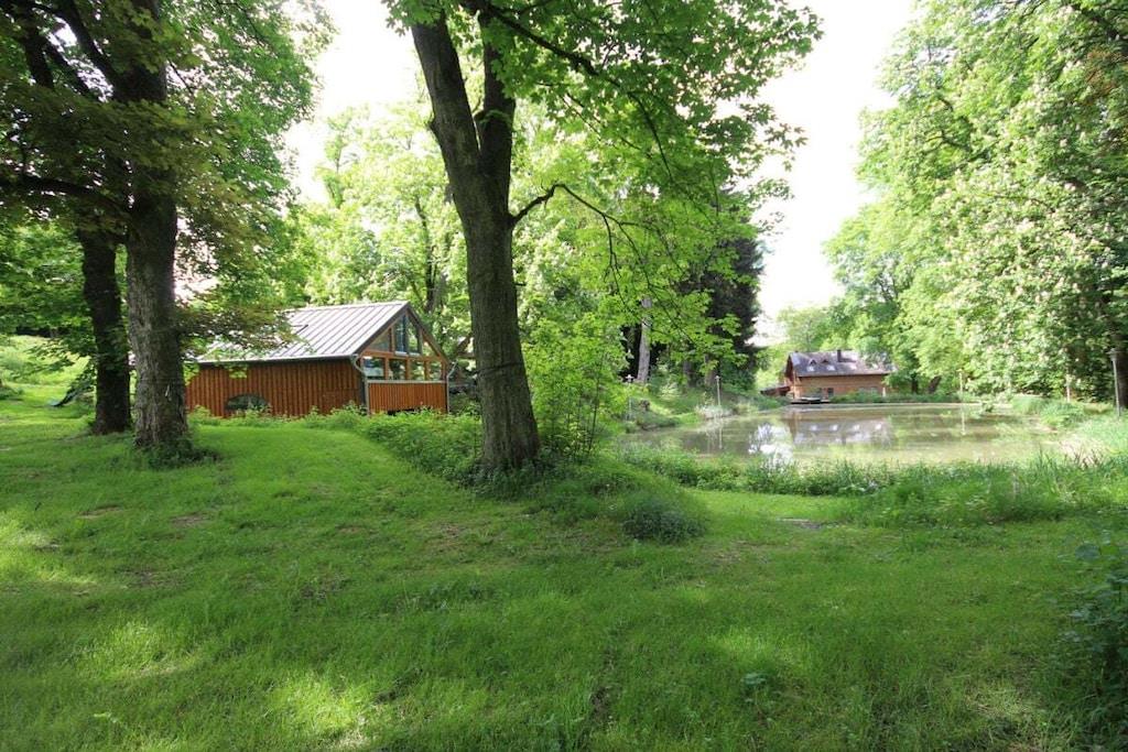 The boathouse is located directly on our pond, with a direct view of it. There is a separate toilet directly opposite the boathouse, exclusively for boathouse guests, which also has a sink. The bathroom and kitchen are not in the boathouse but are separate on the property. The bathroom with shower is about 50 meters away, and the kitchen is about 20 meters away and equipped with a camping stove, dishes, cutlery, etc. Both are for your exclusive use. The boathouse also has a refrigerator, kettle, and pod coffee machine.