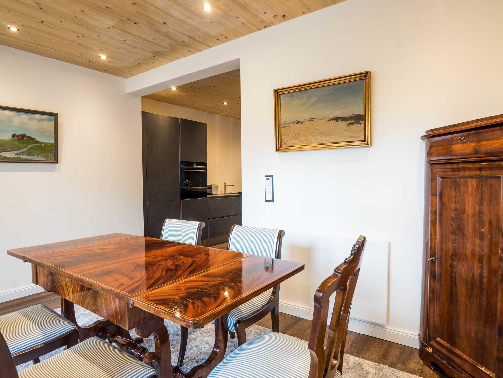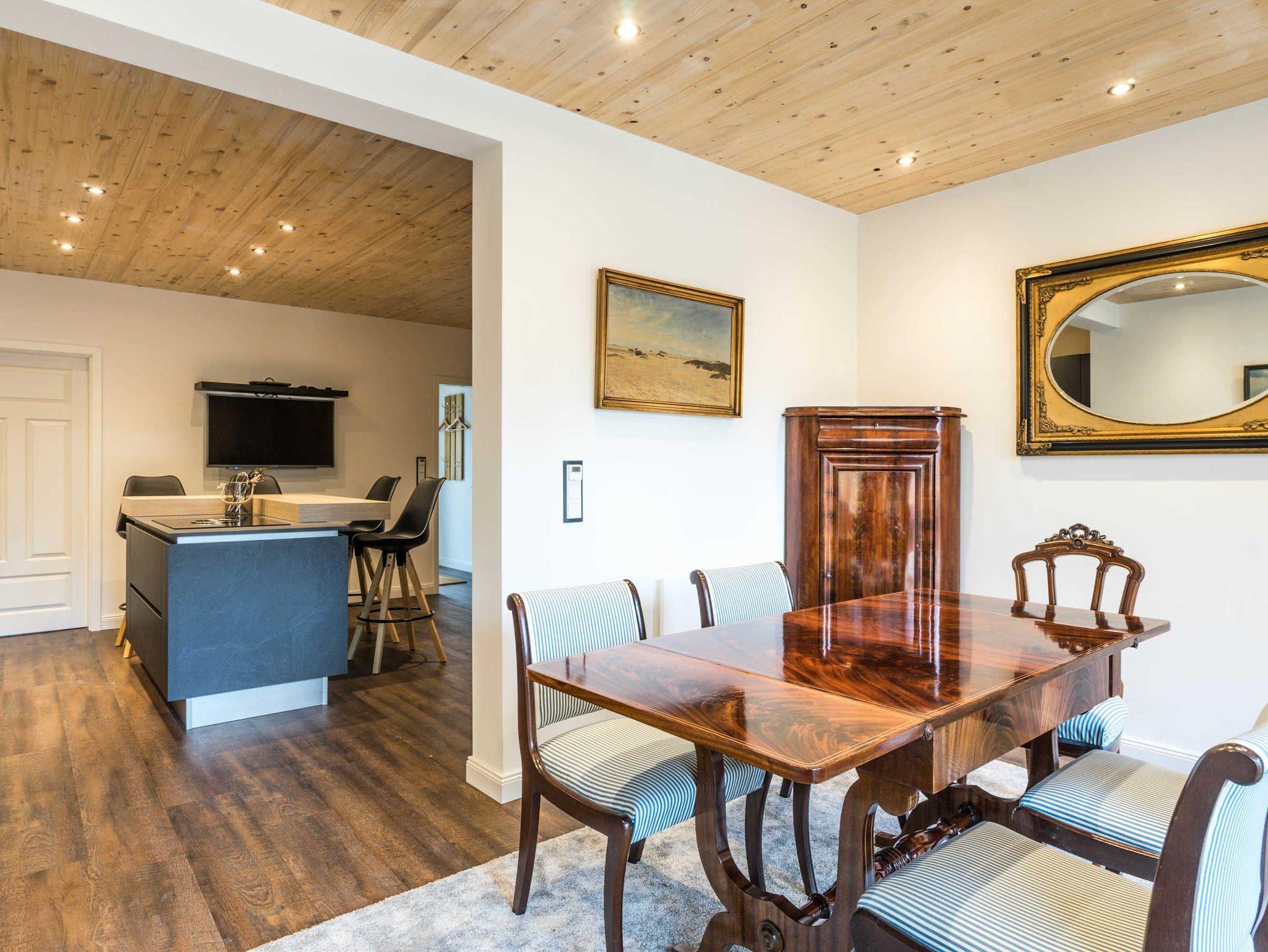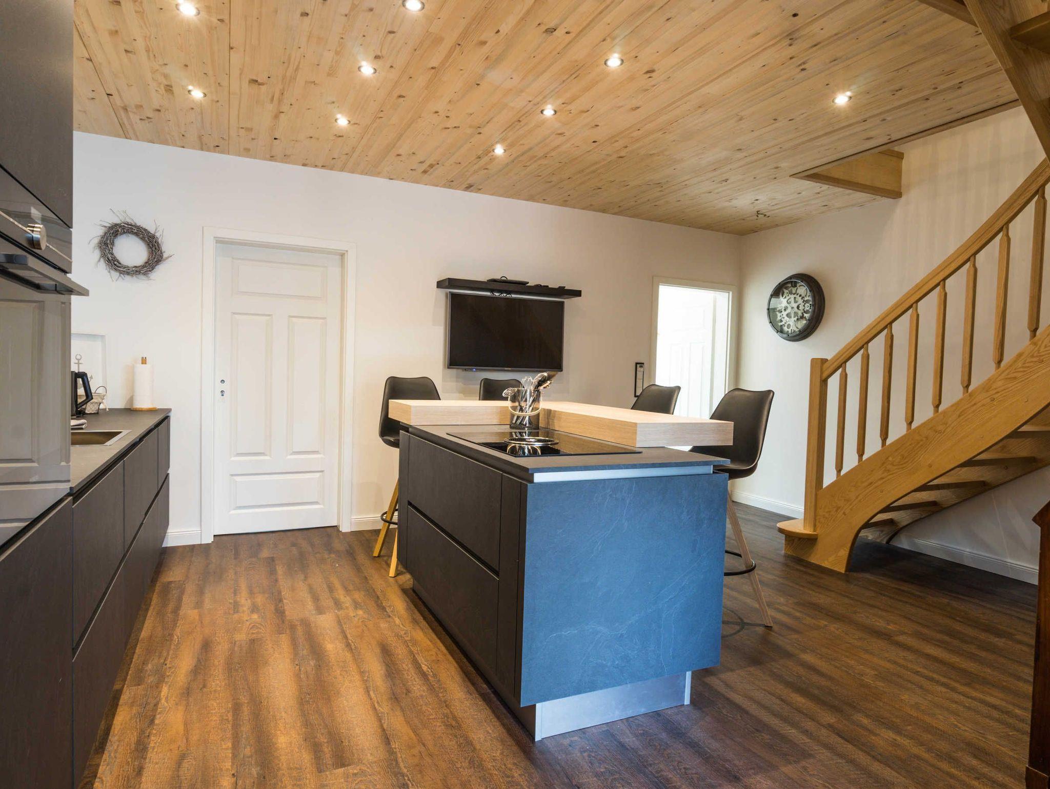 Die offene Küche mit Tresen und 4 Barhockern ist mit Geschirrspüler, Backofen, Induktionskochfeld mit 4 Herdplatten, Kühlschrank mit Gefrierfach, Filterkaffeemaschine (Filtergröße 4), Wasserkocher und Toaster eingerichtet. Das offene Wohnzimmer lädt mit einem Flachbild-TV (Kabel) und großem Esstisch zum Verweilen ein. Die Wohnung verfügt über 3 Schlafzimmer, die mit einem Boxspring-Bett, einem Schlafsofa und gemütlichen Schlaf-Alkoven ausgestattet sind: Schlafzimmer 1 mit 180 x 200 Matratze und TV, Wohn-/Schlafzimmer 2 mit 180 x 200 und TV, Schlafalkoven 3 mit 1,50 x 200. Die Wohnung wird für deine Anreise mit Bettwäsche, Handtüchern und Seife ausgestattet.