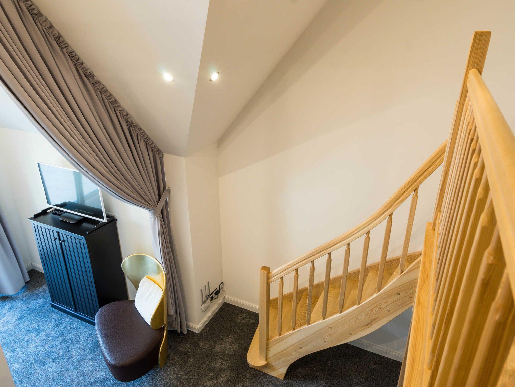 Über eine breite, offene Treppe gelangen Sie zum Obergeschoss mit zwei Schlafzimmern. Das moderne Duschbad rundet das Wohfühlgefühl ab.