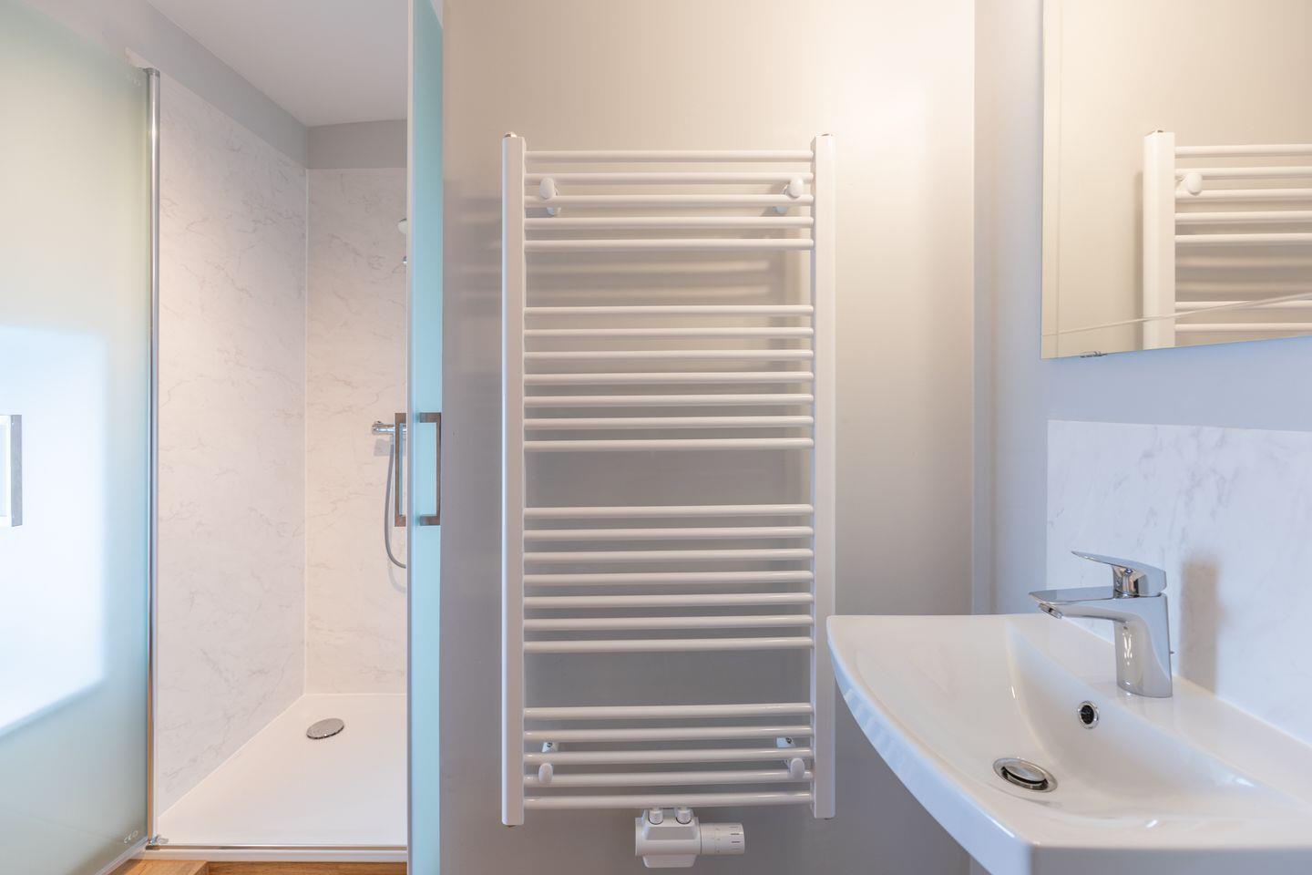 Die Ferienwohnung im 1. Obergeschoss eignet sich perfekt für Pärchen oder Alleinreisende: Ein Schlafzimmer mit einem bequemen Doppelbett (180 × 200) und eine komfortable und gut ausgestattete Einbauküche mit Ceranfeld, Backofen, Geschirrspülmaschine, Mikrowelle, Kaffeemaschine (Filtergröße 4). Der Wohnbereich verfügt über ein gemütliches Sofa und einen Flachbild-TV. Das moderne Badezimmer ist mit einer ebenerdigen Dusche, WC und Waschbecken eingerichtet.