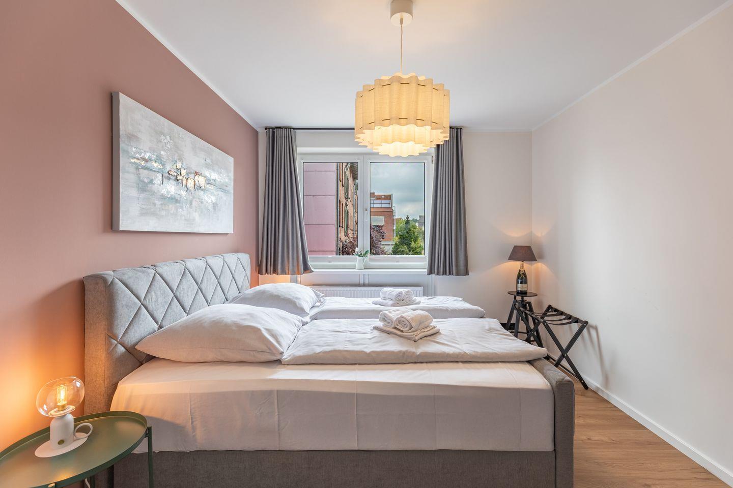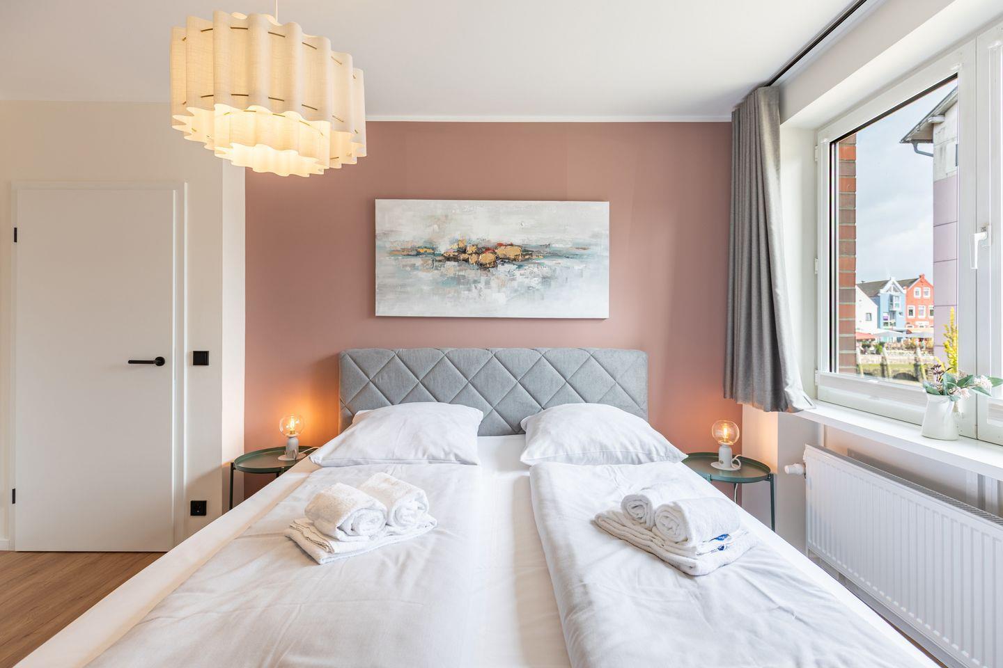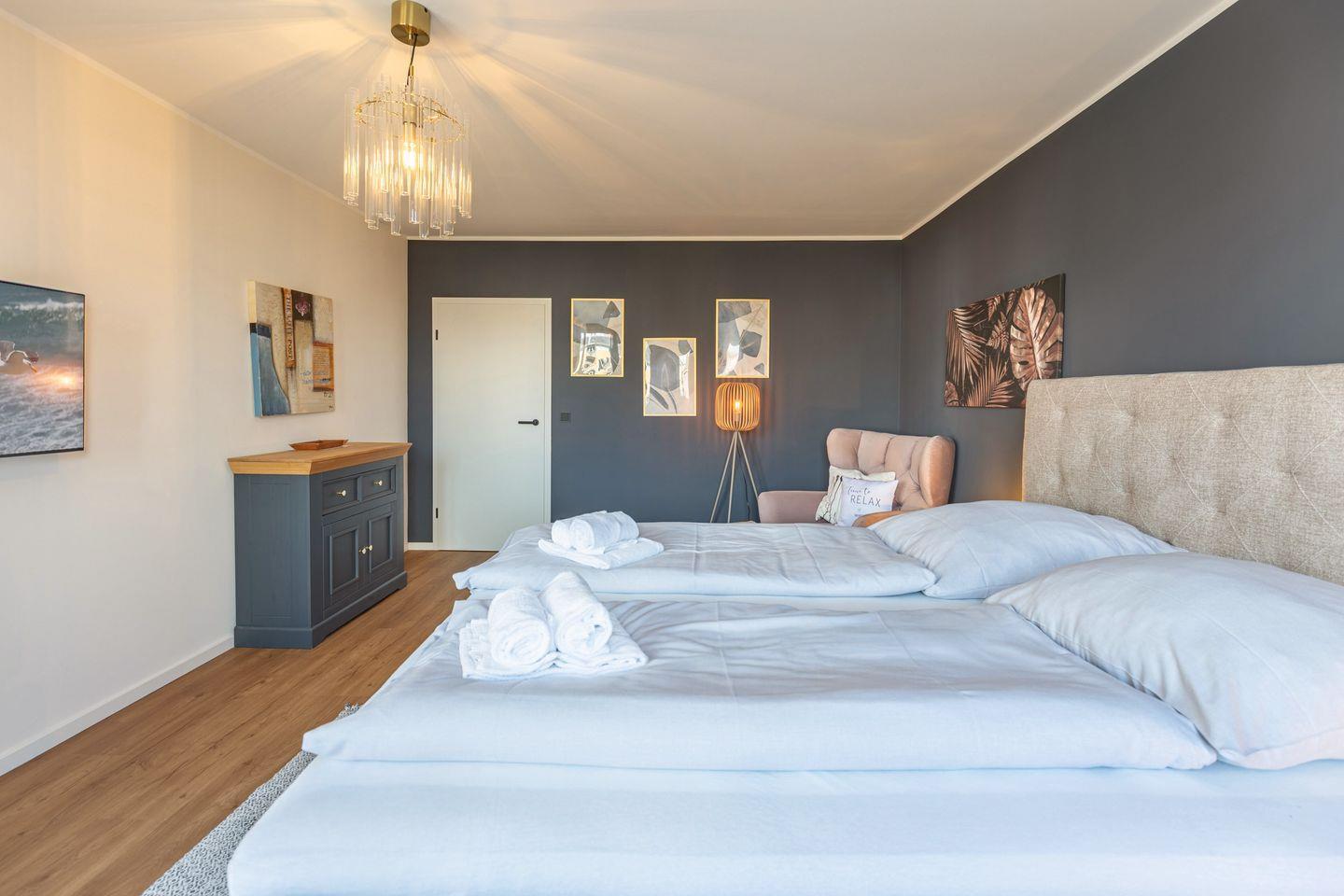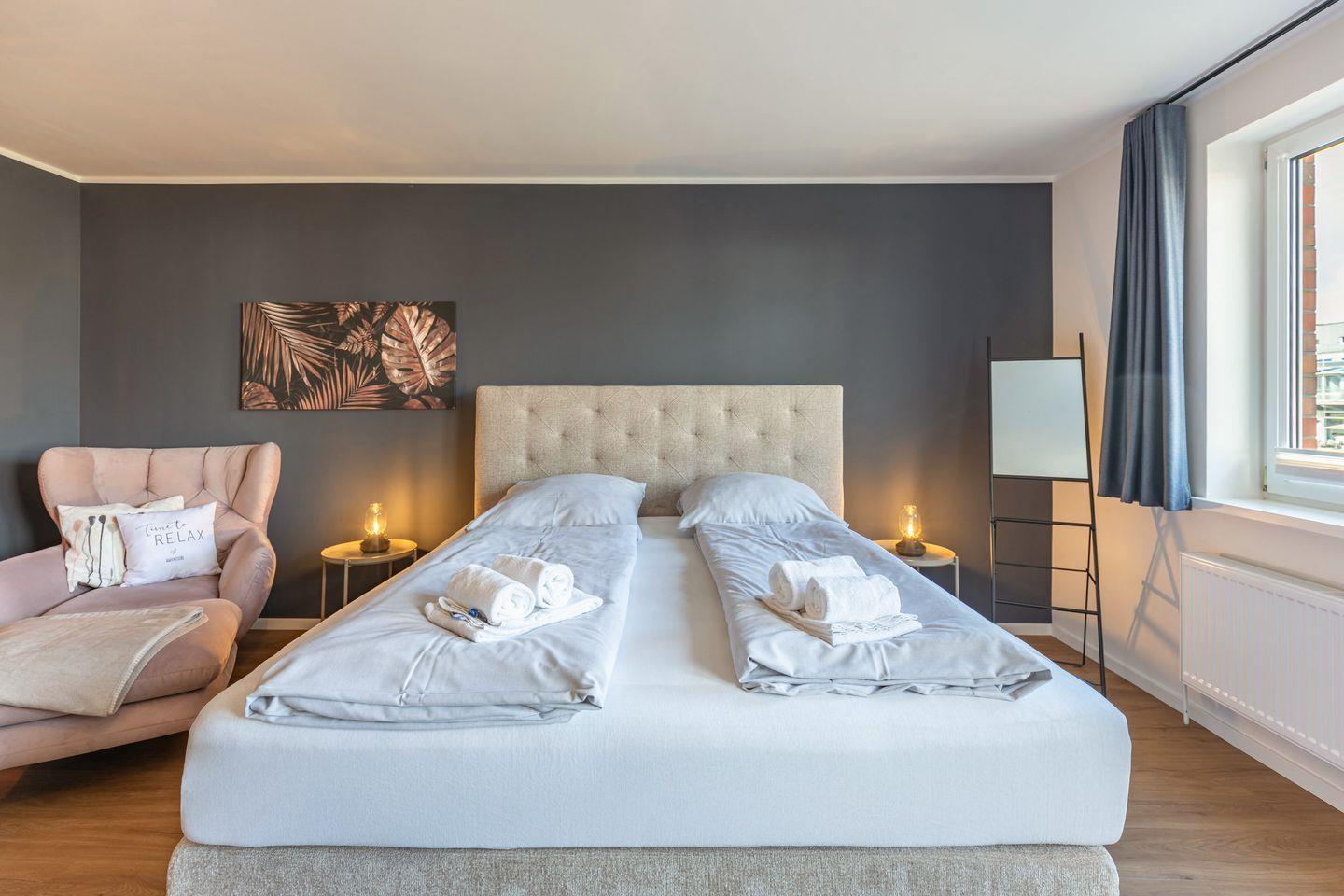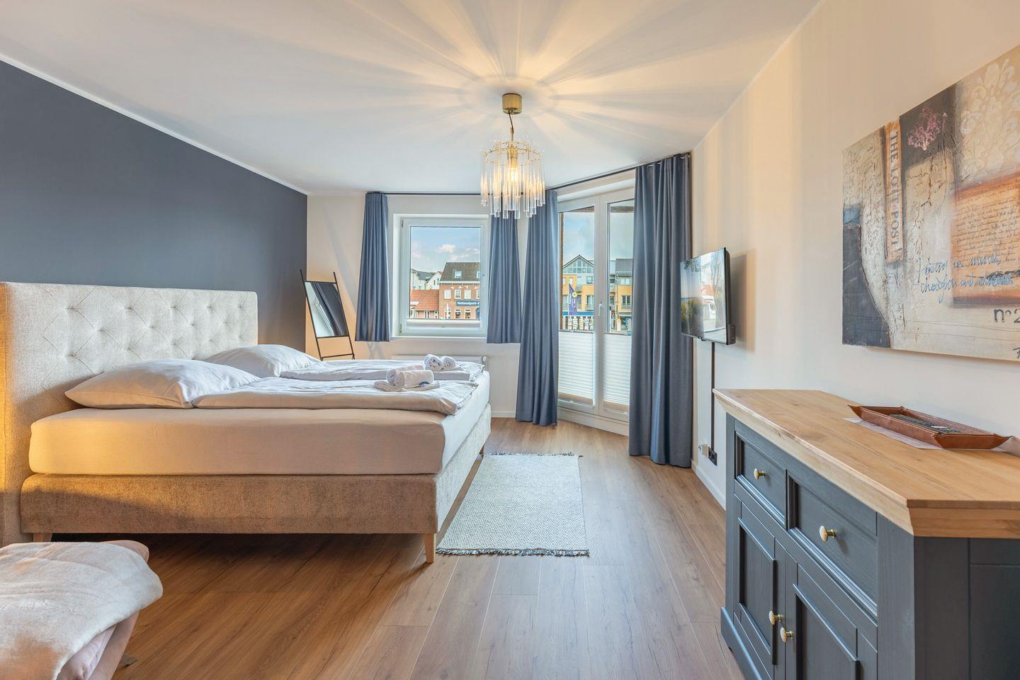 Das erste Schlafzimmer ist großzügig geschnitten und stilvoll eingerichtet. Der Raum ist in ruhigen, abgestimmten Farben gehalten und schafft mit seiner modernen Gestaltung eine entspannte Atmosphäre. Mittelpunkt ist das große Boxspringbett (180 x 200 cm) mit gepolstertem Kopfteil, das für erholsamen Schlaf sorgt. Ein gemütlicher Sessel mit Hocker lädt zum Lesen oder Ausruhen ein, während der Flachbildfernseher an der Wand für Unterhaltung sorgt. Auch vom Schlafzimmer aus haben Sie Zugang zum Balkon. Ideal um morgens bei geöffneten Fenstern frische Hafenluft zu genießen. Auch das zweite Schlafzimmer ist mit einem bequemen Boxspringbett (180 x 200 cm) ausgestattet und bietet eine angenehme, ruhige Atmosphäre. Ein kleiner Sessel sowie ein Kleiderschrank stehen zur Verfügung und ergänzen die praktische Ausstattung.