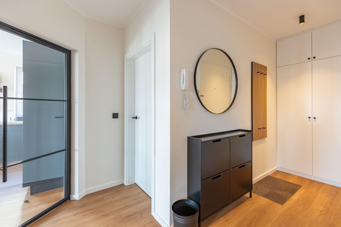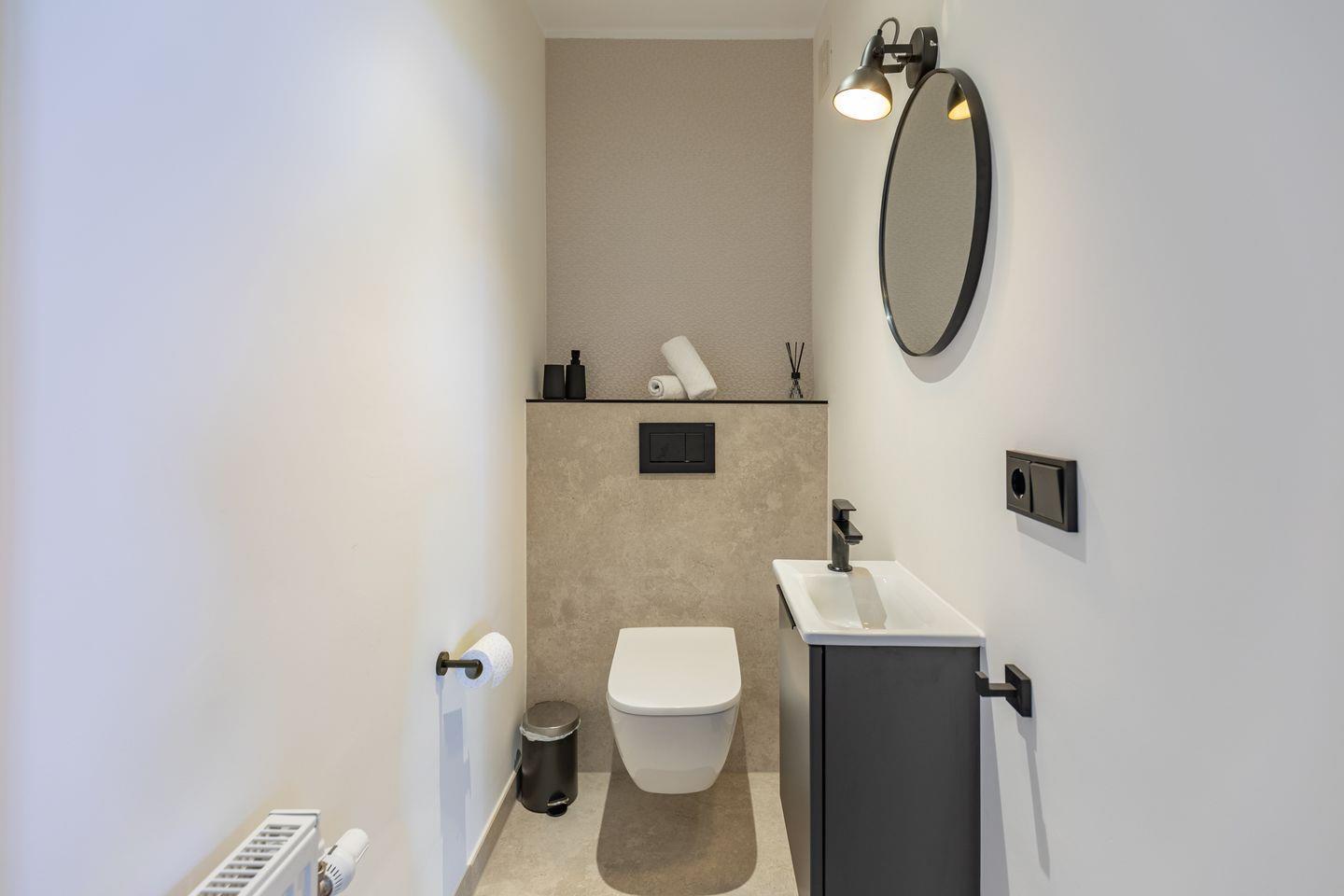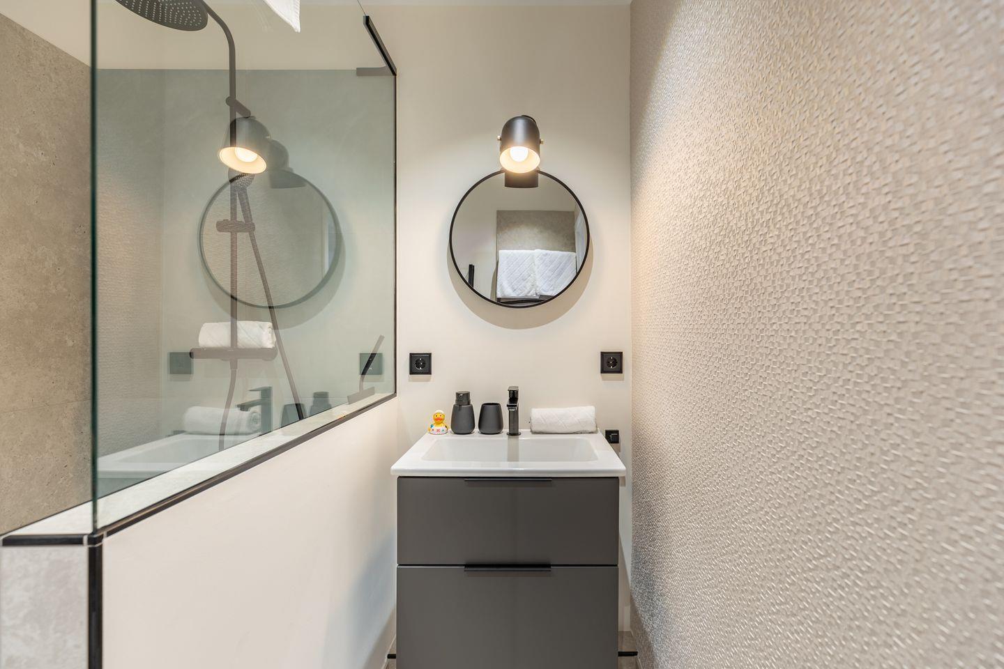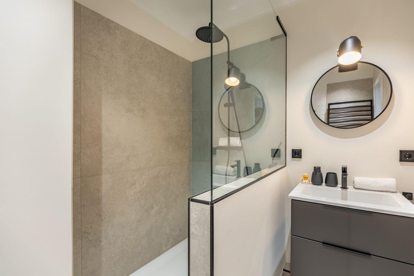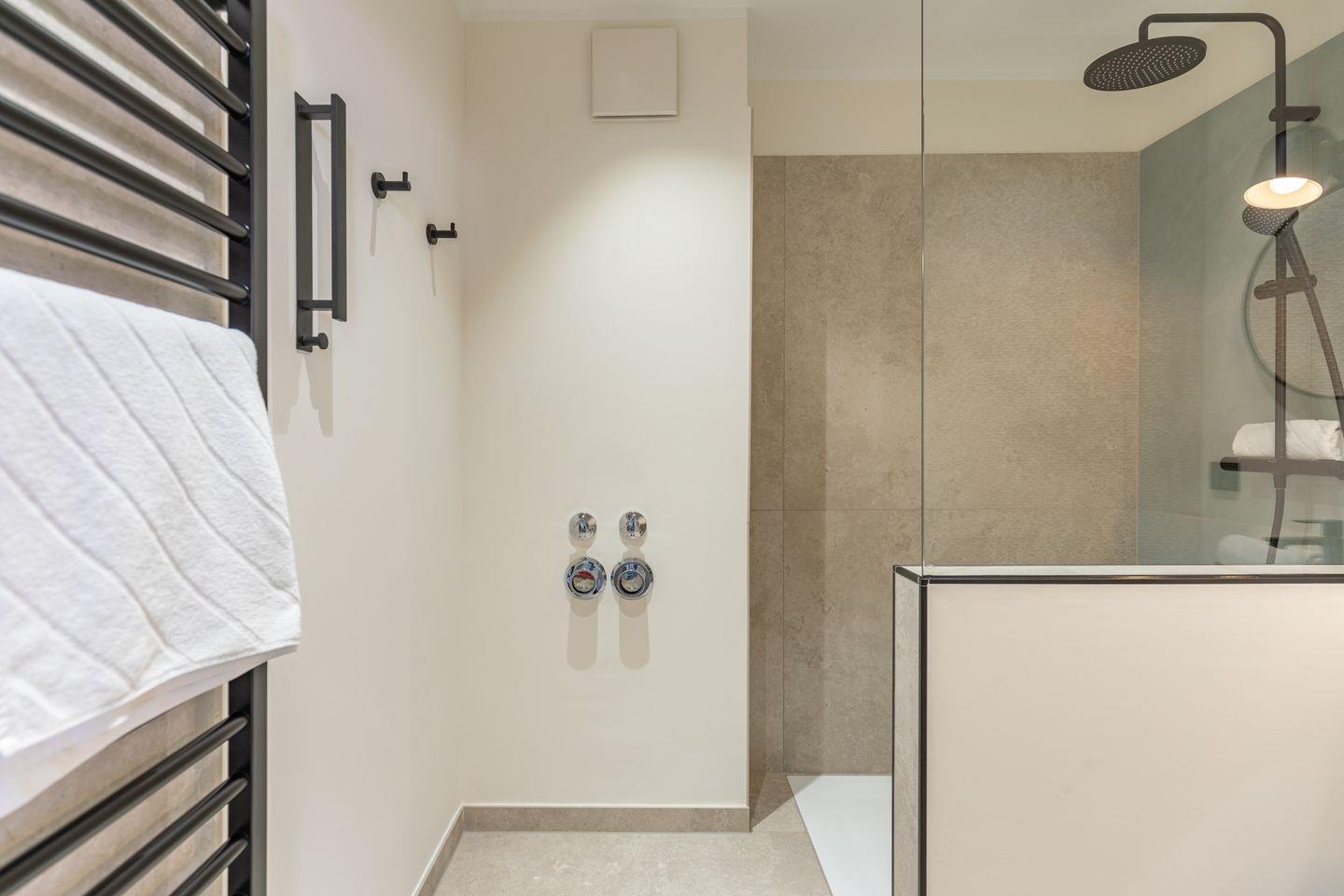 Das Badezimmer ist modern ausgestattet und in hellen, zeitlosen Farben gehalten. Hochwertige Fliesen, eine strukturierte Wandgestaltung und schwarze Akzente bei Armaturen und Accessoires verleihen dem Raum ein stimmiges und klares Erscheinungsbild. Die großzügige Dusche ist mit einer Regenbrause und zusätzlicher Handbrause ausgestattet und durch eine Glasabtrennung elegant vom restlichen Bereich getrennt. Ein Handtuchheizkörper rundet die funktionale Ausstattung ab. In einem separaten und gleich hochwertig gestalteten Raum, befindet sich, getrennt vom Badezimmer, die Toilette mit Waschbecken.