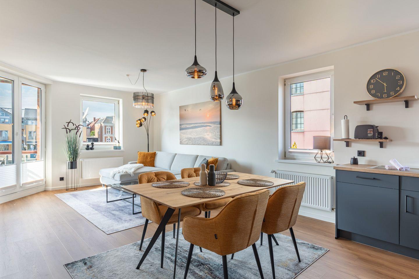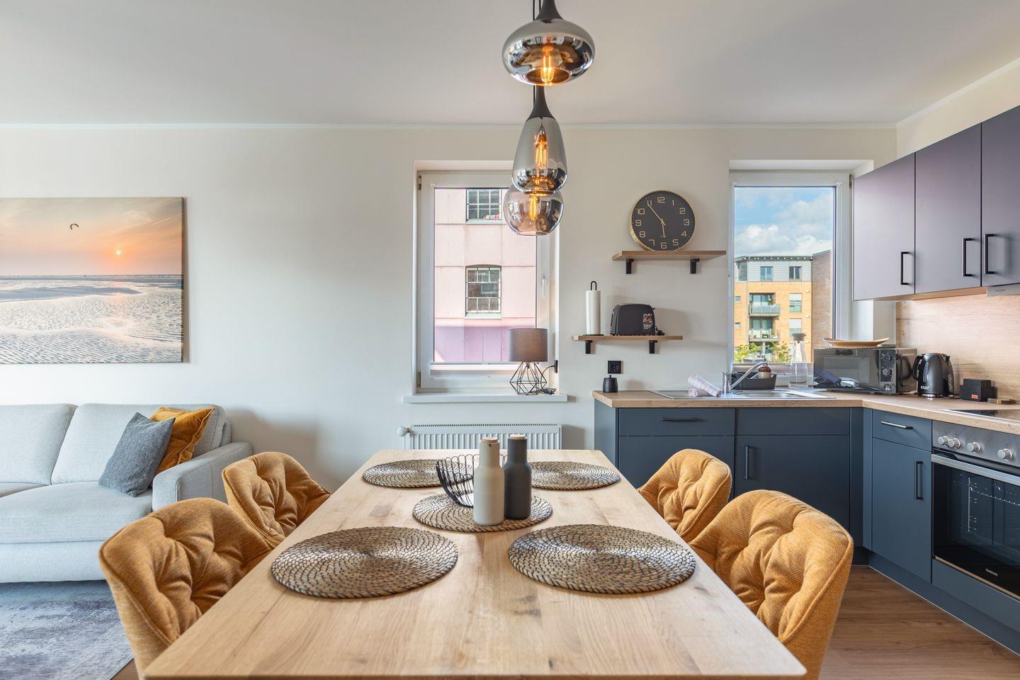 Die Wohnung liegt im 1. Obergeschoss, wurde im Juli 2025 vollständig saniert und neu eingerichtet und bietet auf rund 80 Quadratmetern ausreichend Platz für bis zu vier Personen. Der offene Wohn-, Ess- und Küchenbereich bildet das Herzstück der Ferienwohnung und überzeugt mit einer modernen und zugleich wohnlichen Gestaltung. Der Wohnbereich ist mit einem komfortablen Ecksofa ausgestattet, das zum Entspannen einlädt, sei es nach einem Tag an der frischen Nordseeluft oder für einen gemütlichen Abend mit einem Buch oder Film. Große Fenster lassen viel Tageslicht herein und schaffen eine freundliche Atmosphäre. Direkt angrenzend befindet sich der Essplatz mit einem massivem Holztisch und vier bequemen Stühlen, ideal für gemeinsame Mahlzeiten oder Spieleabende. Die angrenzende Küche ist vollständig ausgestattet und fügt sich optisch stimmig in das Raumkonzept ein. Sie bietet neben einem modernen Cerankochfeld, Backofen, Kühlschrank mit Gefrierfach und Geschirrspüler auch zahlreiche Kleingeräte wie Kaffeemaschine, Wasserkocher, Toaster und Mikrowelle. Ausreichend Arbeitsfläche und Stauraum sind ebenfalls vorhanden.