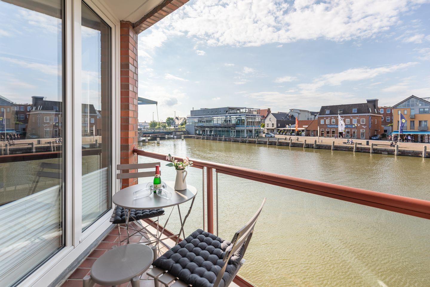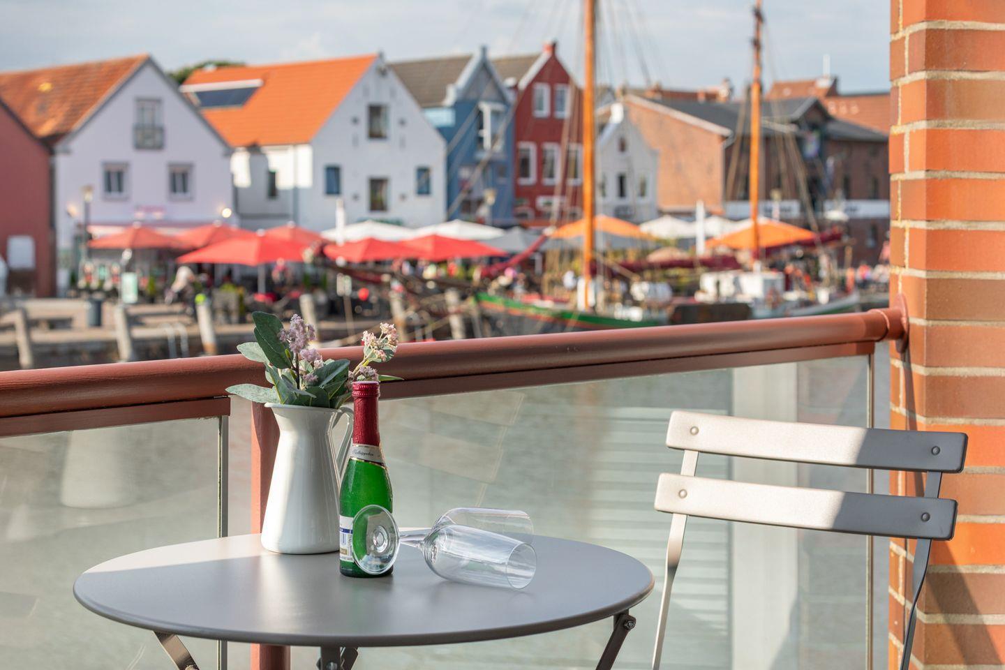 Direkt vom Wohnbereich aus gelangen Sie auf den überdachten Balkon, ein echtes Highlight dieser Ferienwohnung. Der Blick auf den Husumer Binnenhafen mit seinen historischen Segelschiffen, farbenfrohen Fassaden und der lebendigen Promenade ist beeindruckend und sorgt zu jeder Tageszeit für eine besondere Atmosphäre. Der Balkon ist mit einem kleinen Tisch und zwei Stühlen ausgestattet, ideal für ein Frühstück an der frischen Luft, ein Glas Wein am Abend oder einfach zum Beobachten des Treibens am Wasser.