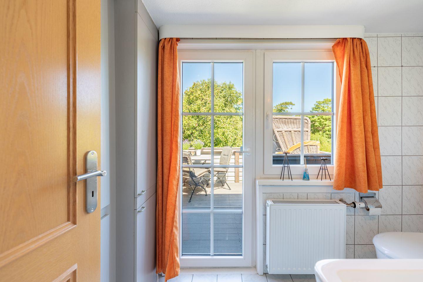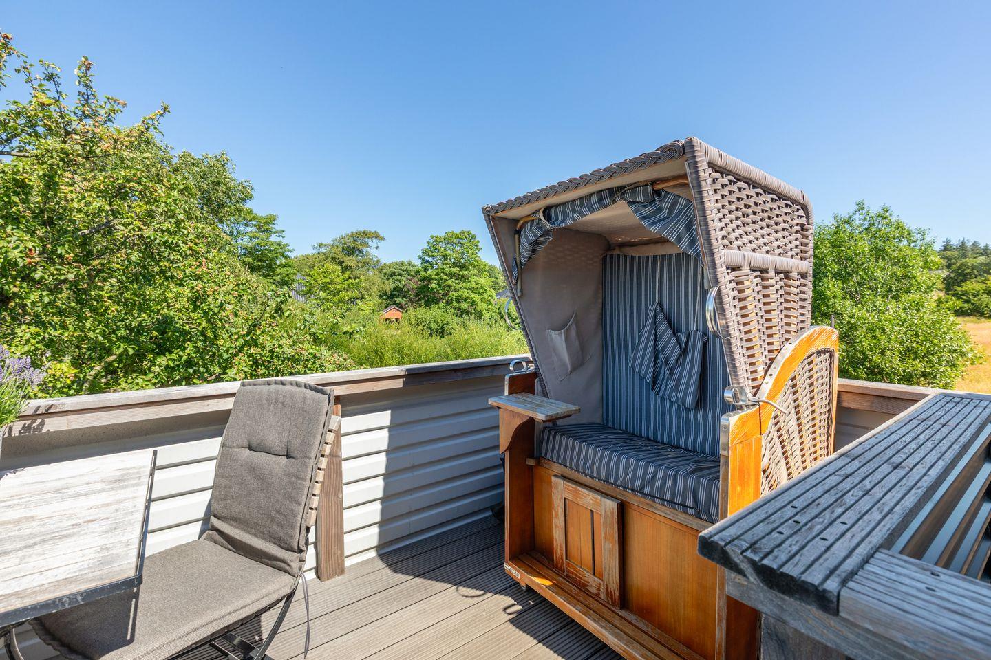 Das kompakte Duschbad mit WC rundet das Bild ab. Von hier aus gelangen Sie auf den möblierten Balkon mit Strandkorb, Bistrotisch und Stühlen.