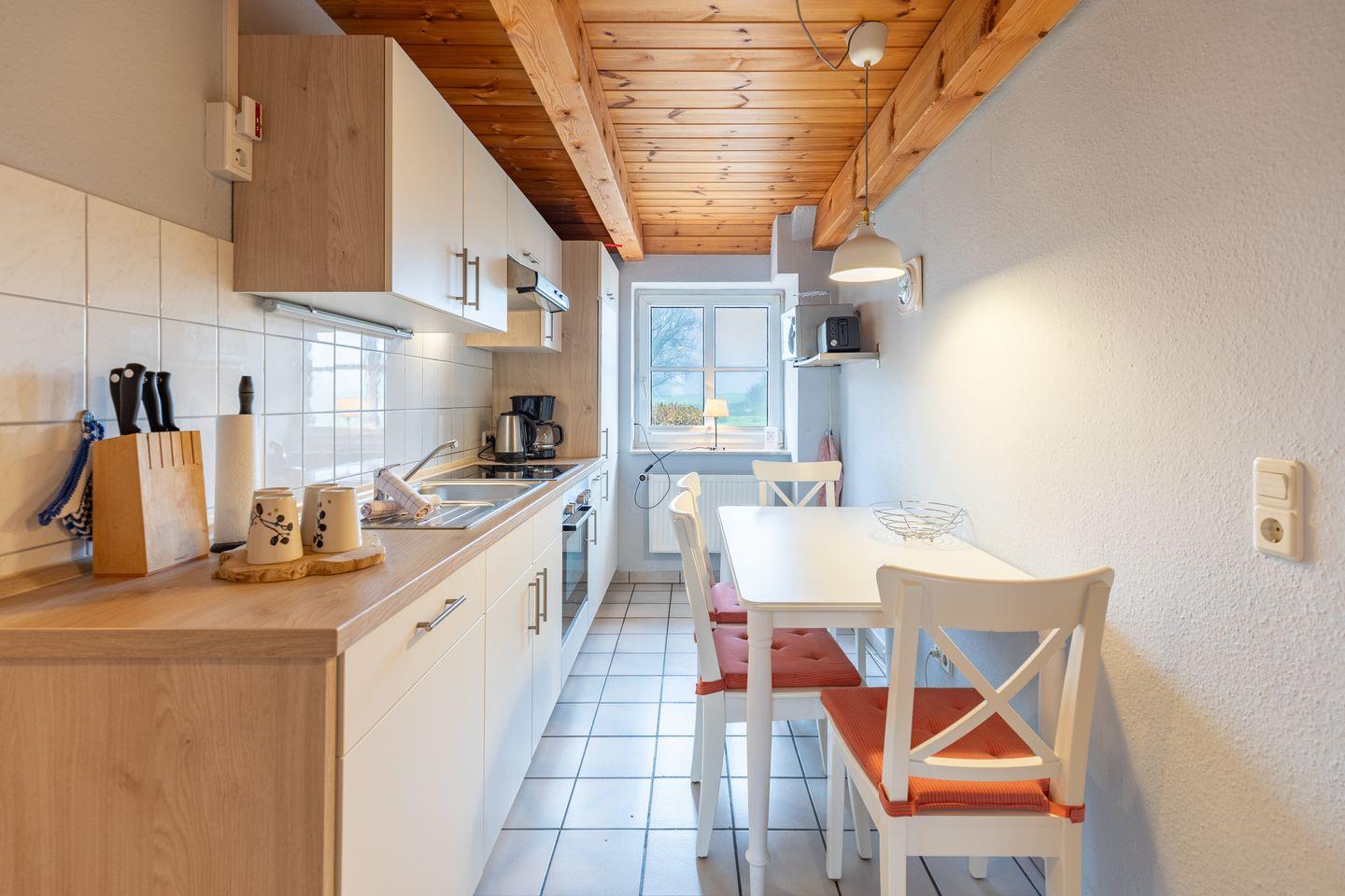 Die offene Küche mit Essbereich ist mit Backofen, 4-Plattenherd, Geschirrspüler, Toaster, Kaffeemaschine (Filtergröße 4), Wasserkocher uvm. ausgestattet und eignet sich somit hervorragend für Selbstversorger.