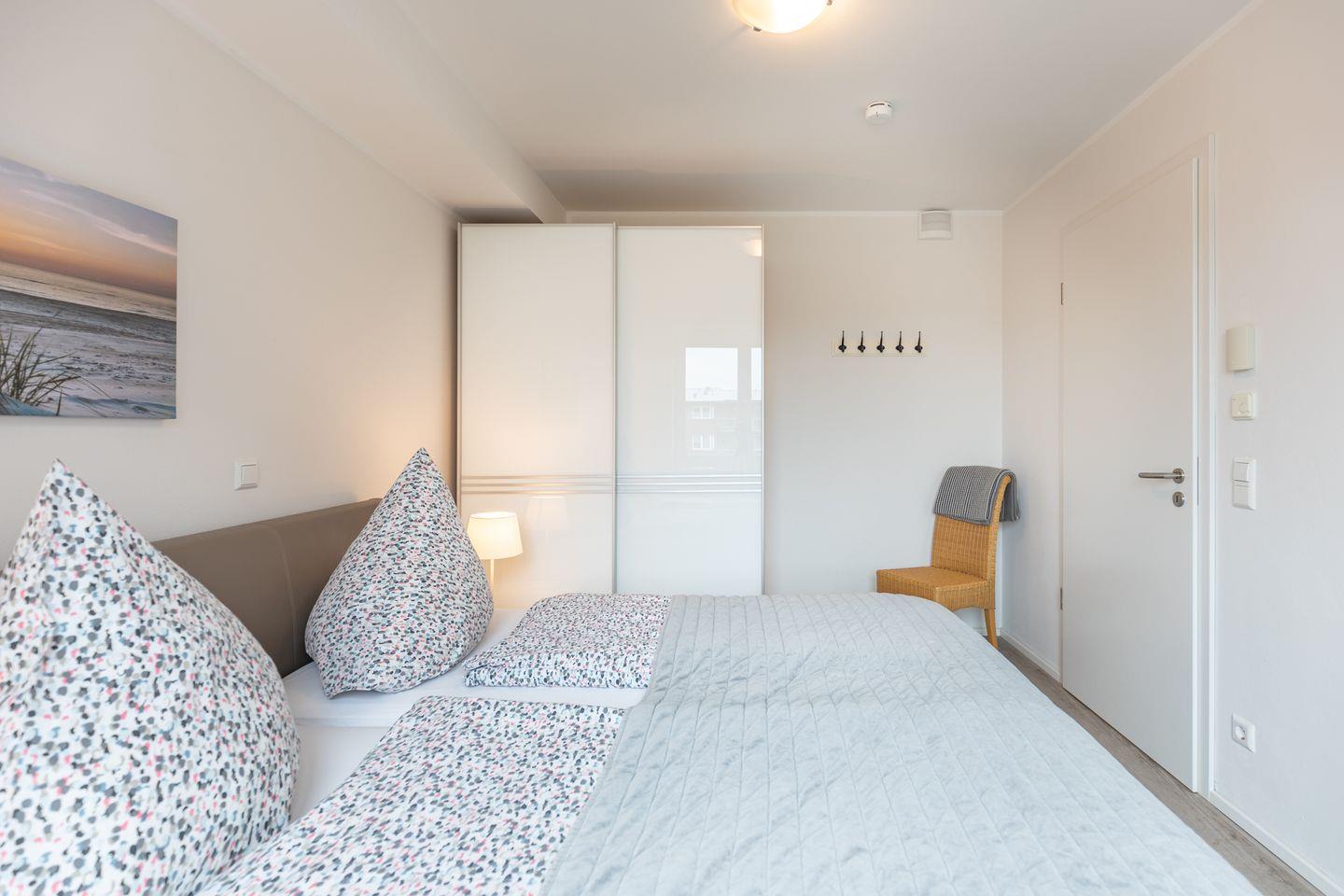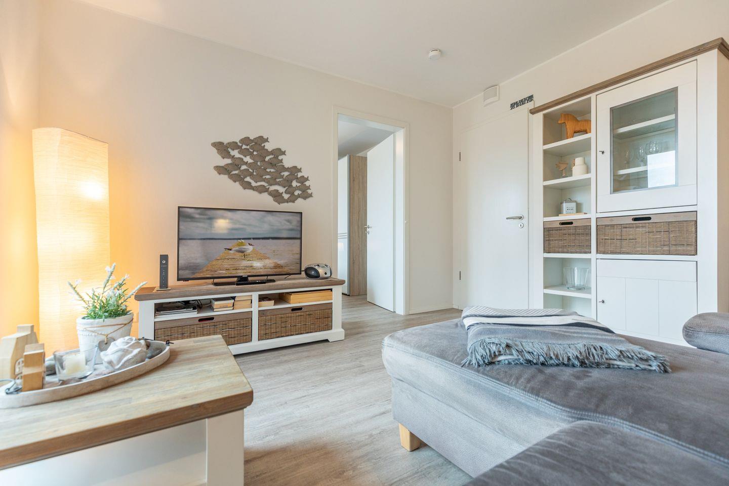 Die helle, lichtdurchflutete 56 qm² große Ferienwohnung liegt im 2. Stock und ist über einen Aufzug erreichbar. Sie bietet Ihnen: ein Schlafzimmer mit einem großen Doppelbett (180 × 200), eine gut ausgestattete Küche mit einem 4-Platten-Herd, Backofen, Geschirrspüler, einer Filterkaffeemaschine (Filtergröße 4), Kühlschrank mit Gefrierfach, einem Wasserkocher, Mixer und einem Toaster. Der Wohnbereich verfügt über ein L-Sofa, einen Flachbildfernseher und hat direkten Anschluss zur Küche und zum Essbereich, mit einem schönen Esstisch. Das Badezimmer verfügt über eine barrierefreie, bodenebene Dusche mit WC und Waschbecken. In einem Extraraum befinden sich eine Waschmaschine und ein Trockner zur Eigennutzung.