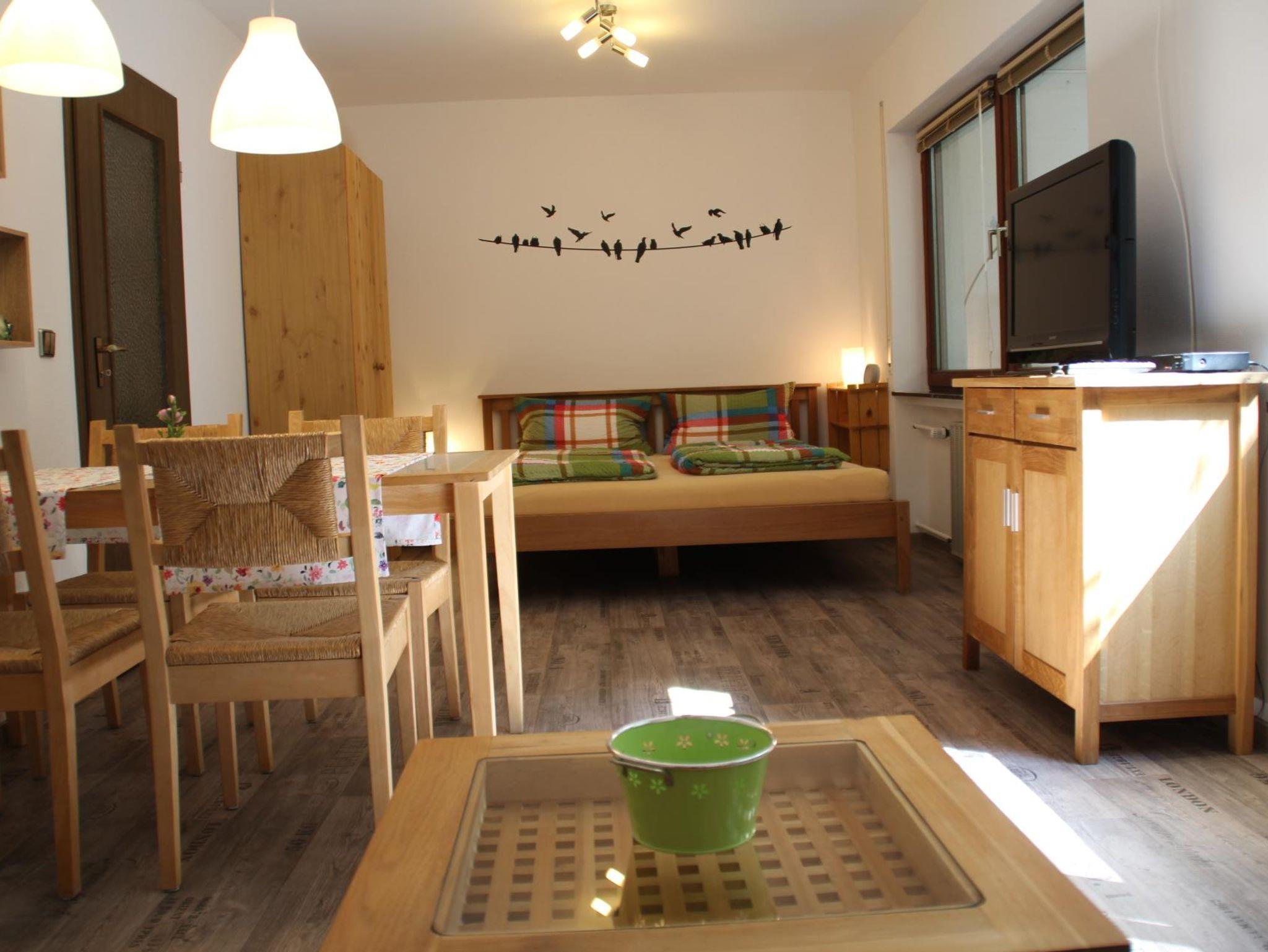 Im Wohn/Schlafzimmer befindet sich ein Doppelbett (180 x 200cm), die Couch ist ausziehbar und bietet Platz für einen Erwachsenen oder auch für zwei Kinder.