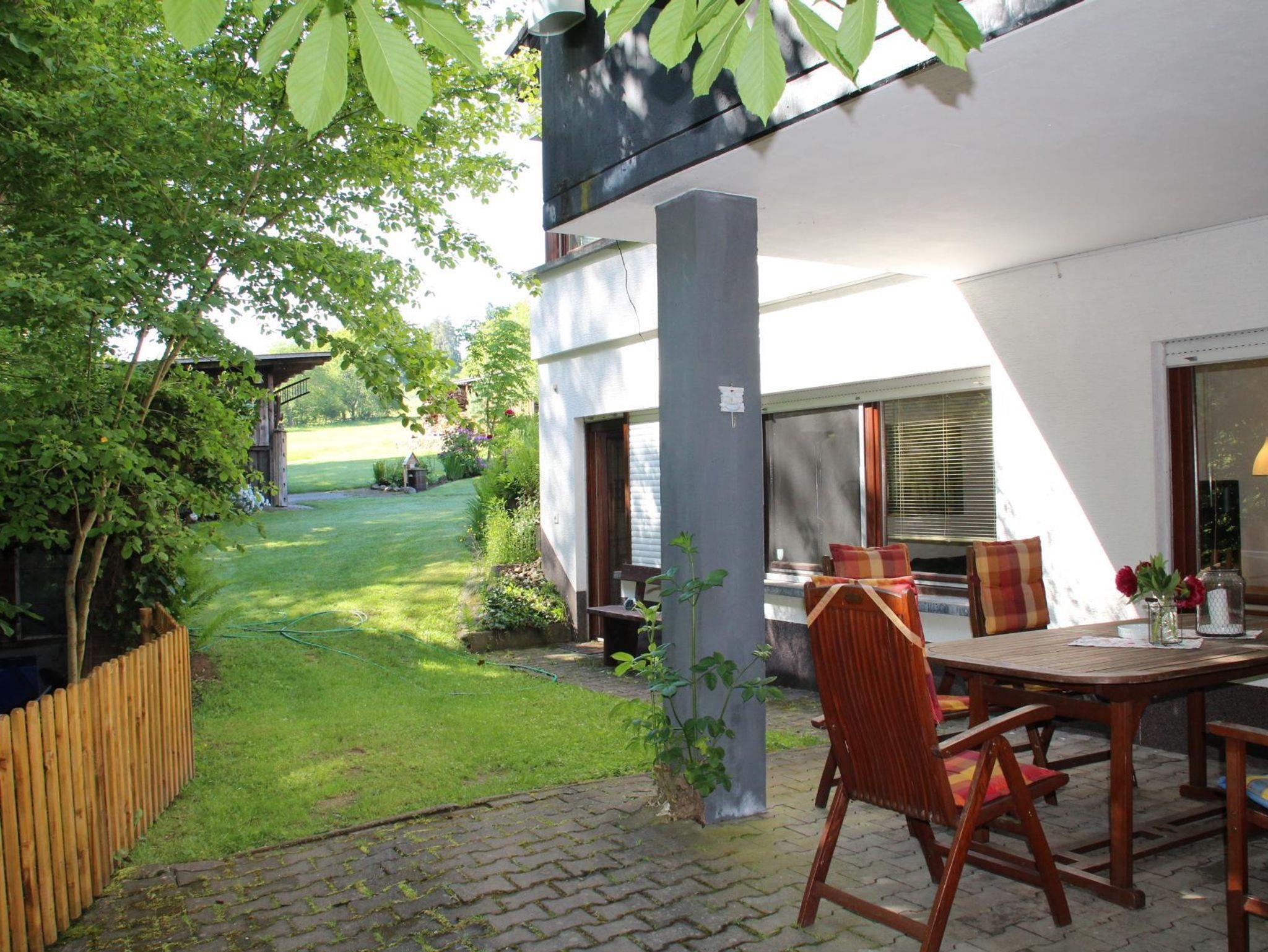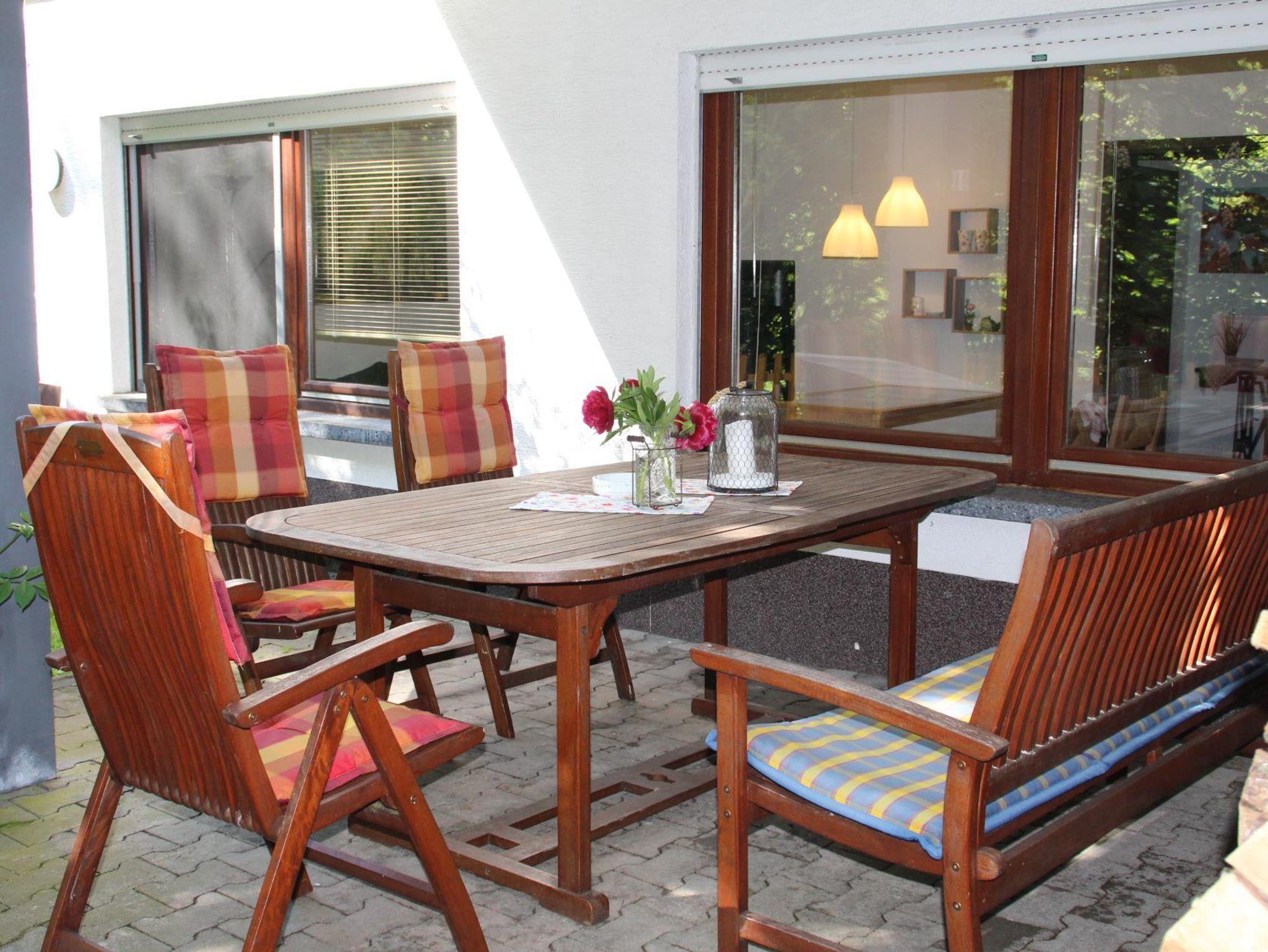 Zur Ferienwohnung gehört eine überdachte Terrasse mit Sitzgruppe und Liegestühlen sowie eine große Liegewiese.