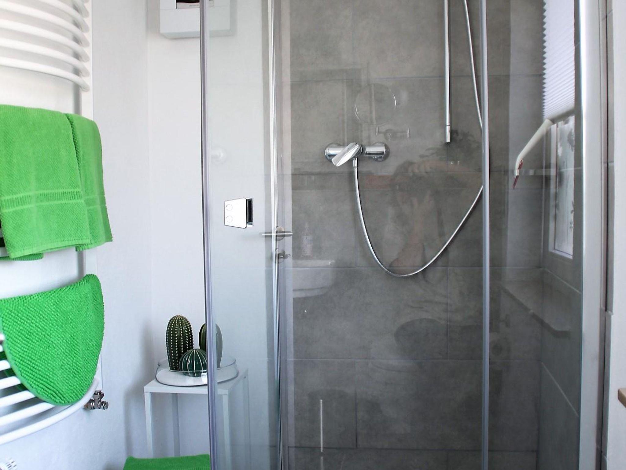 Es gibt zwei Badezimmer. Eins mit Dusche und WC, das zweite mit Badewanne und WC.