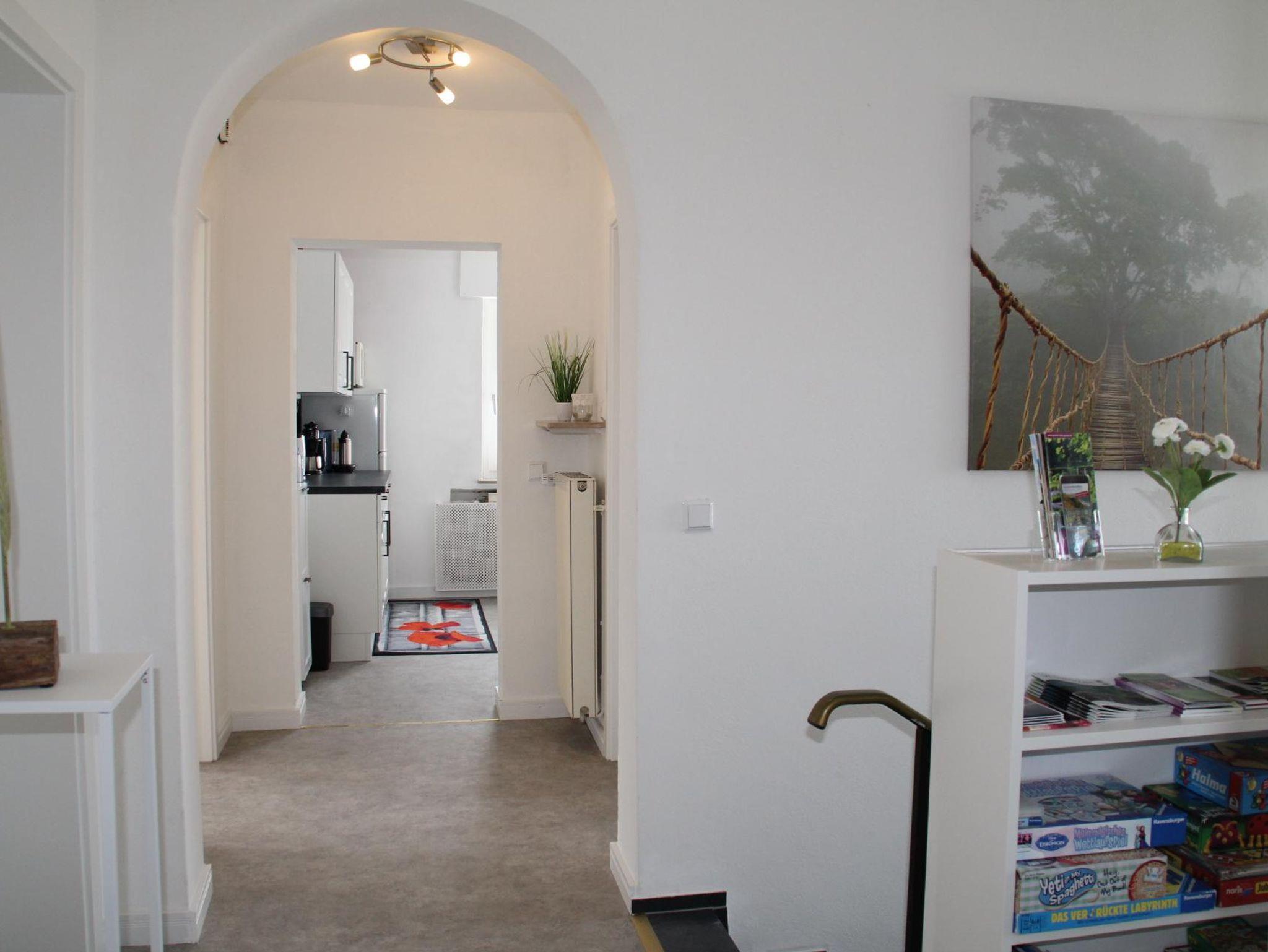 Im Hausflur lädt ein umfangreiches Angebot kleine und große Gäste zu Gesellschaftsspielen ein; die Bücher im Regal können gelesen und auch gern mit nach Hause genommen werden.