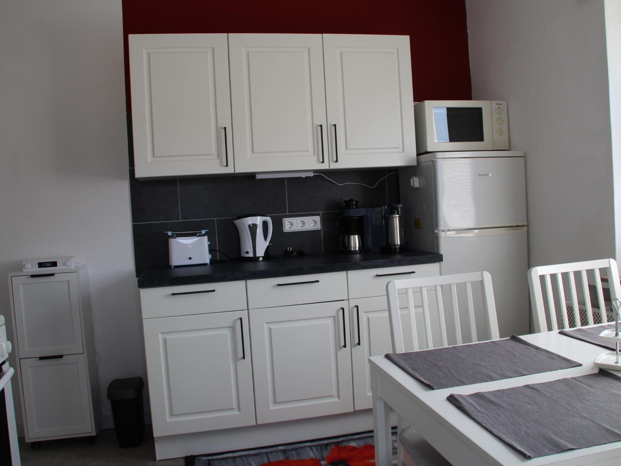 Die Küche ist ausgestattet mit Elektroherd und Backofen, Mikrowelle, Geschirrspüler, Kühlschrank mit Gefrierfach, Kaffeemaschine für Filterkaffee und Kaffeepads, Eierkocher, Toaster, Wasserkocher.